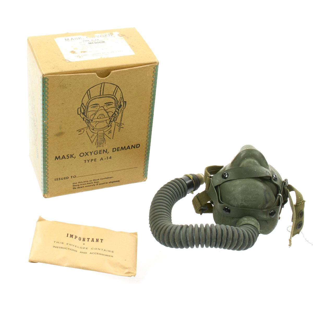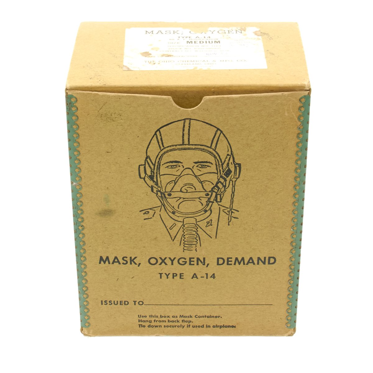 - WWII USAAF Oxygen Mask Type A-14 manufactured by the Ohio Chemical & Mfg. Co offered unissued mint condition with original cardboard box.