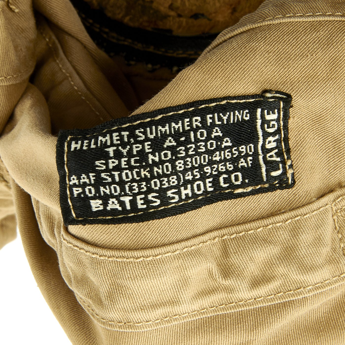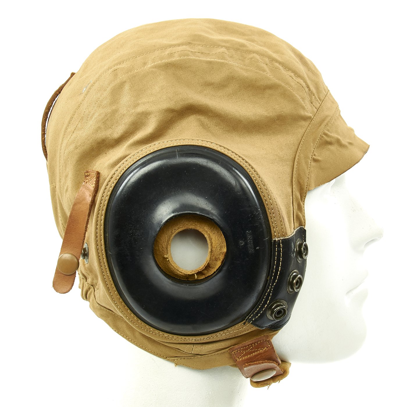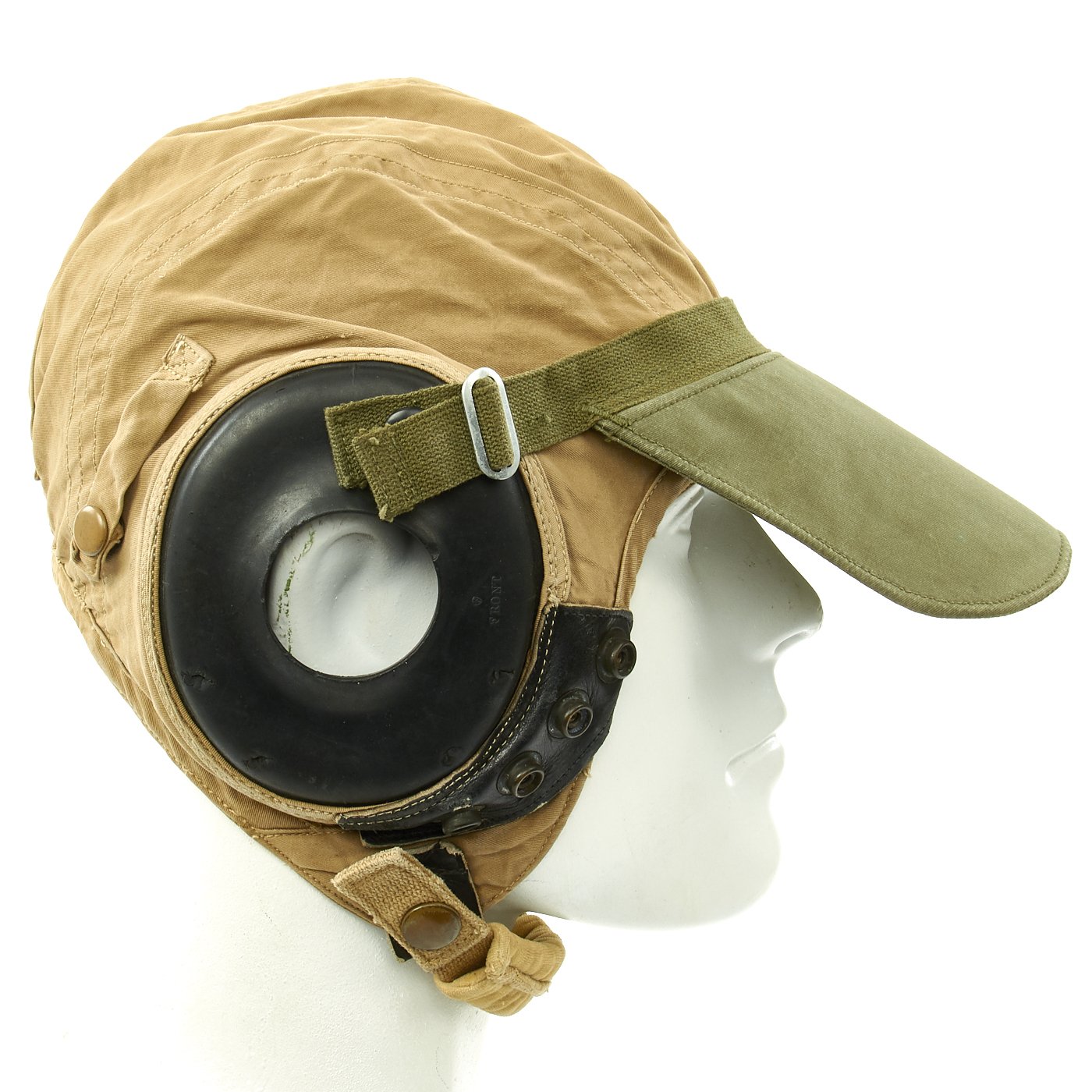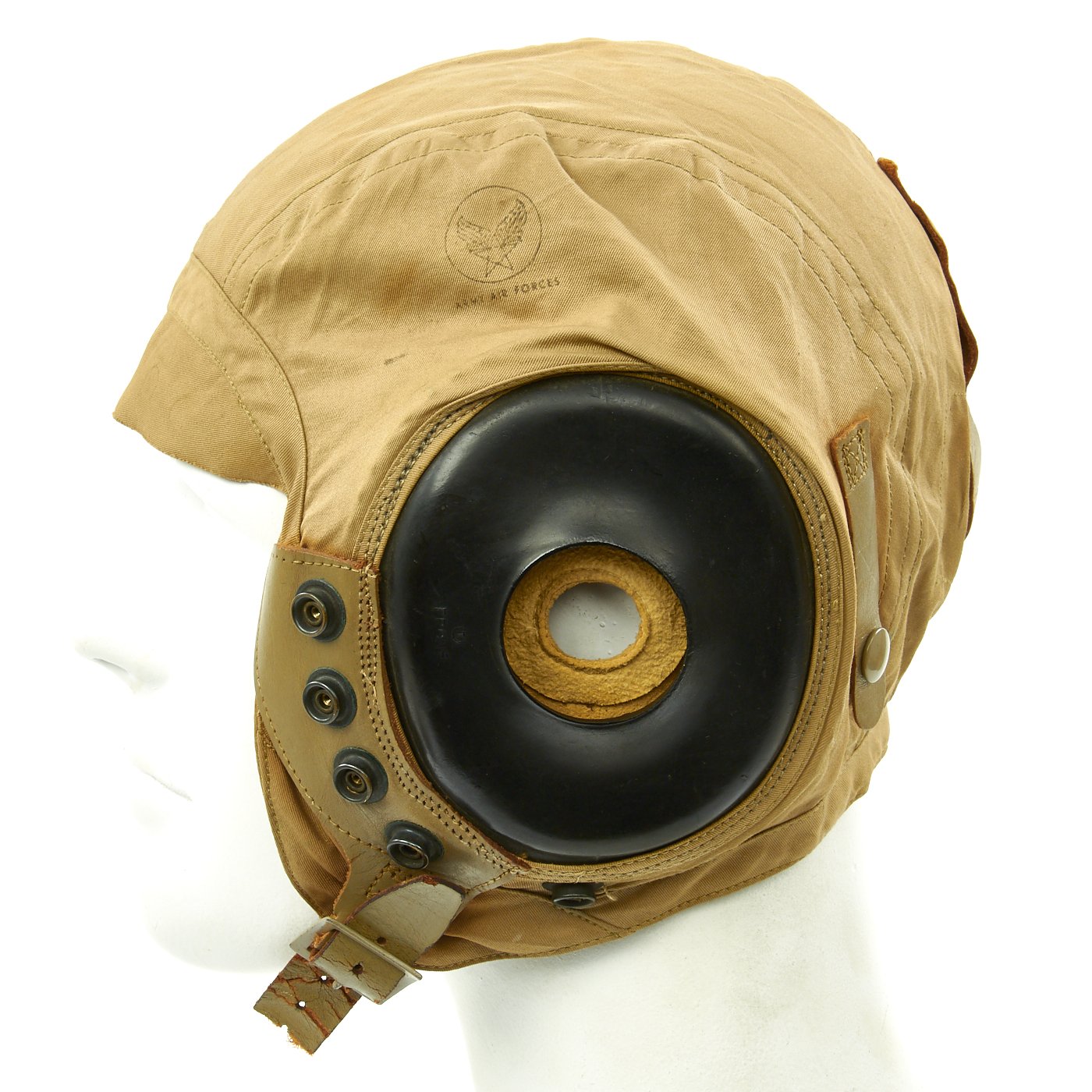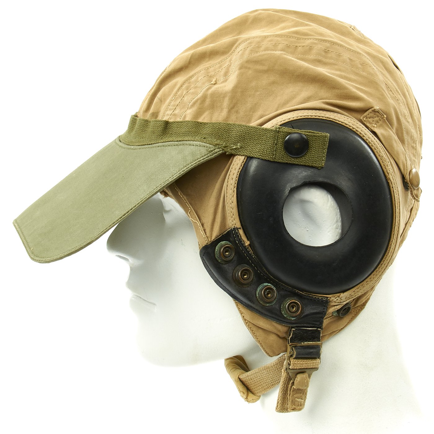 - WW2 USAAF A-10A summer flying helmet. Khaki cotton twill flying helmet with black rubber ear pieces. The inner forehead section and headphone cups are lined with chamois leather. The helmet has three leather loops on the rear to retain goggles. Two of these loops are secured with press studs. There is a buckle and snap fastening chin strap with velour padding. Brass press stud fittings for an oxygen mask are also present. Attached is a rare Army Air Forces Type A-1 detachable visor. Both in used but very good condition.