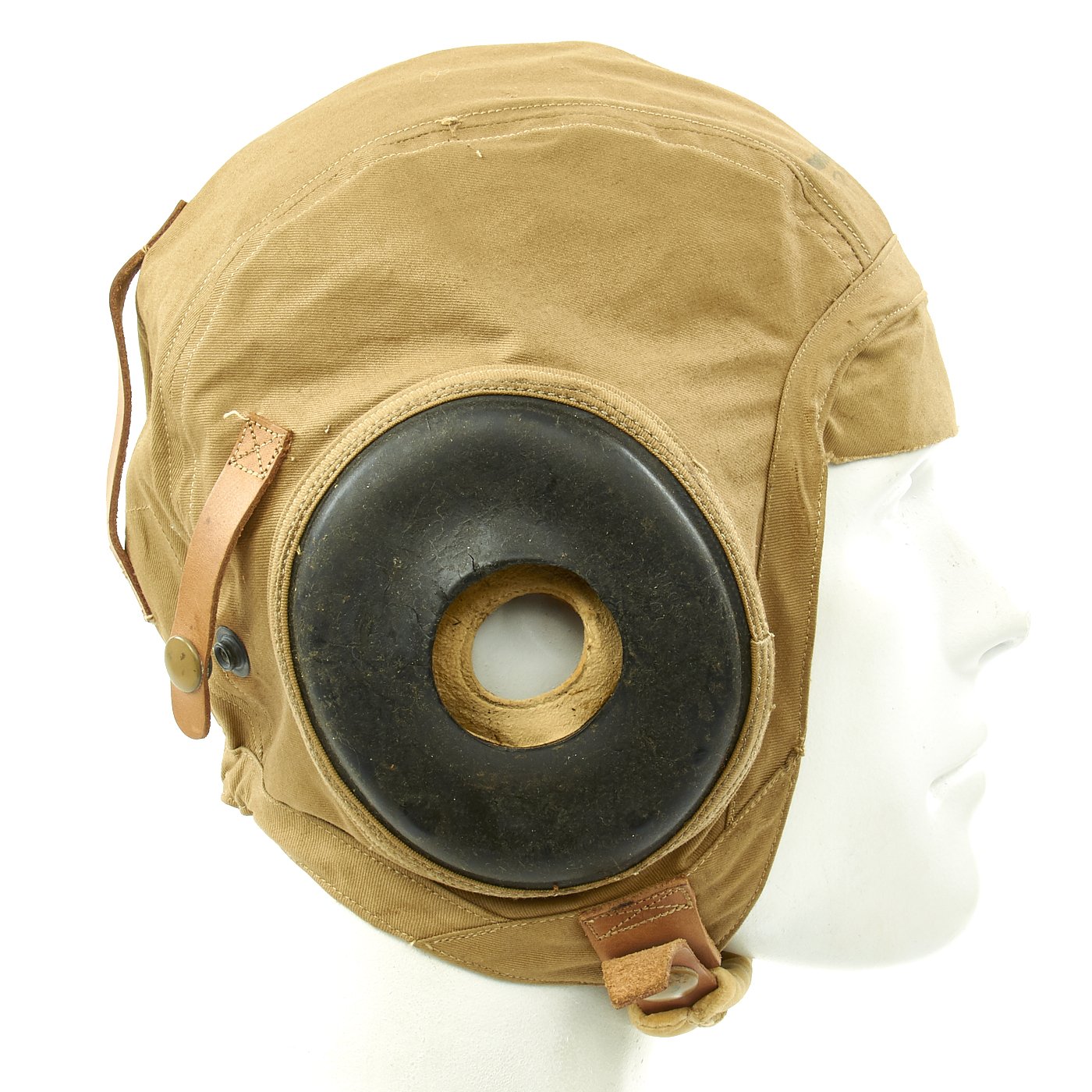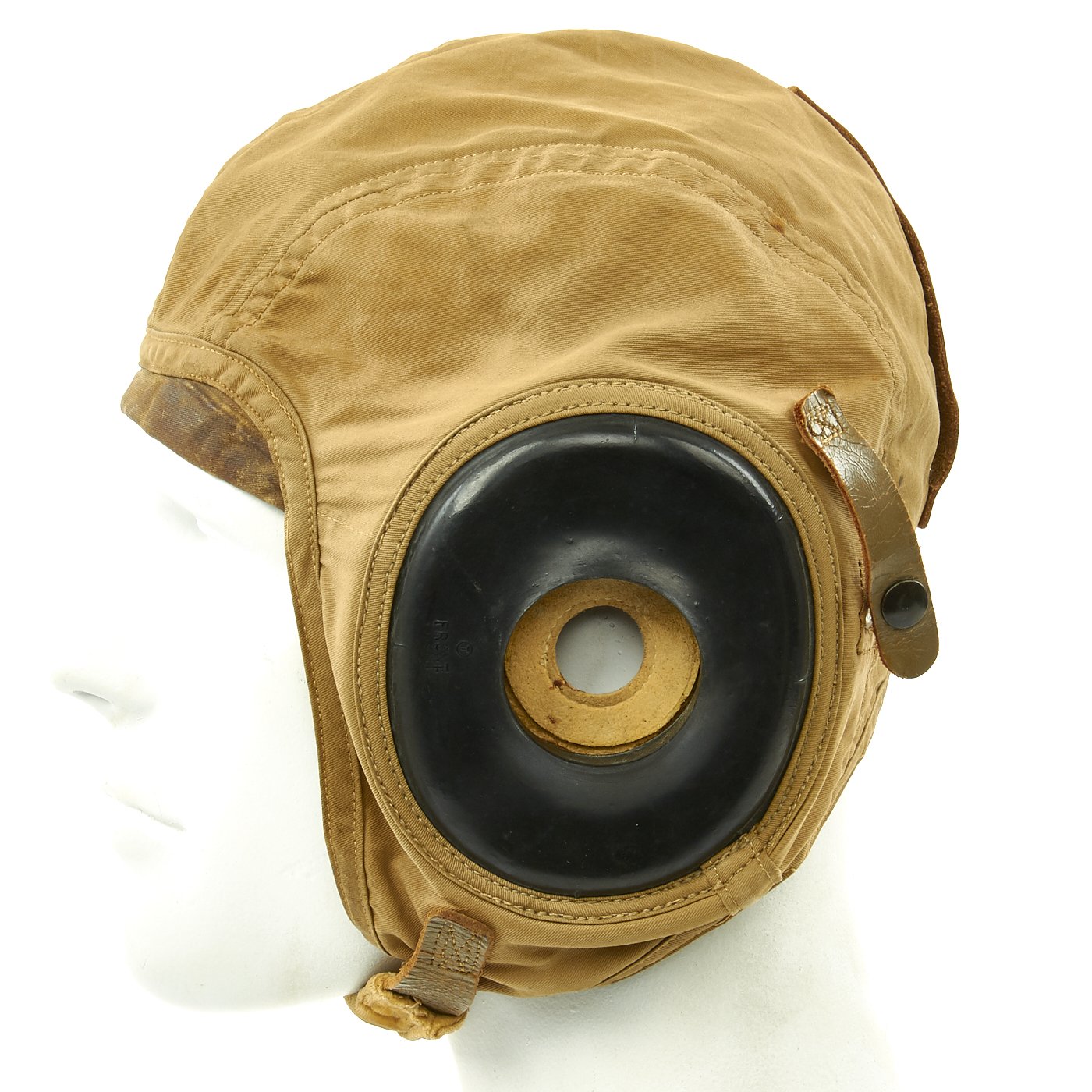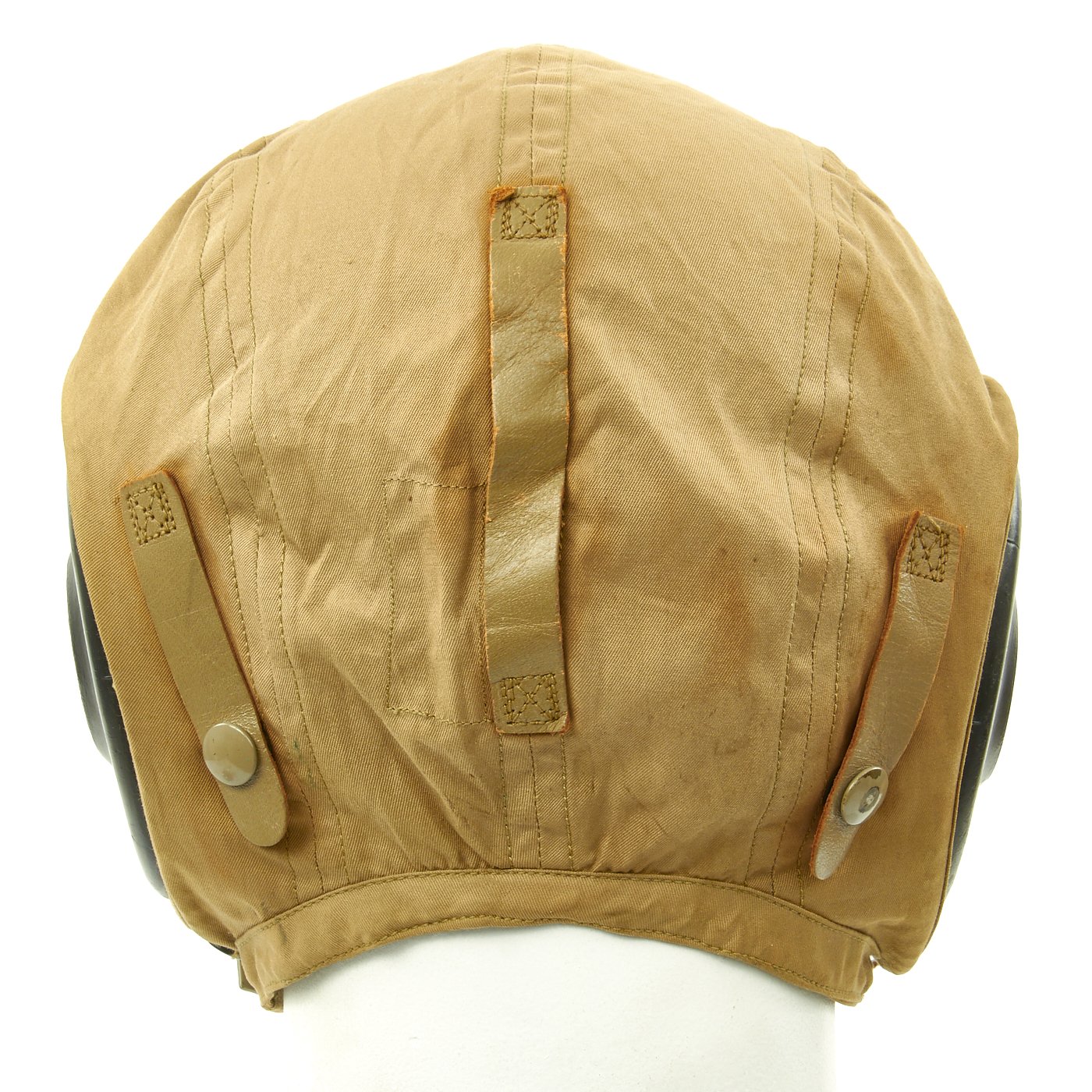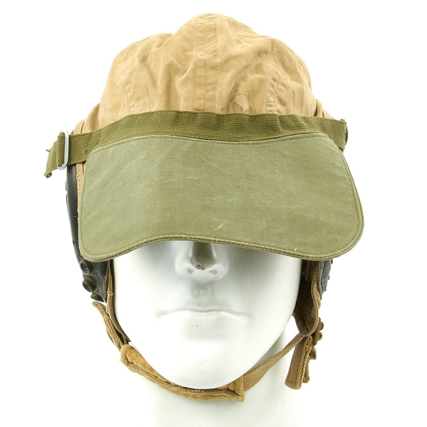 - WW2 USAAF A-10A summer flying helmet. Khaki cotton twill flying helmet with black rubber ear pieces. The inner forehead section and headphone cups are lined with chamois leather. The helmet has three leather loops on the rear to retain goggles. Two of these loops are secured with press studs. There is a buckle and snap fastening chin strap with velour padding. Brass press stud fittings for an oxygen mask are also present. Attached is a rare Army Air Forces Type A-1 detachable visor. Both in used but very good condition.