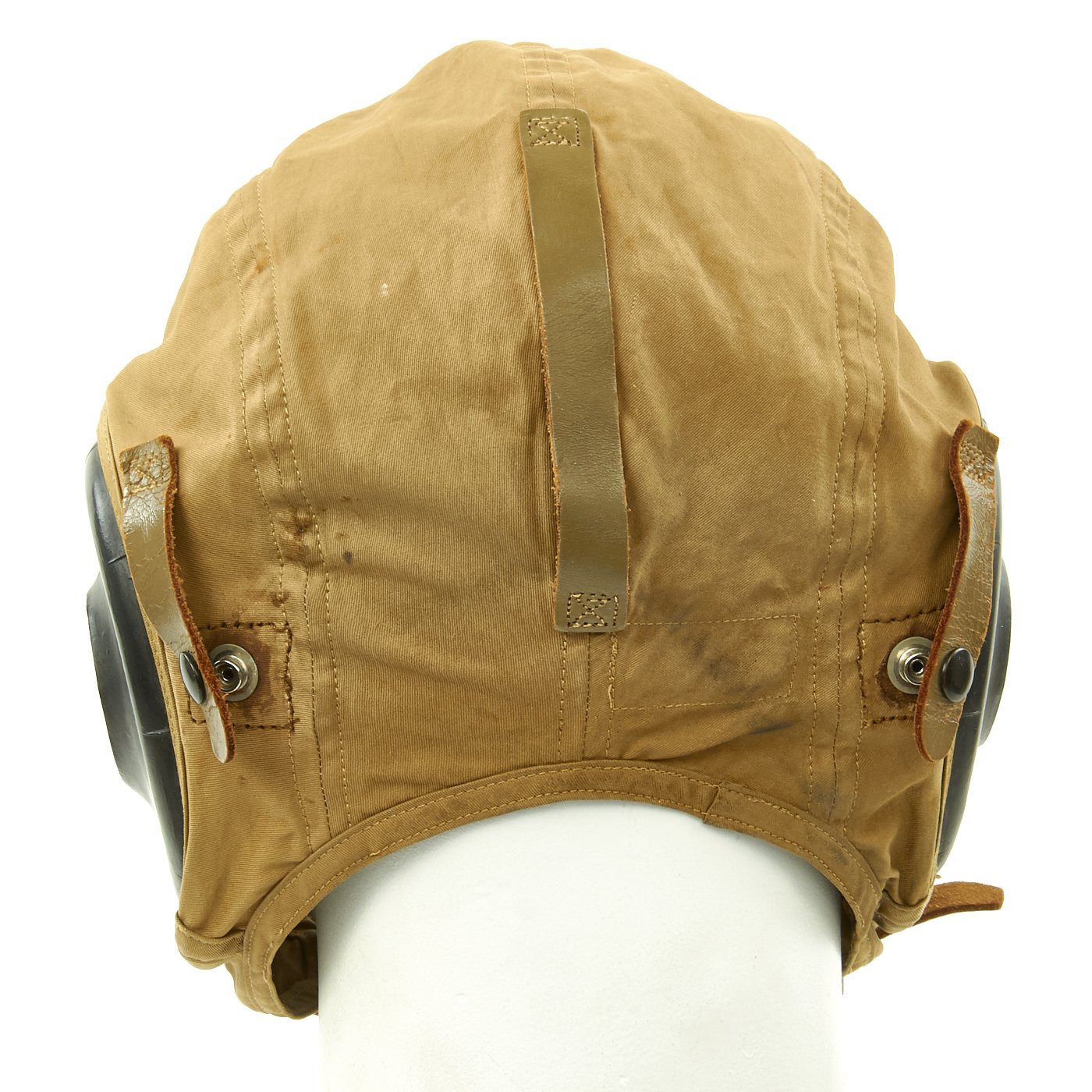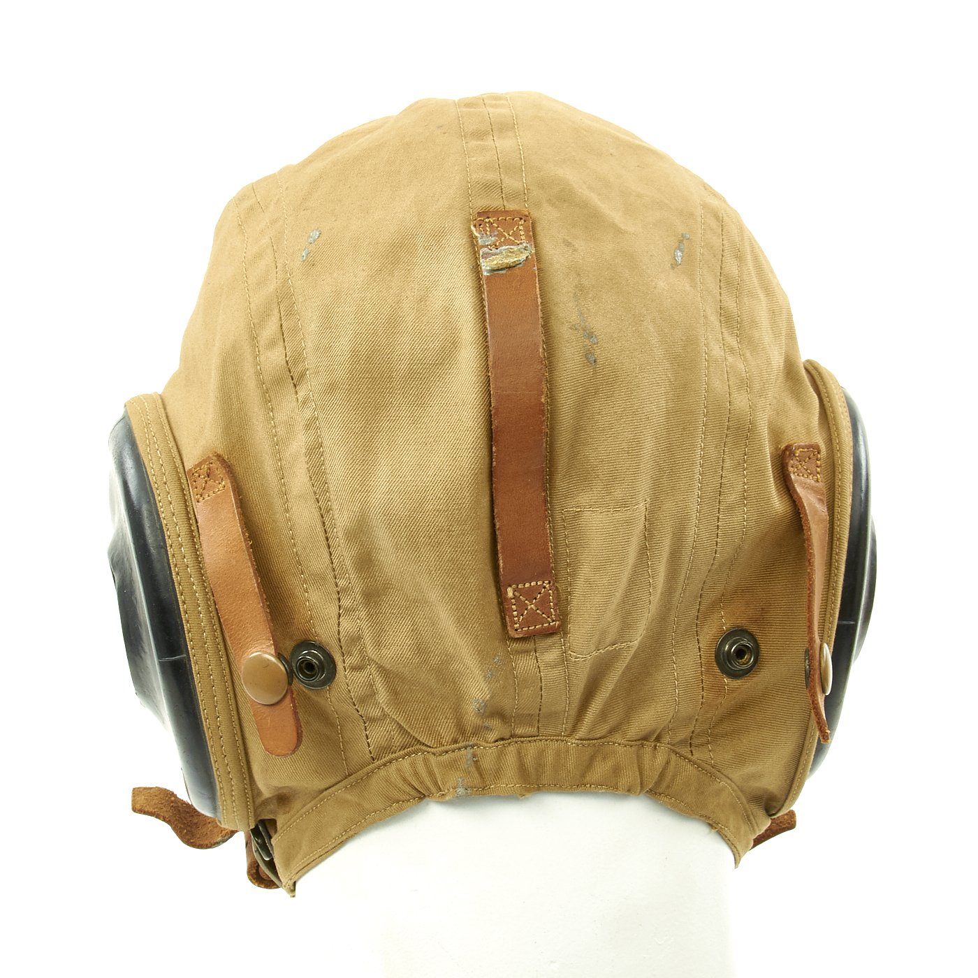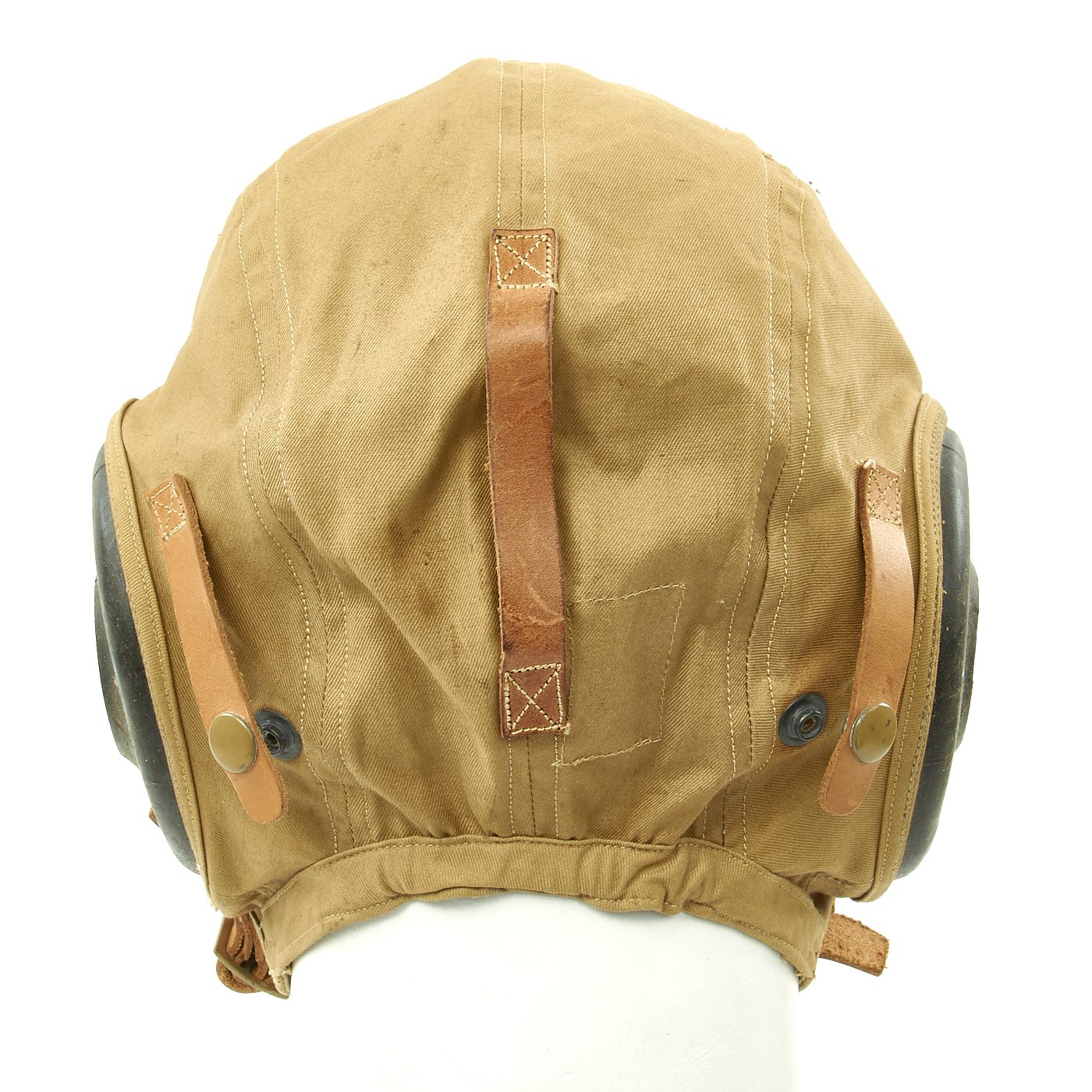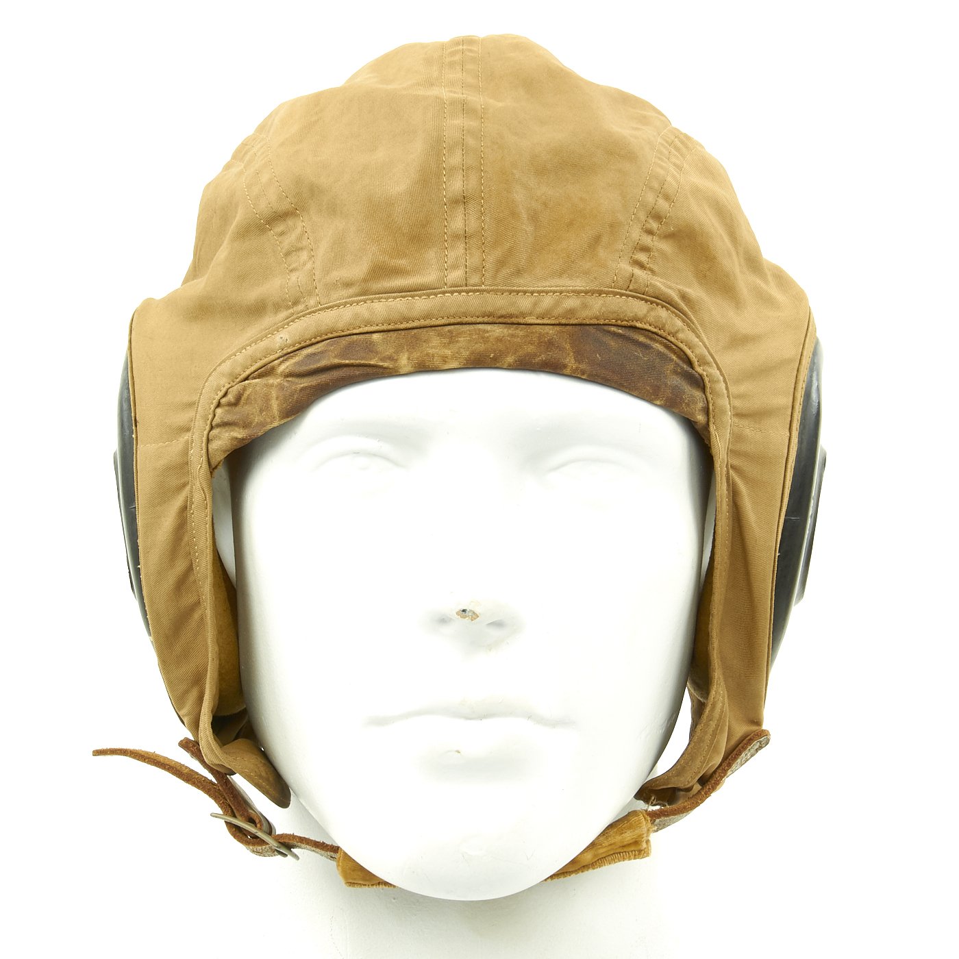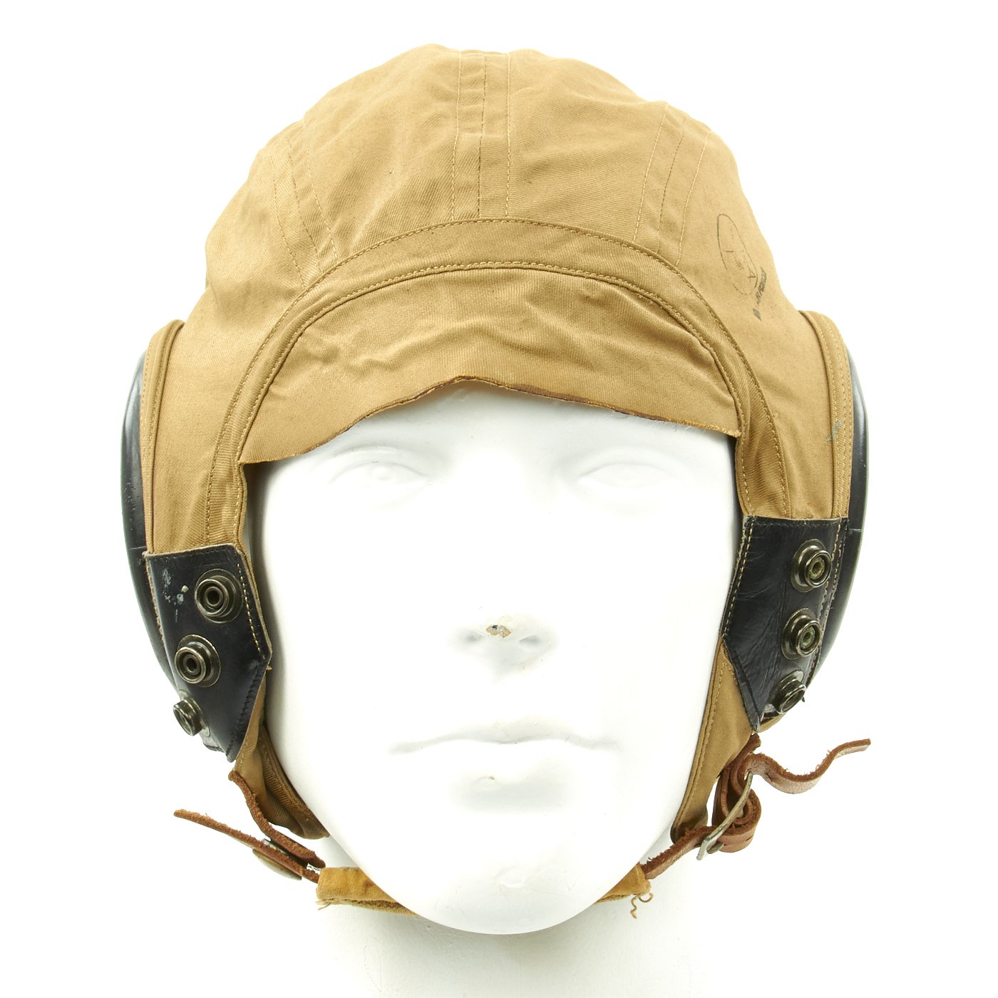 - WW2 USAAF A-10A summer flying helmet. Khaki cotton twill flying helmet with black rubber ear pieces. The inner forehead section and headphone cups are lined with chamois leather. The helmet has three leather loops on the rear to retain goggles. Two of these loops are secured with press studs. There is a buckle and snap fastening chin strap with velour padding. Brass press stud fittings for an oxygen mask are also present. Attached is a rare Army Air Forces Type A-1 detachable visor. Both in used but very good condition.