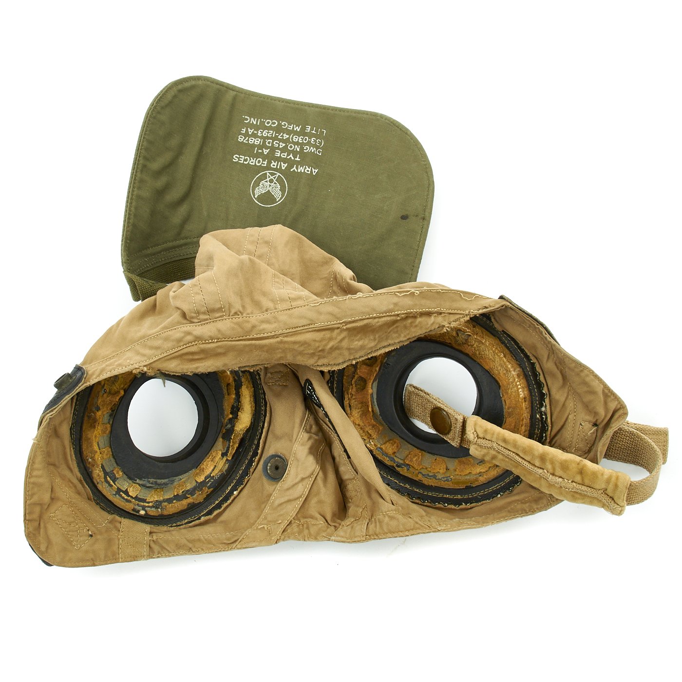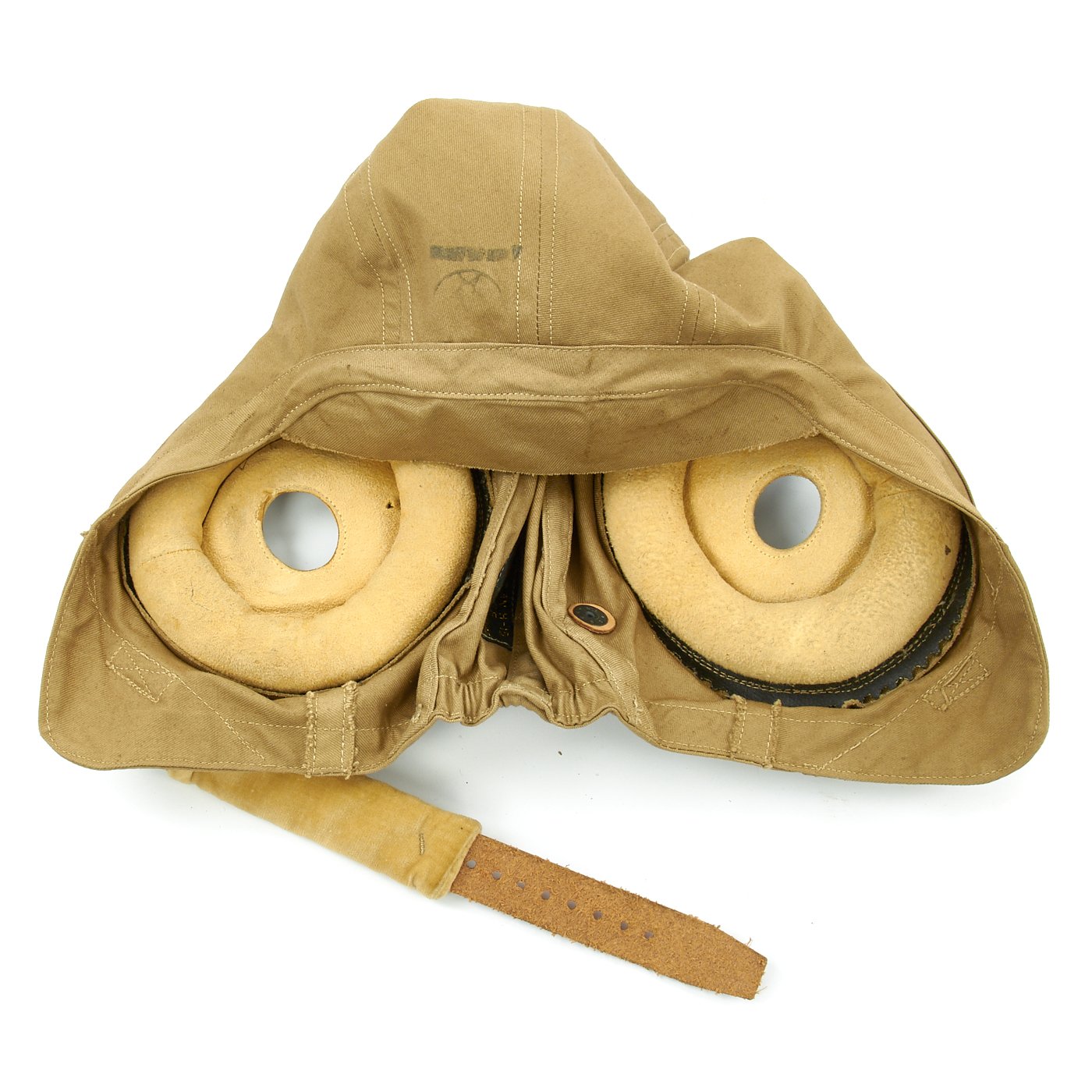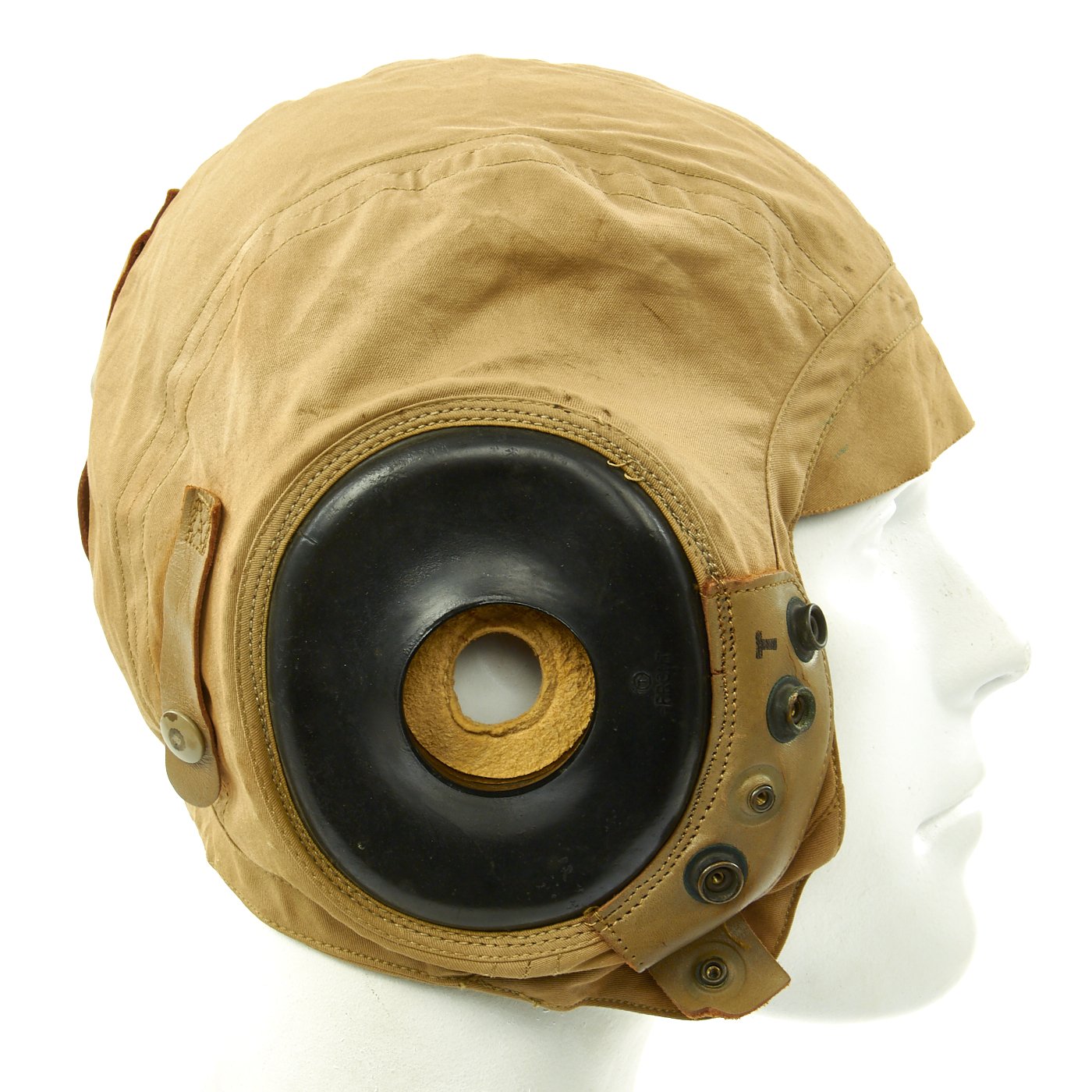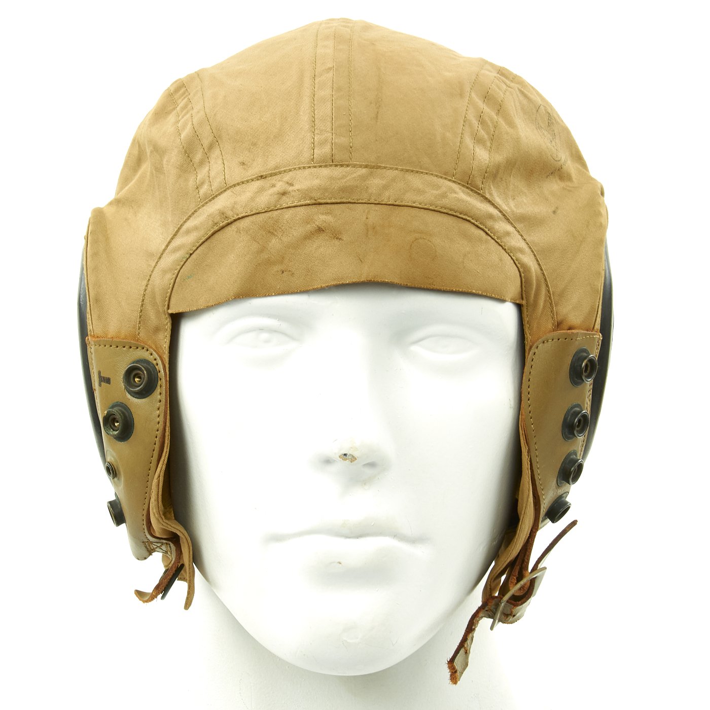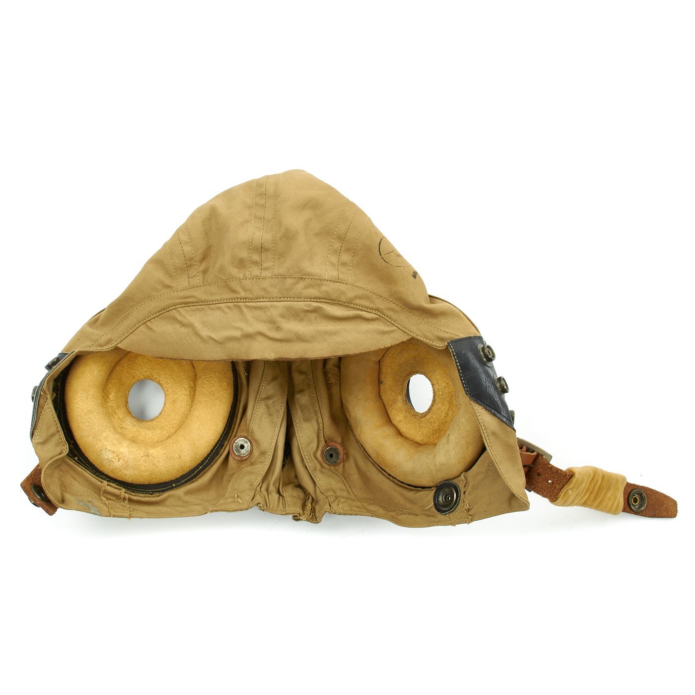 - WW2 USAAF A-10A summer flying helmet. Khaki cotton twill flying helmet with black rubber ear pieces. The inner forehead section and headphone cups are lined with chamois leather. The helmet has three leather loops on the rear to retain goggles. Two of these loops are secured with press studs. There is a buckle and snap fastening chin strap with velour padding. Brass press stud fittings for an oxygen mask are also present. Attached is a rare Army Air Forces Type A-1 detachable visor. Both in used but very good condition.