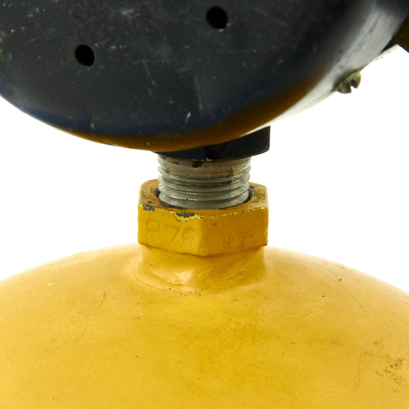 The tank is painted standard yellow in very good condition and measures 15" tall by 7" wide. The side is stenciled in black paint: