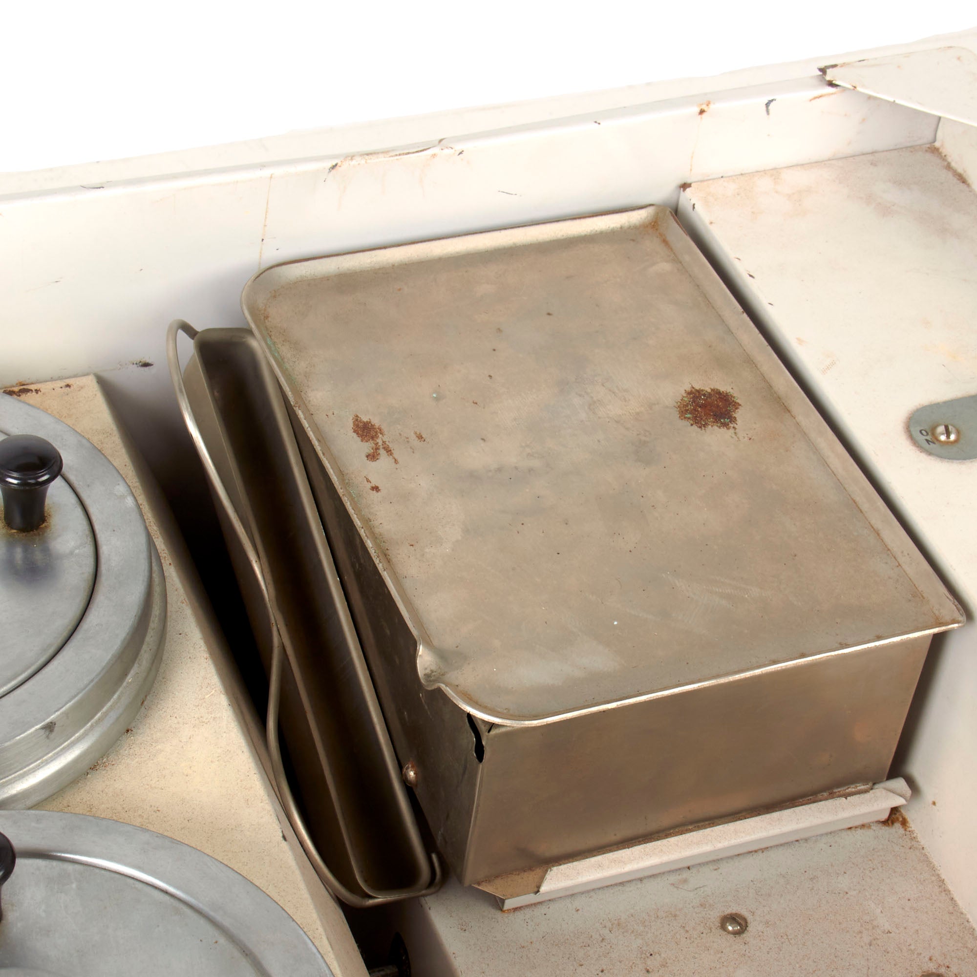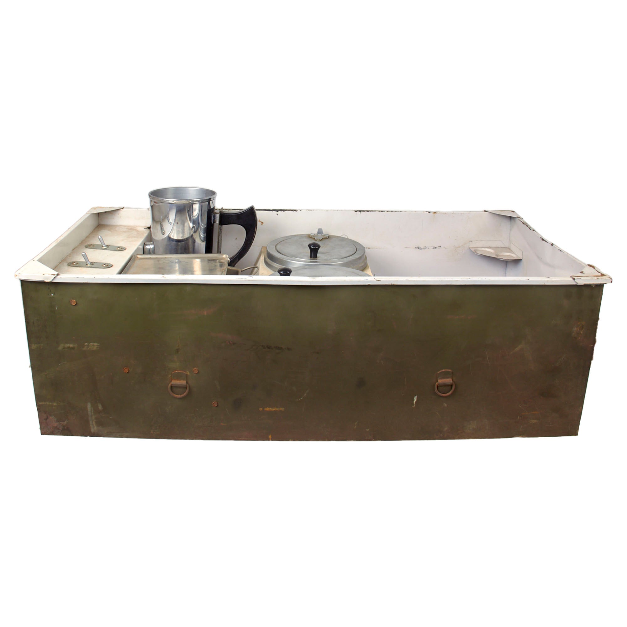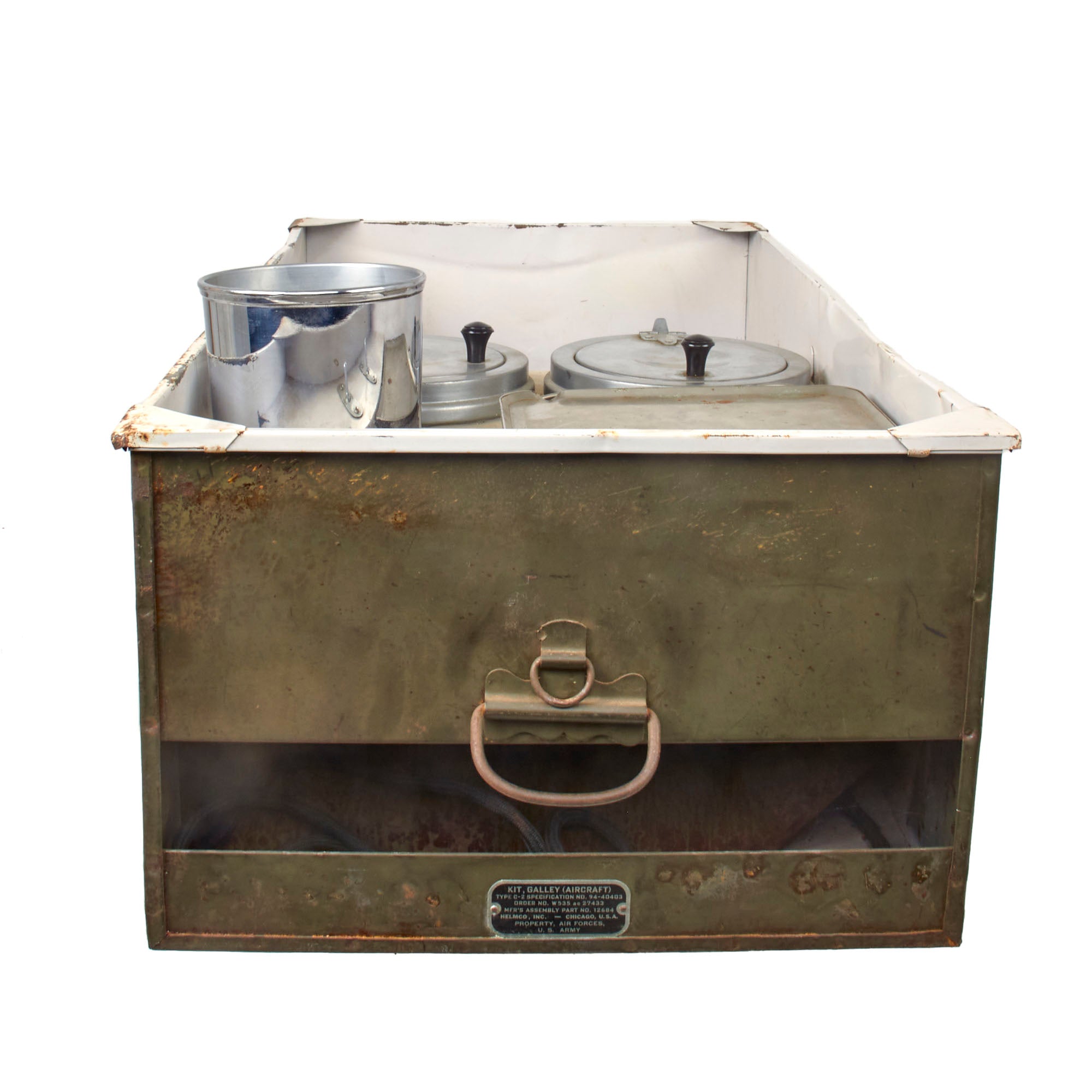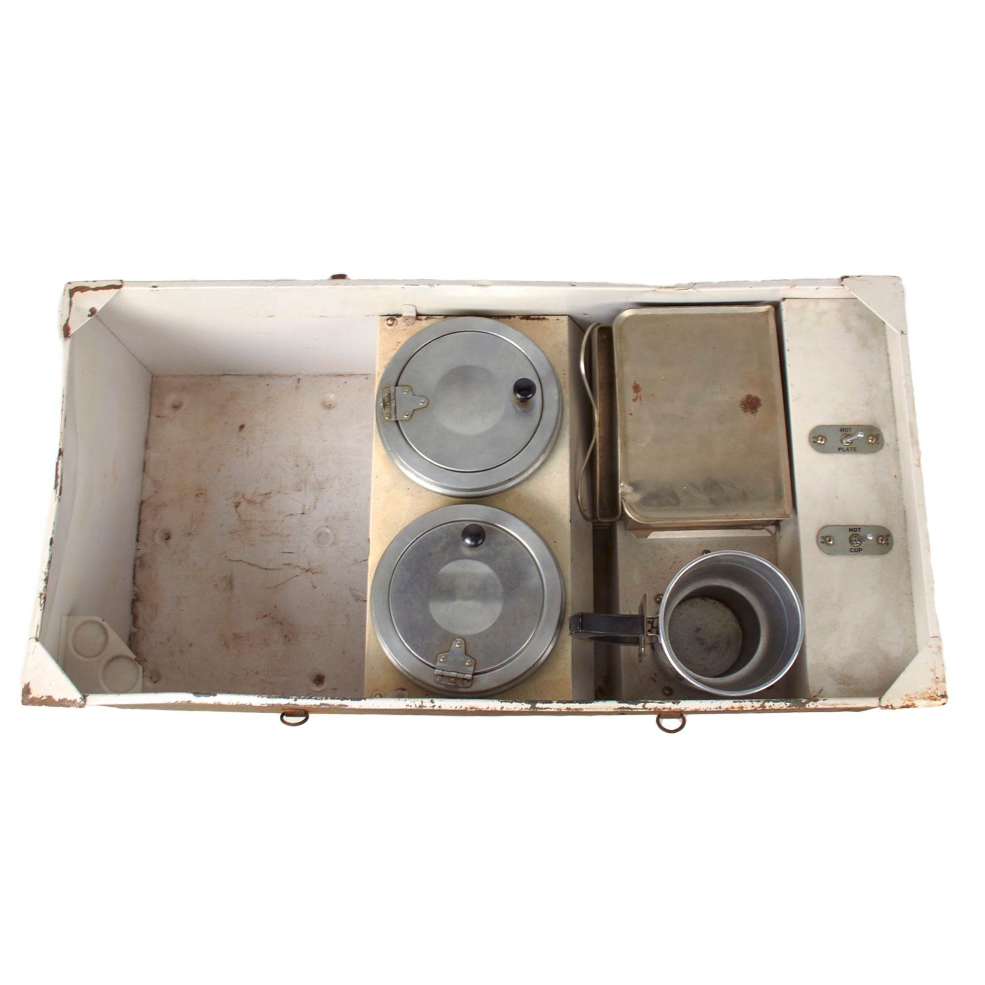 Original Item: Only One Available. This is an outstanding United States Army Air Force B-17 Flying Fortress bomber crewman kit galley with several accessories and an original data plate. This set presents beautifully, but is incomplete. It retains the two white enameled lidded containers in the center, the hot plate, and the hot cup, but there are no loose pots or other pieces that would have filled the large space.