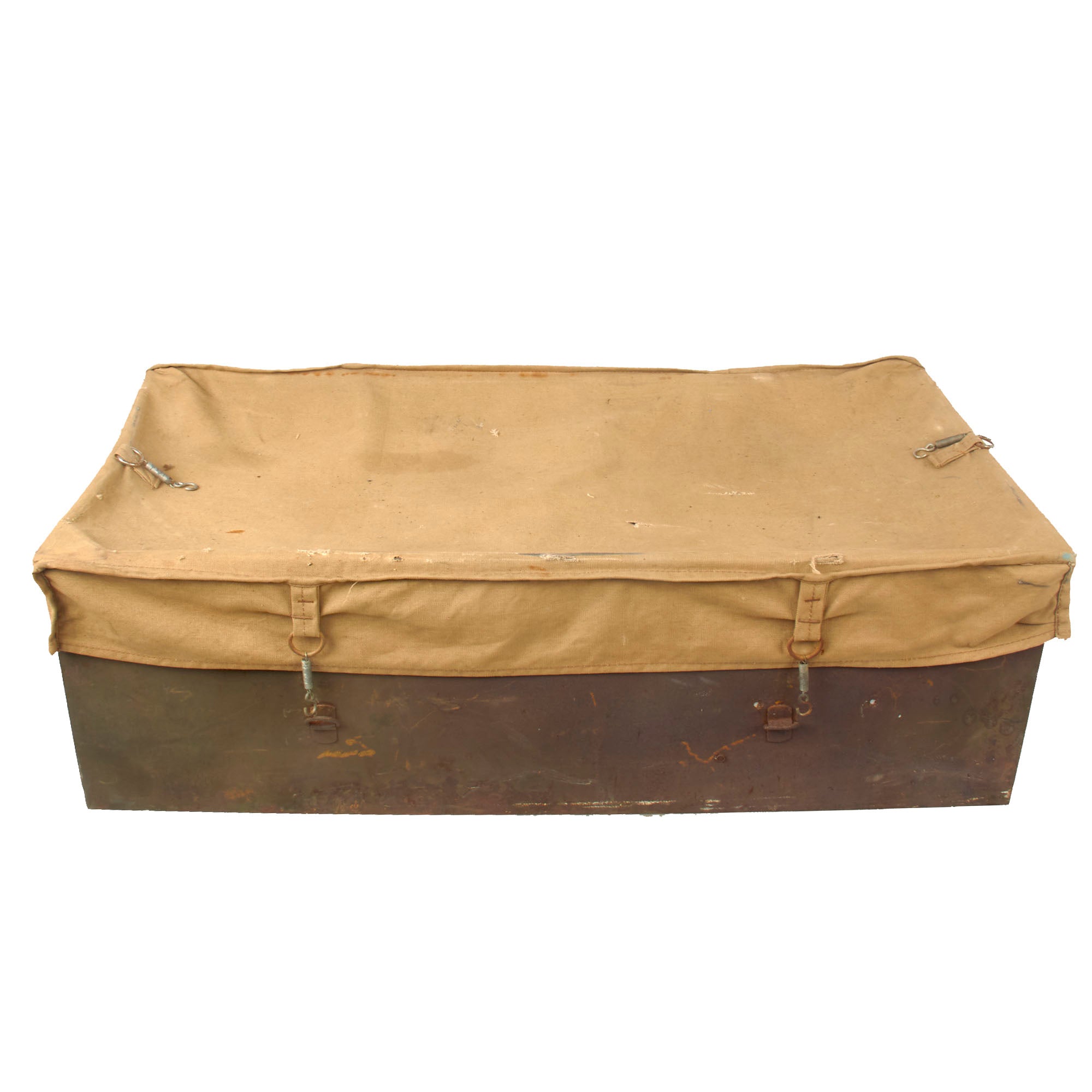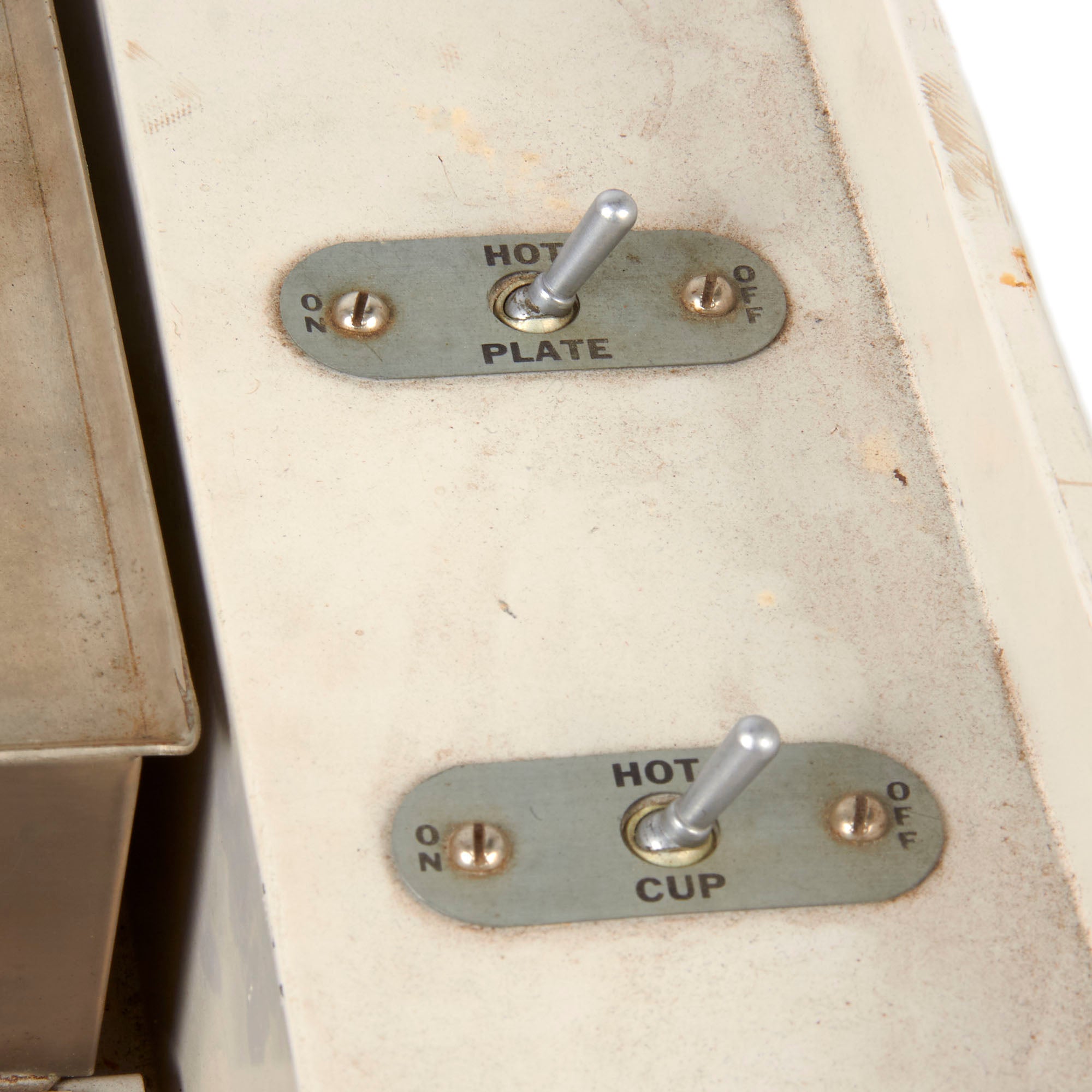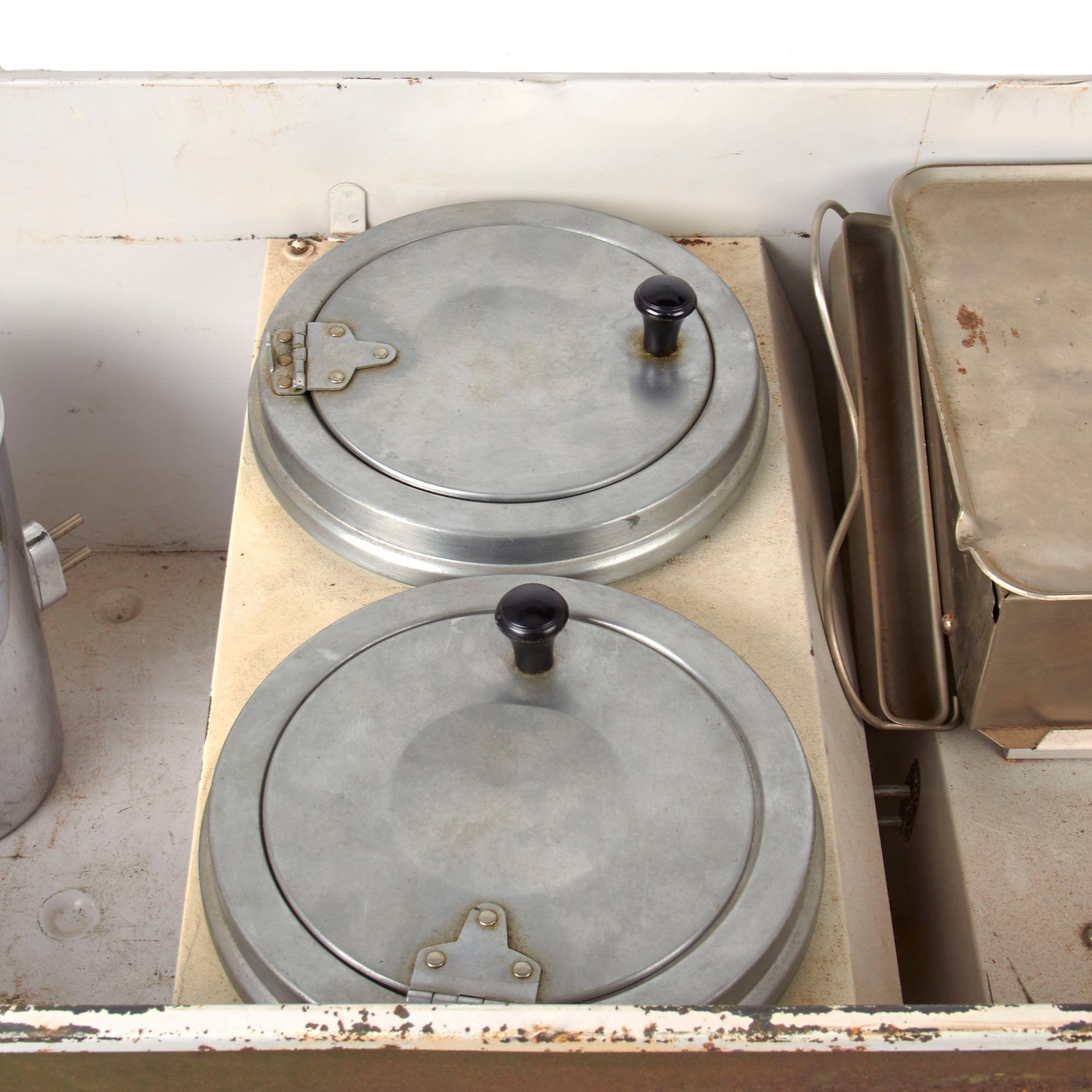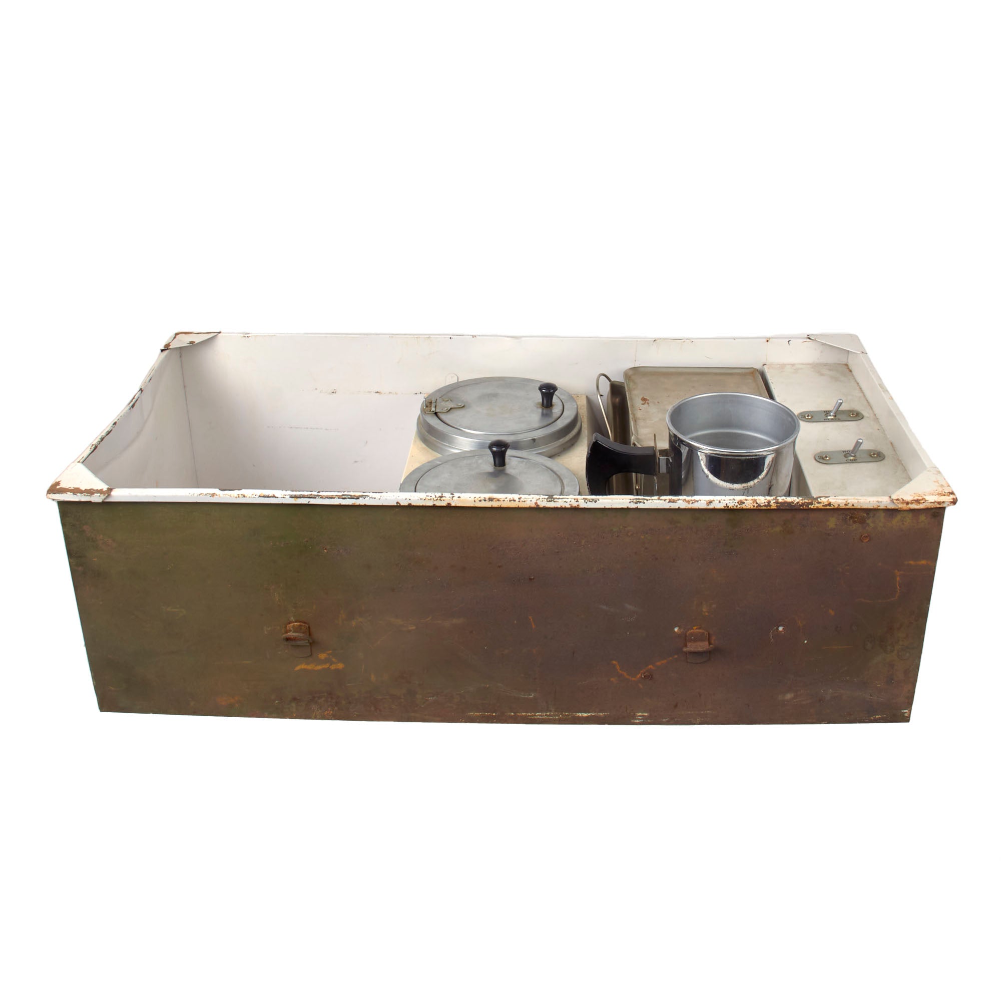 Original Item: Only One Available. This is an outstanding United States Army Air Force B-17 Flying Fortress bomber crewman kit galley with several accessories and an original data plate. This set presents beautifully, but is incomplete. It retains the two white enameled lidded containers in the center, the hot plate, and the hot cup, but there are no loose pots or other pieces that would have filled the large space.