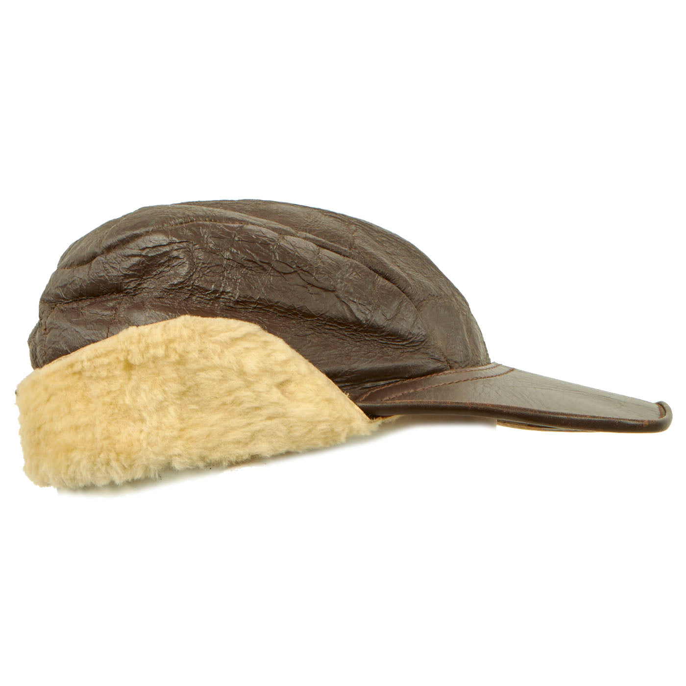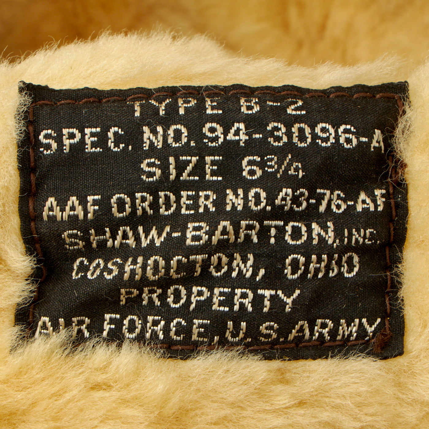 Officially called the "Cap, Flying, Winter, Type B-2" it was issued and standardized in April 1939. They were issued to the U.S.A.A.F. aircrew including bomber crews. The cap is constructed of high quality leather and is lined with sheepskin wool. All original stitching appears to be intact, as well as the wool. The leather brim appears to have never been folded and shows no signs of creasing in the bill. The leather does show signs of light wear and has wrinkled from time and storage. The left side of the cap still has the original Army Air Forces insignia and text beneath it, though the letter “A” in Army is shifted slightly over the letter R. The inside cloth label is still present and easily discernible: