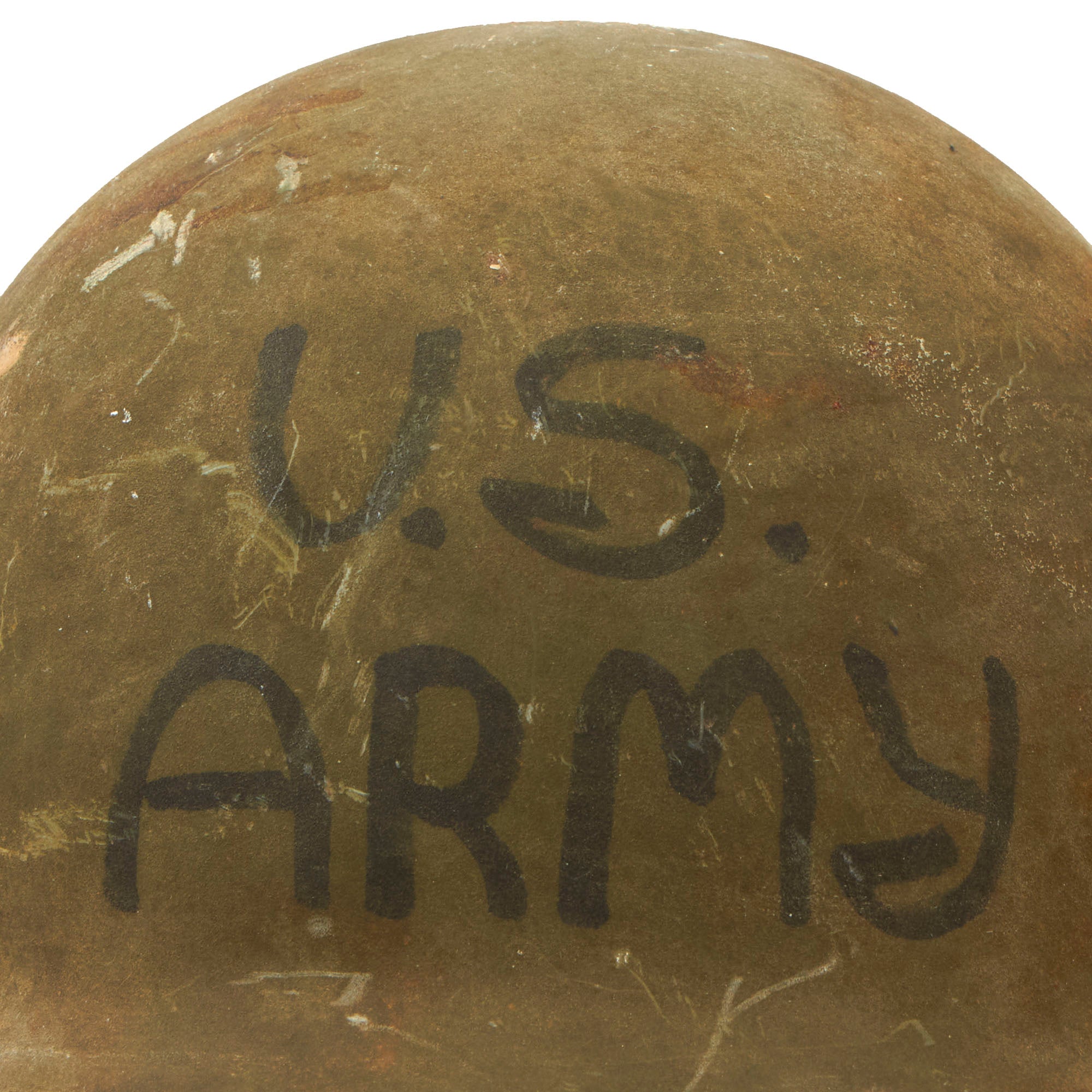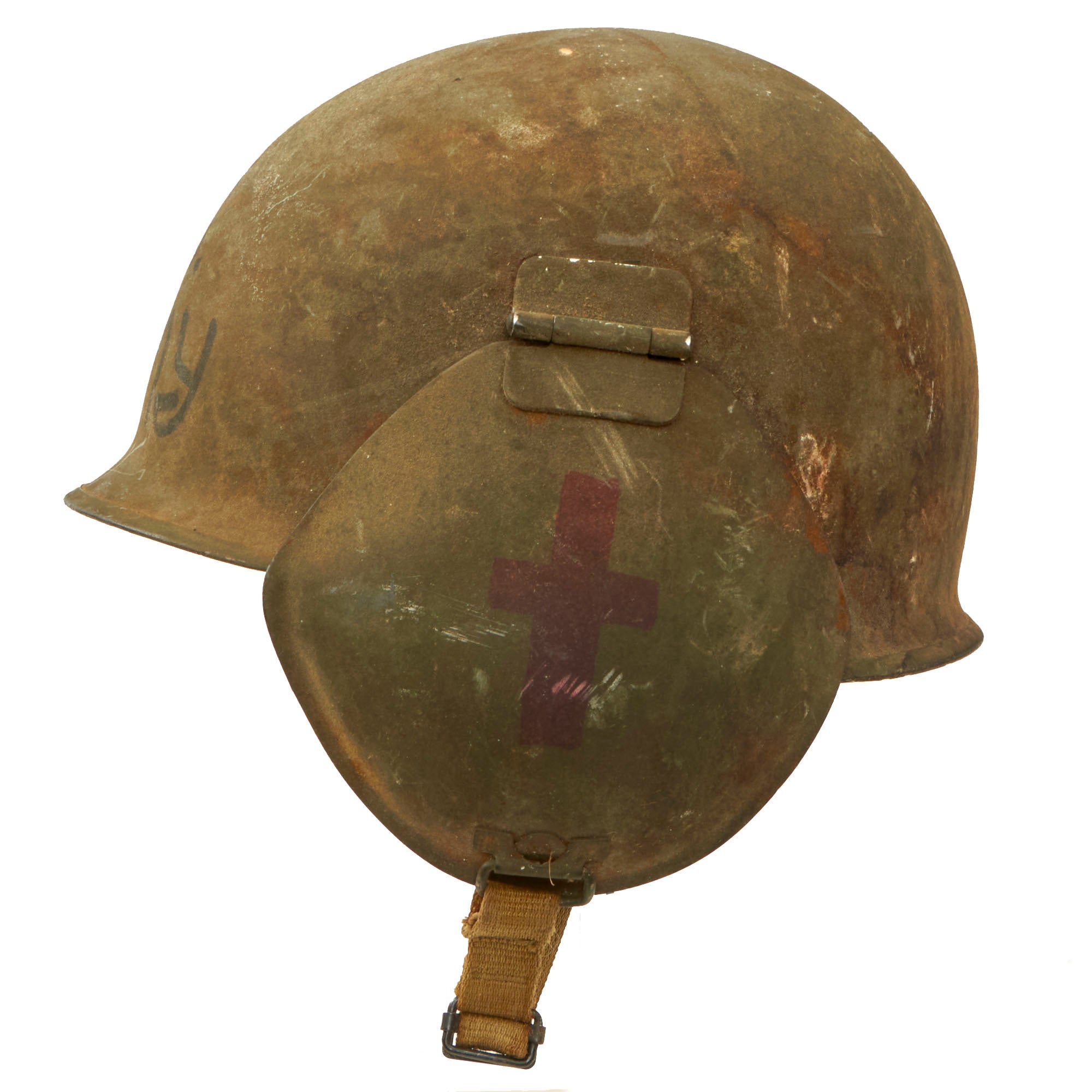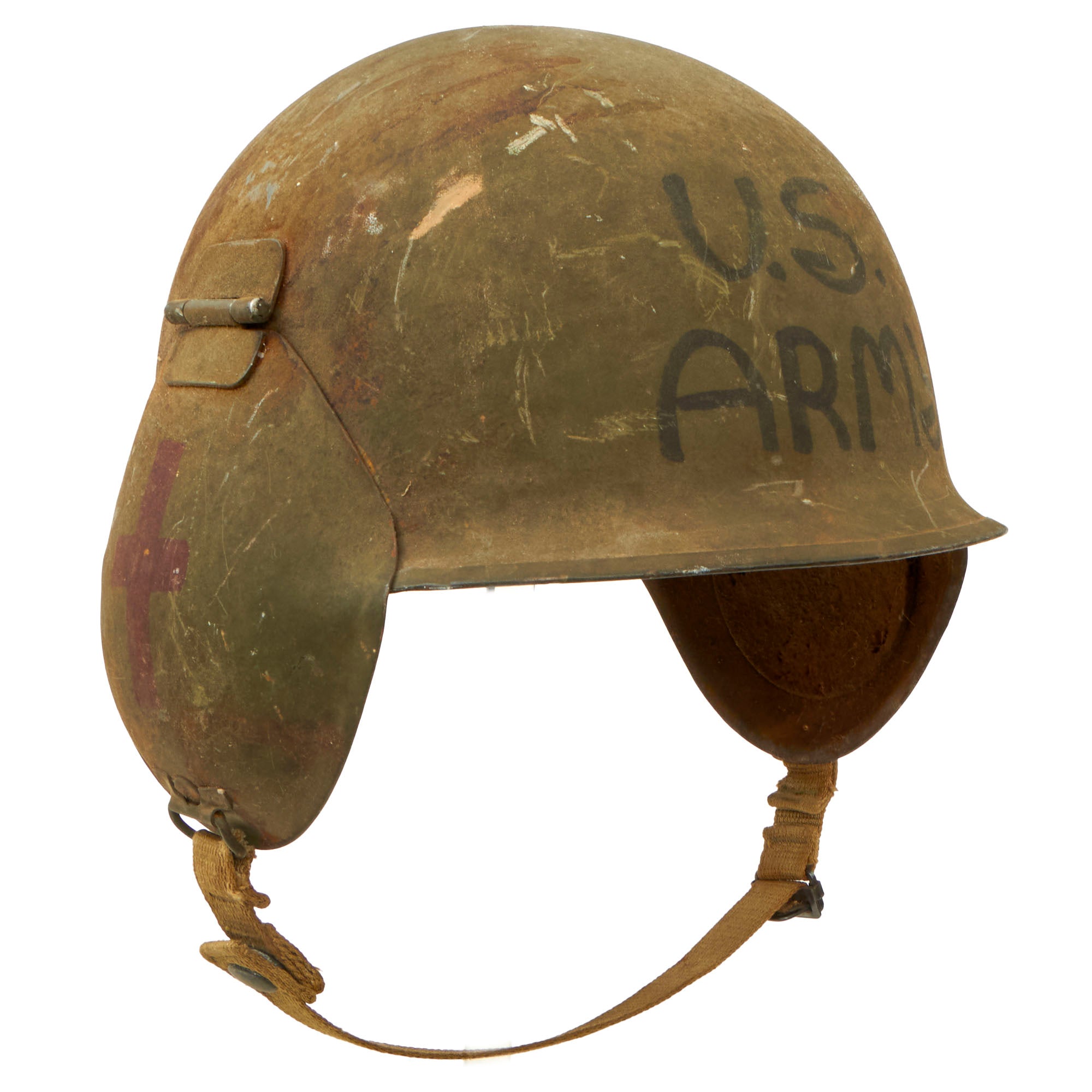 This example has had U.S. ARMY painted on the front, with red crosses painted on both side-plates. The paint appears period, and are likely meant for use by a medic, but the proportions of the crosses almost make them appear religious. However, we can’t confirm one way or the other.