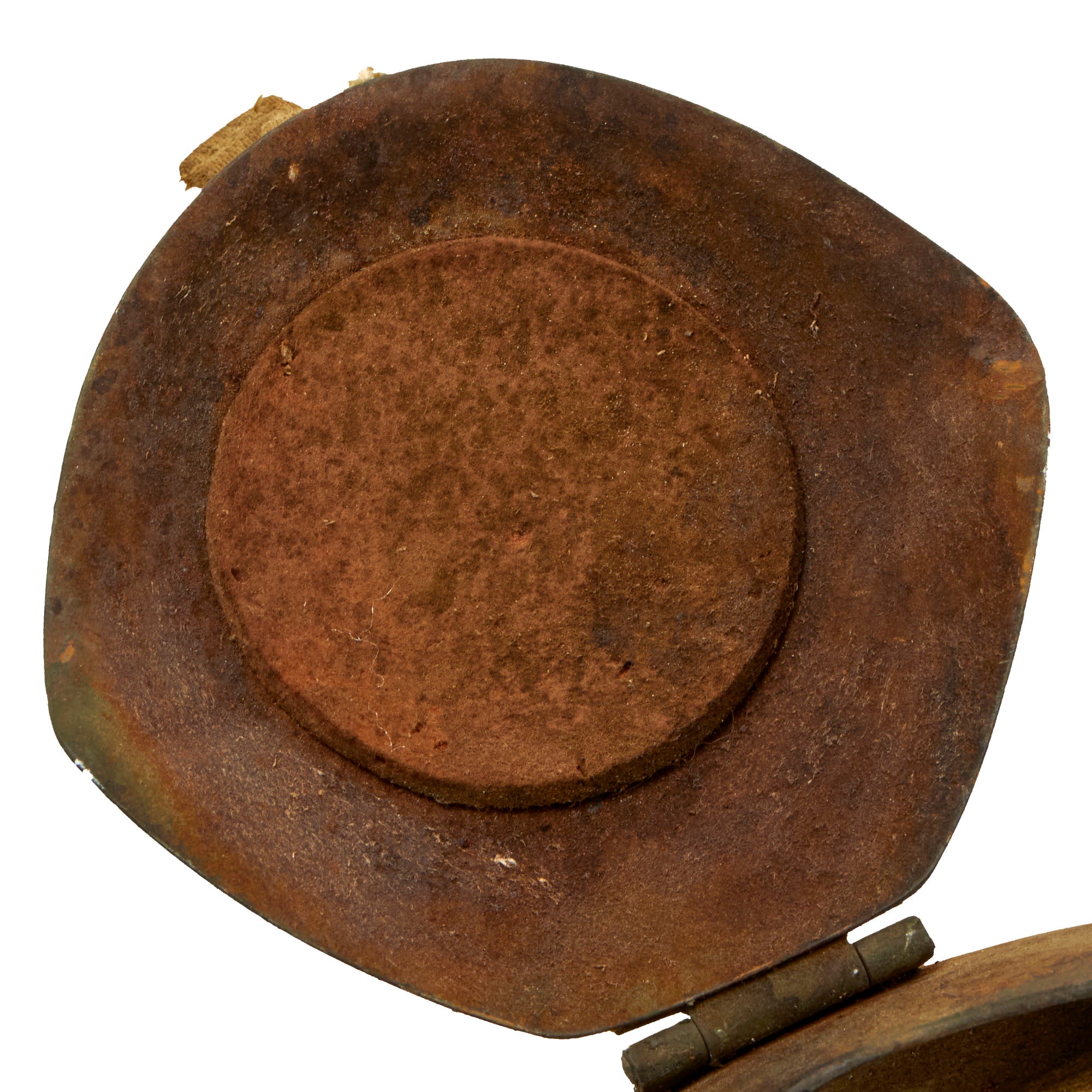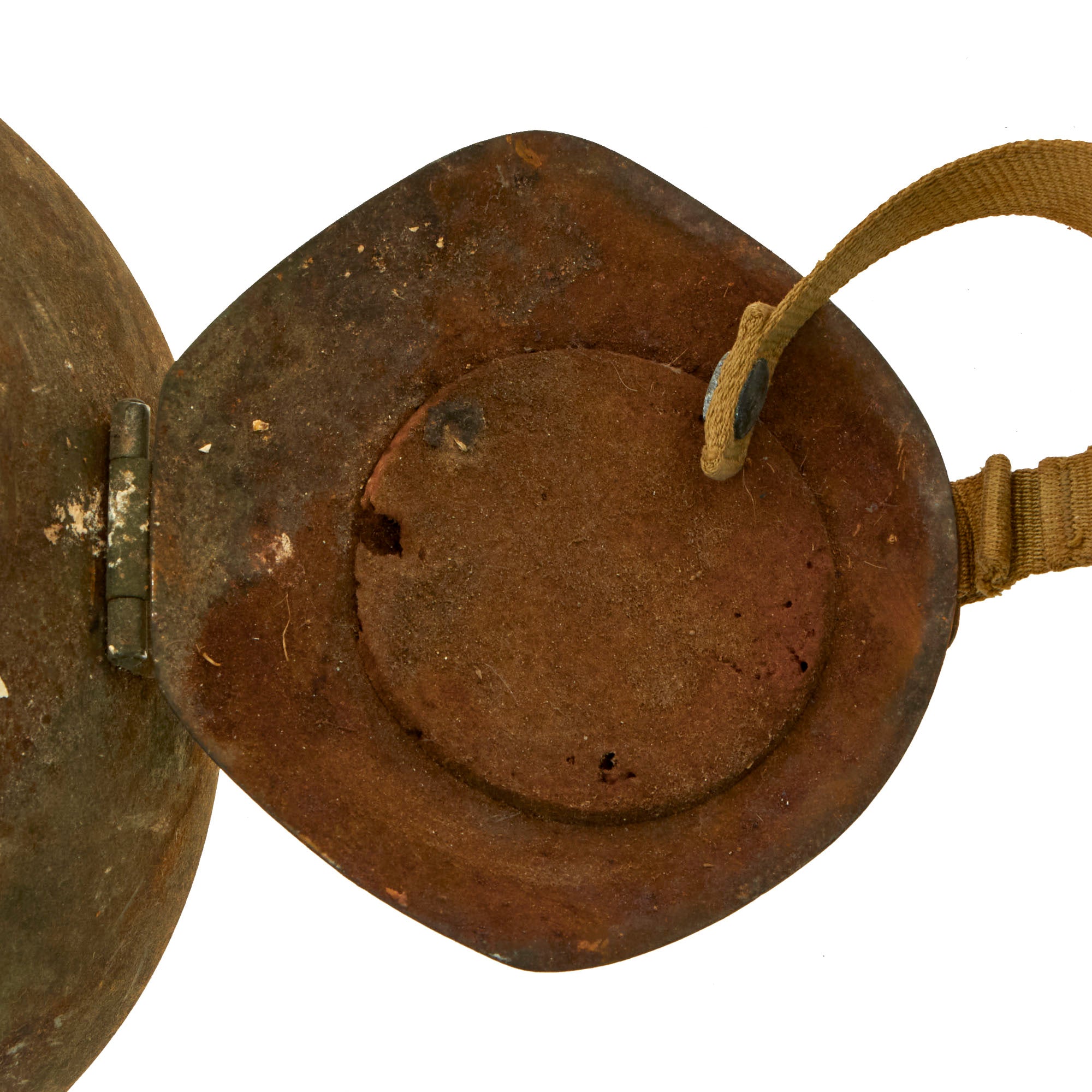 This example is offered in very good condition, complete with the suspension liner and chin strap with both interior felt cushions on the flaps, although they are all very worn. The exterior paint is still in great shape, with lots of the original flocking retained, and just light wear from storage. Chinstrap is intact, and exhibits some corrosion to the hardware and some rust stains to the khaki canvas as well as fraying.