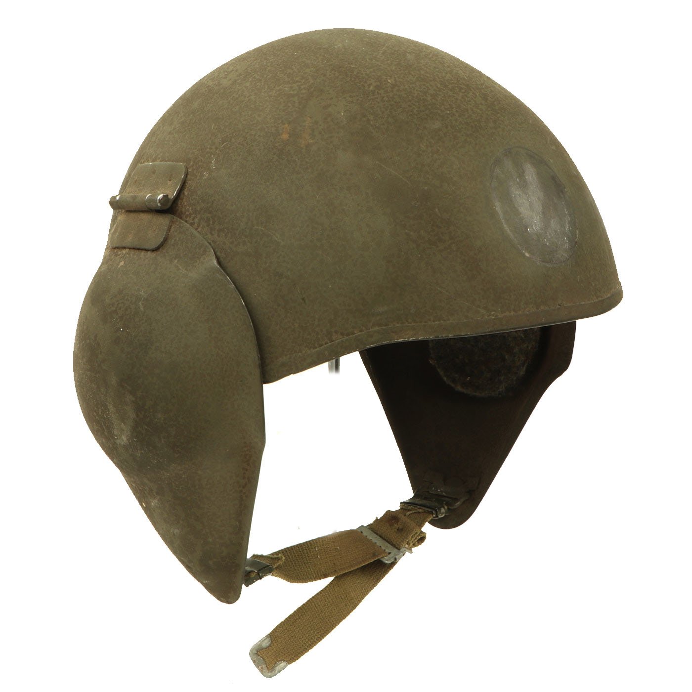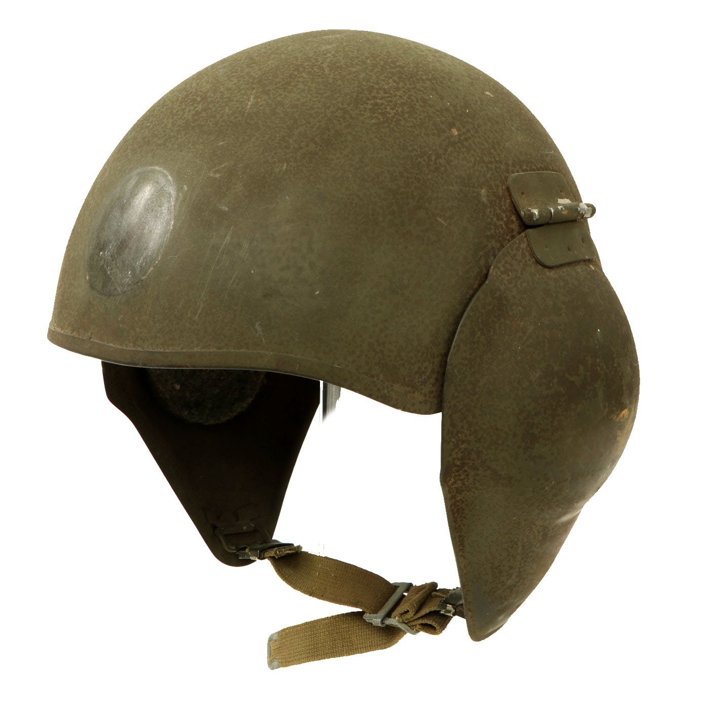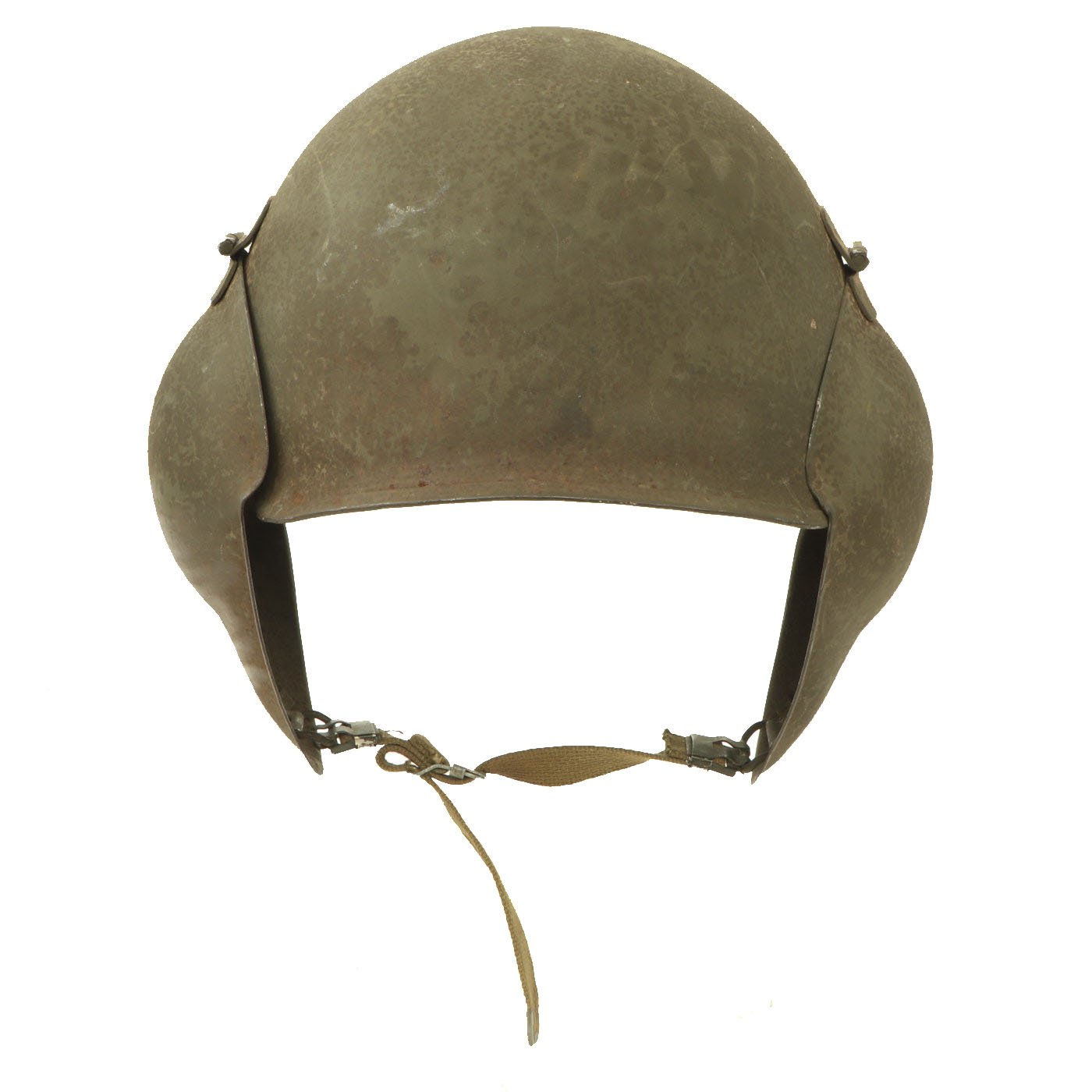 Original Item: Only One Available. This is a very hard to find USAAF WWII issue M5 Flak Helmet, in very good condition. It does not look to have been issued or used very much, but it does have a lot of storage wear on the exterior shell. This has removed a lot of the fuzzy "flocked" coating on the exterior. World War Two American bomber crews in the skies over Europe needed something more than their leather flying helmets to provide them with shrapnel injuries, however it took a surprisingly long time for a new helmet to be developed and deployed to meet that need. Not until December of 1943 did the M3 reach the ETO, it was the first of three versions of the American flak helmet. The M4 followed, and in January 1945, this model, the M5, became the standard issue to bomber crews.