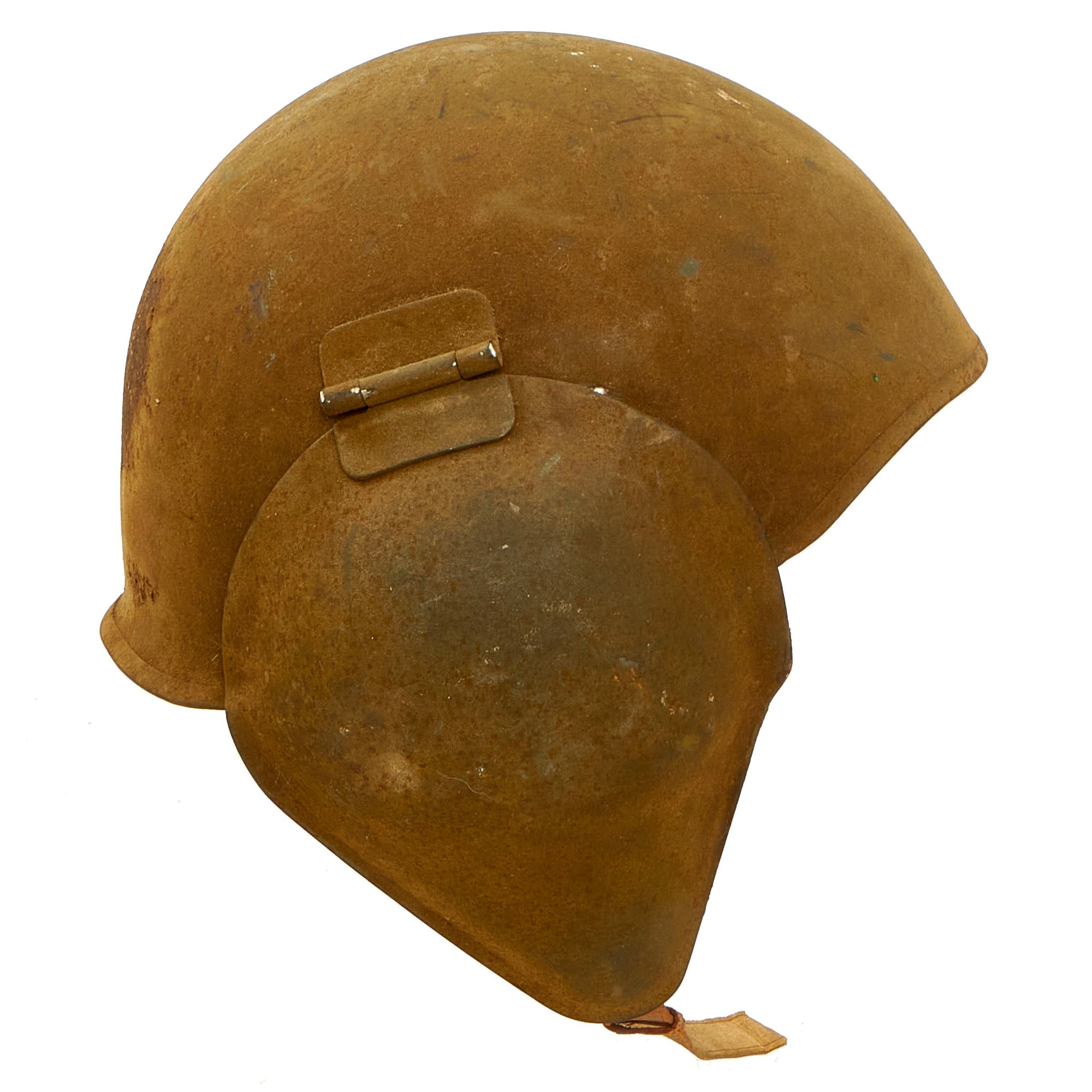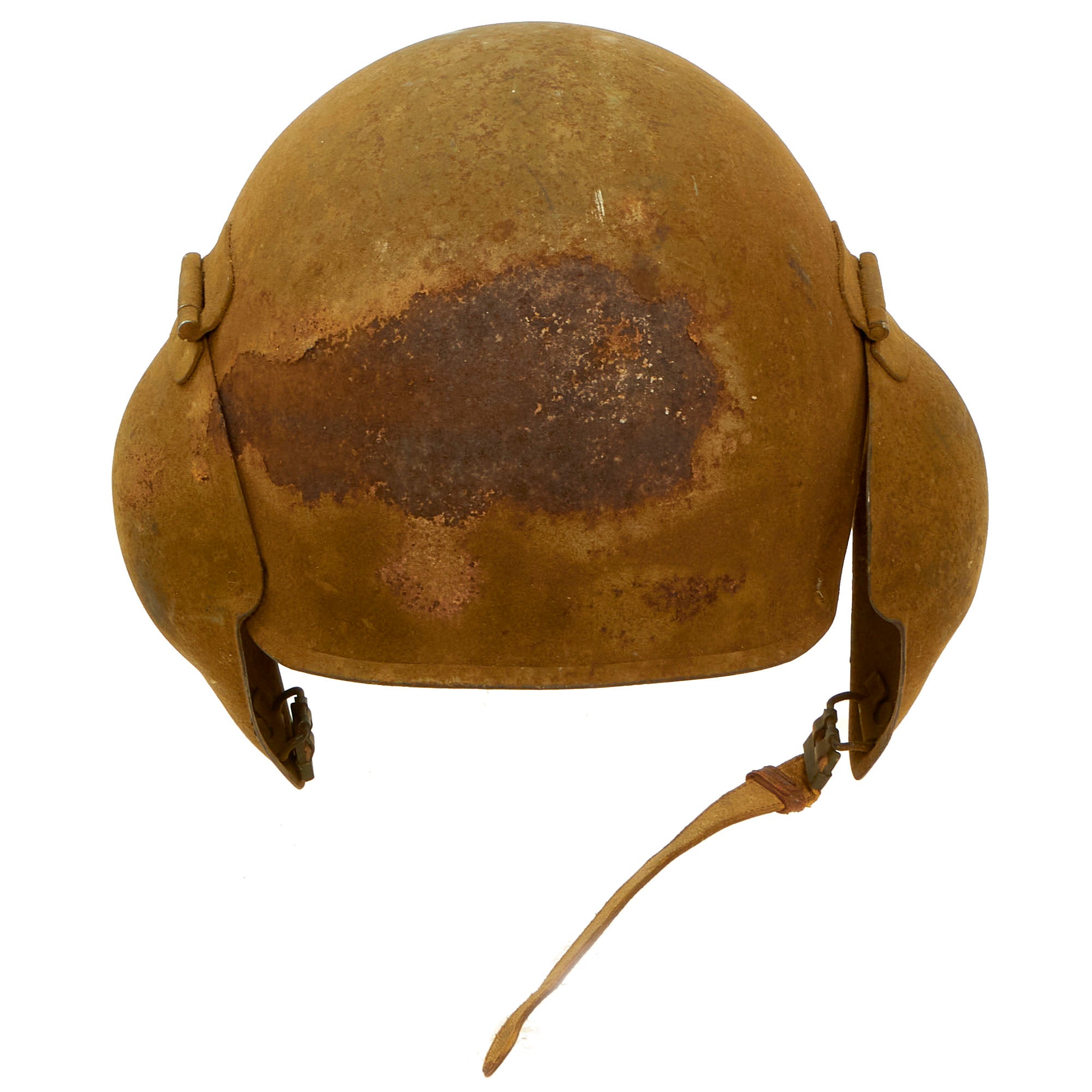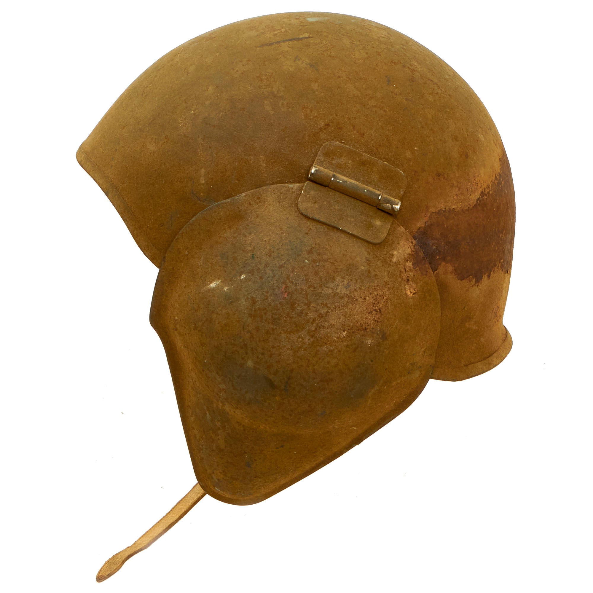 Original Item: Only One Available. This is a very hard to find USAAF WWII issue M5 Flak Helmet, in good condition. It does look to have been issued, but it does have minor storage wear on the exterior shell, which has removed some of the "flocked" coating on the exterior. World War Two American bomber crews in the skies over Europe needed something more than their leather flying helmets to provide them with shrapnel injuries, however it took a surprisingly long time for a new helmet to be developed and deployed to meet that need. Not until December of 1943 did the M3 reach the ETO, it was the first of three versions of the American flak helmet. The M4 followed, and in January 1945, this model, the M5, became the standard issue to bomber crews.
