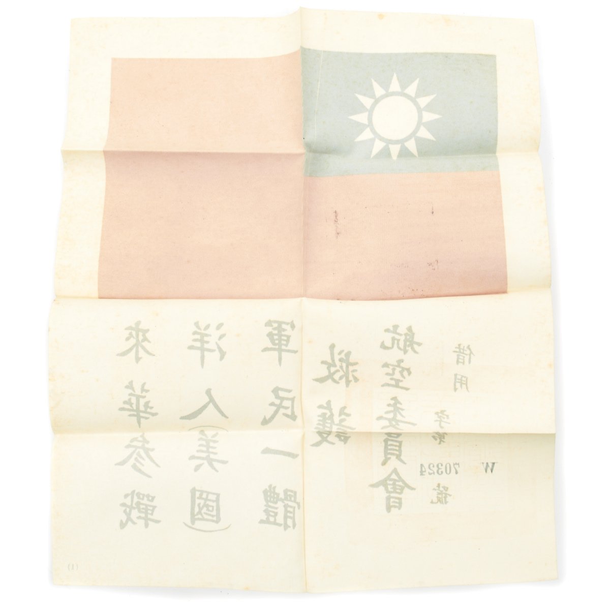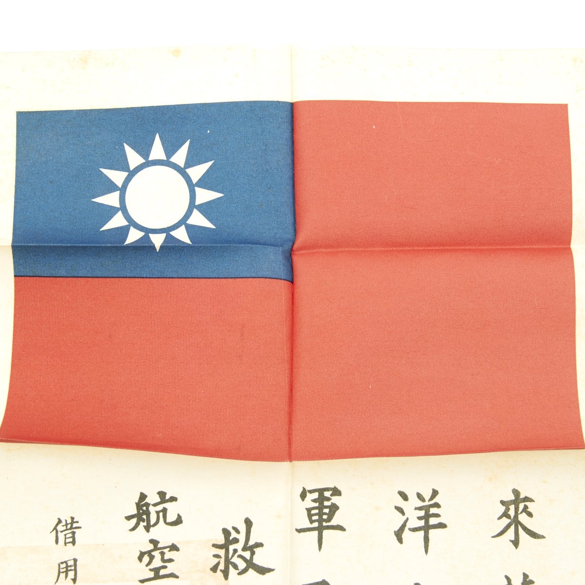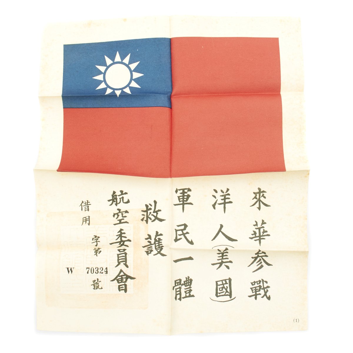 - An Original WWII USAAF Chinese Flag "Blood Chit" No. 70324 printed on silk coated with pectin, measuring 10" by 8" This has a Chinese national flag on it, along with a short message in Chinese intended to help guide the air crew to help. This was often sewn directly onto the inside of the flight jacket.