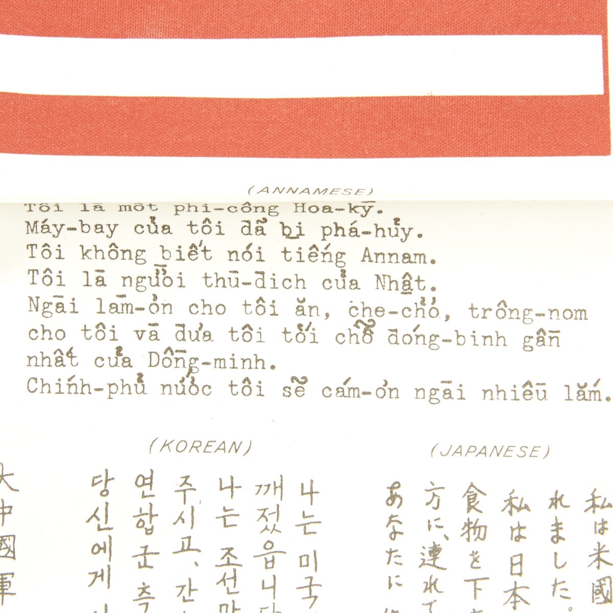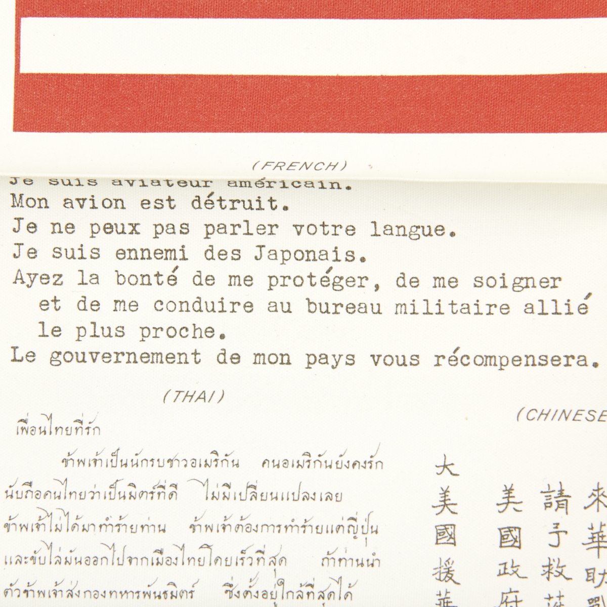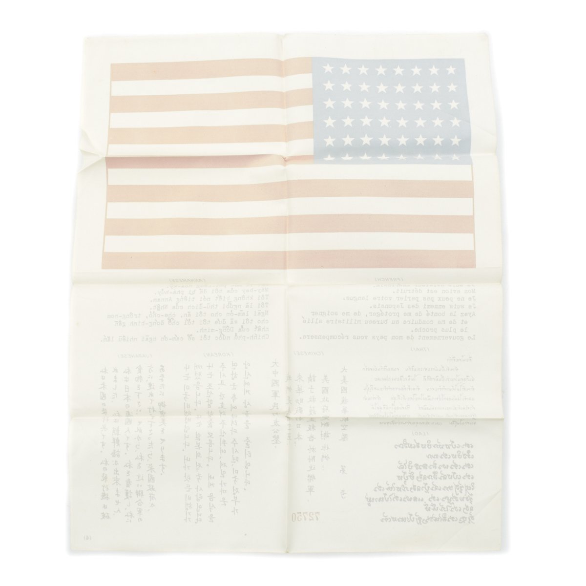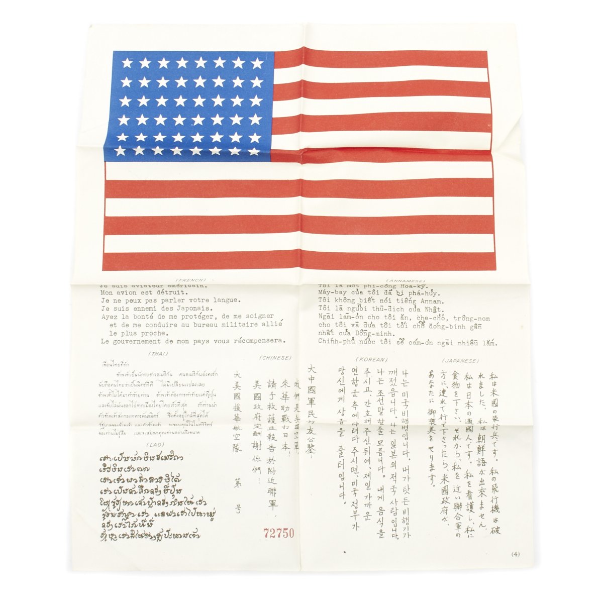 - An Original WWII USAAF American Flag "Blood Chit" No. 727509 printed on silk coated with pectin, measuring 12" by 9.5". This has an American flag on the top, along with the same message as on the Chinese blood chit, in French, Annamese (Vietnamese), Japanese, Korean, Chinese, Thai, and Lao.