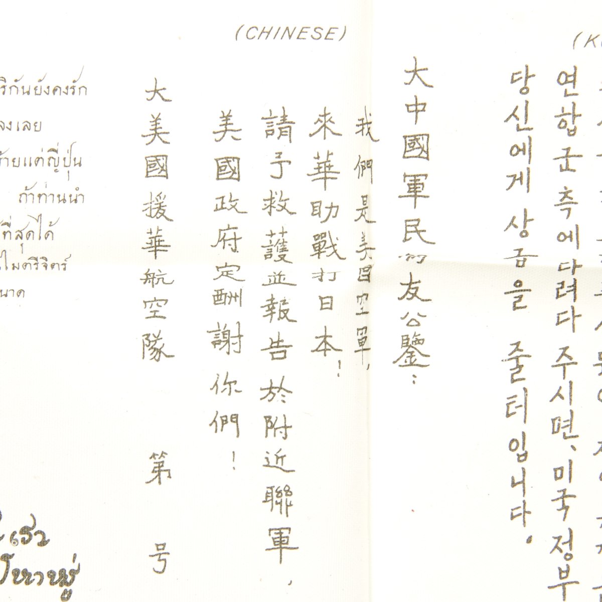 In the Second Sino-Japanese War prior to World War II, foreign volunteer pilots of Flying Tigers carried notices printed in Chinese that informed the locals that this foreign pilot was fighting for China and they were obliged to help them. A text from one such blood chit translates as follows: