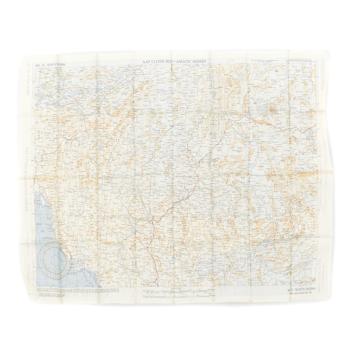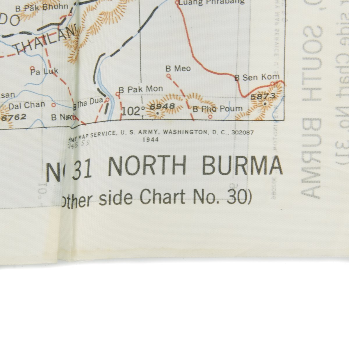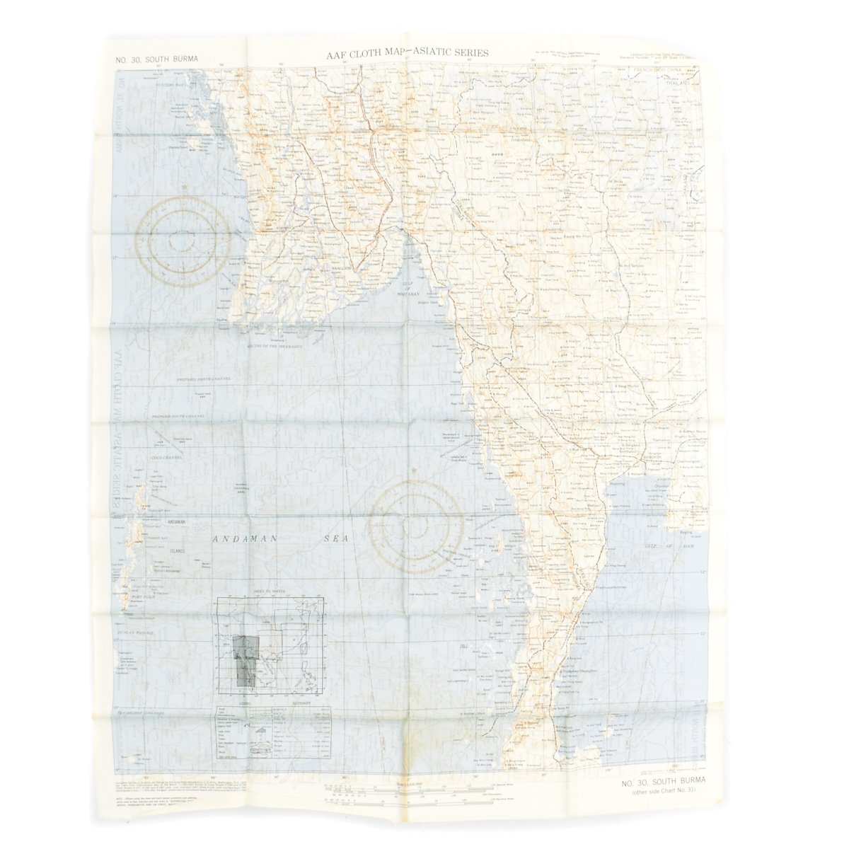 - USAAF WWII Dated Escape map marked AAF CLOTH MAP - ASIATIC SERIES - at the top center and titled: NO. 30, SOUTH BURMA the reverse reads NO. 31, NORTH BURMA