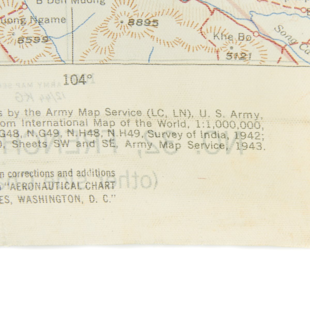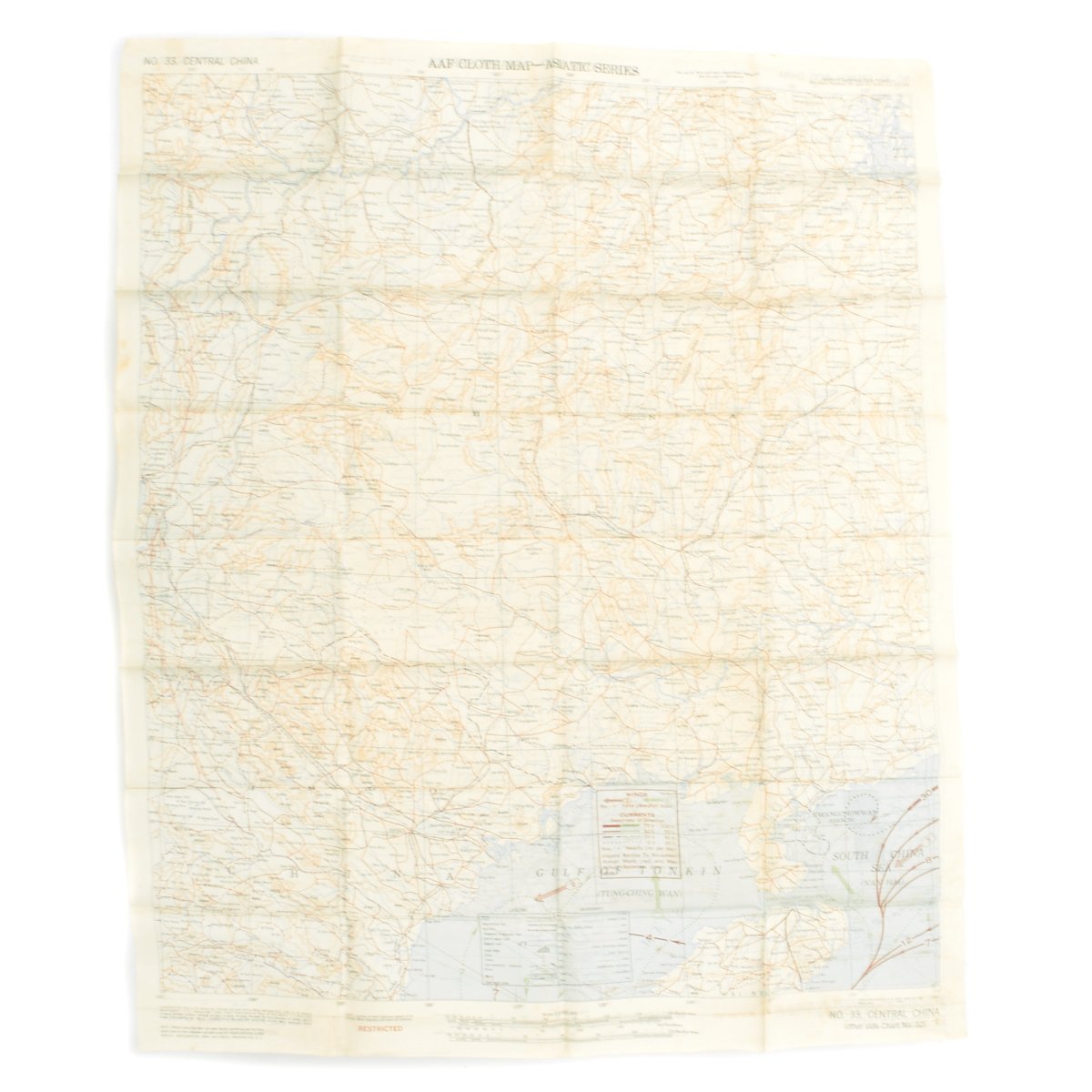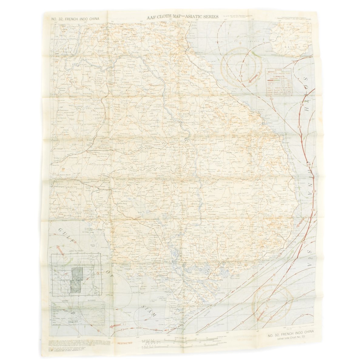- USAAF WWI Dated Escape map marked AAF CLOTH MAP - ASIATIC SERIES - at the top center and titled: NO. 32, FRENCH INDO CHINA the reverse reads NO. 33, CENTRAL CHINA