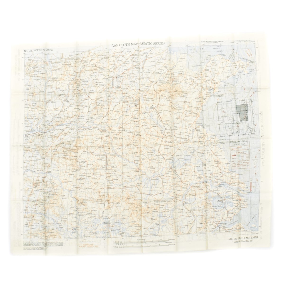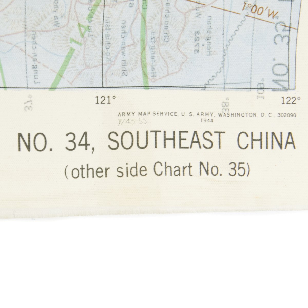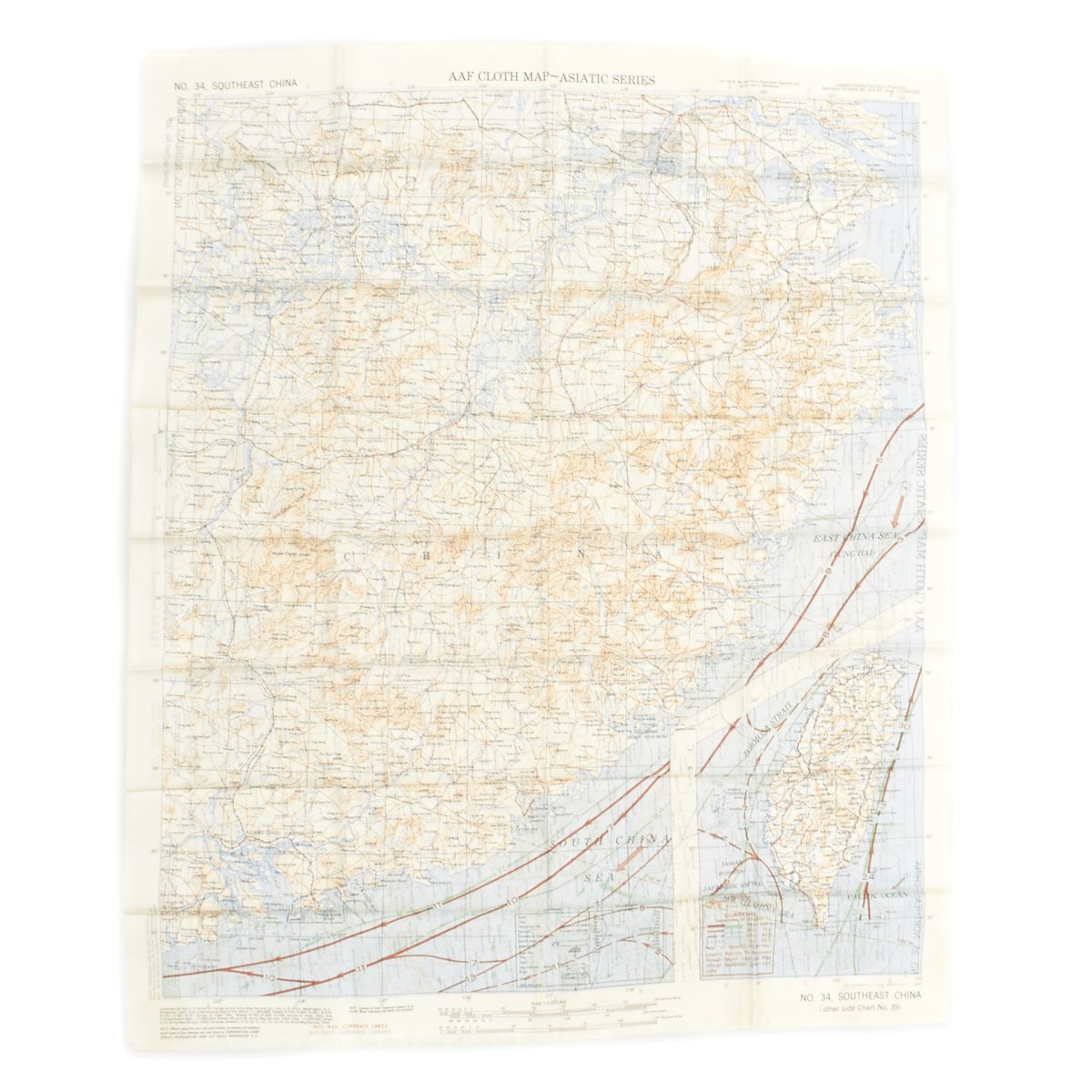- USAAF WWII Dated Escape map marked AAF CLOTH MAP - ASIATIC SERIES - at the top center and titled: NO. 34, SOUTHEAST CHINA the reverse reads NO. 35, NORTHEAST CHINA