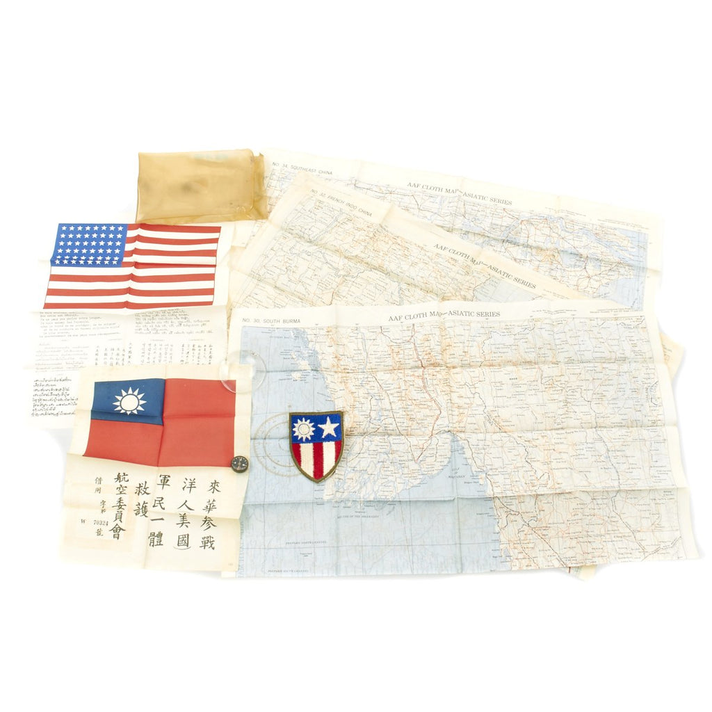 Original Item: Only One Available. This is an excellent condition U.S. Army Air Forces Blood Chit & Map Survival set from the China, Burma, and India Theater of World War II. Sets such as these were standard issue to WWII Pilots flying routes over "The Hump", the eastern end of the Himalayas, which they had to cross to resupply the Chinese war effort of Chiang Kai-shek and the units of the United States Army Air Forces (AAF) based in China.