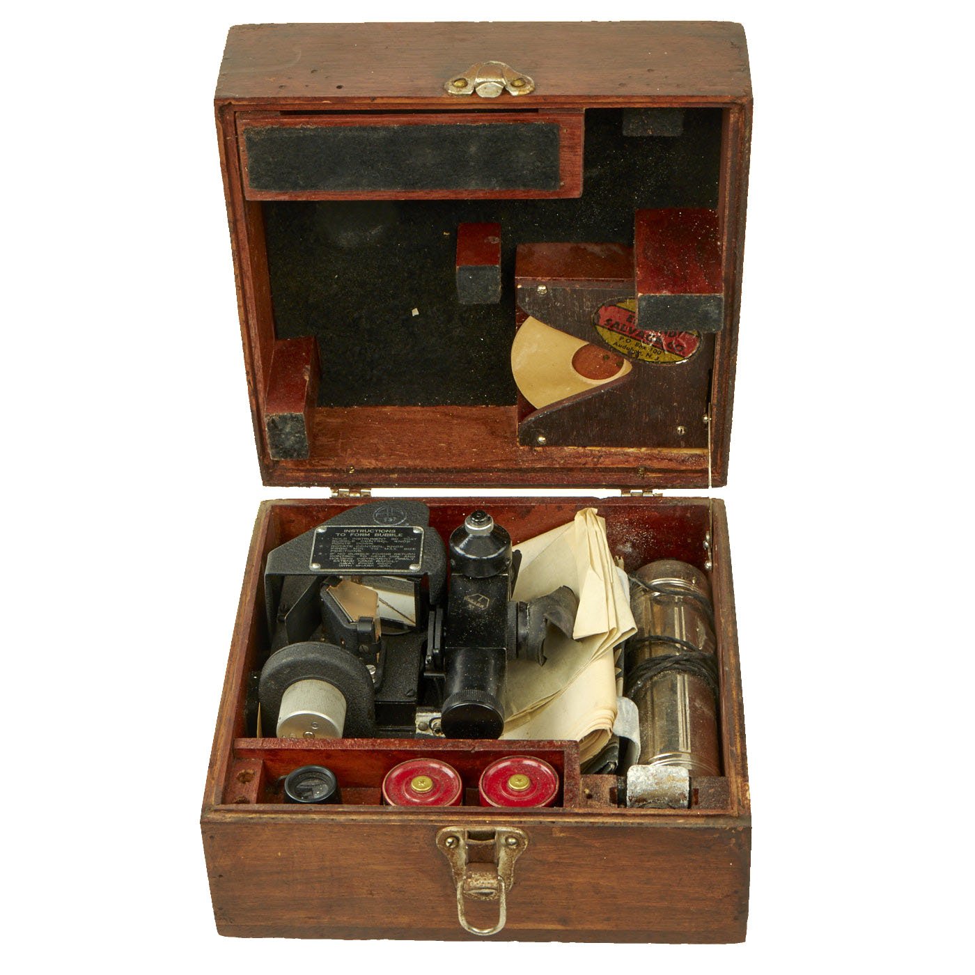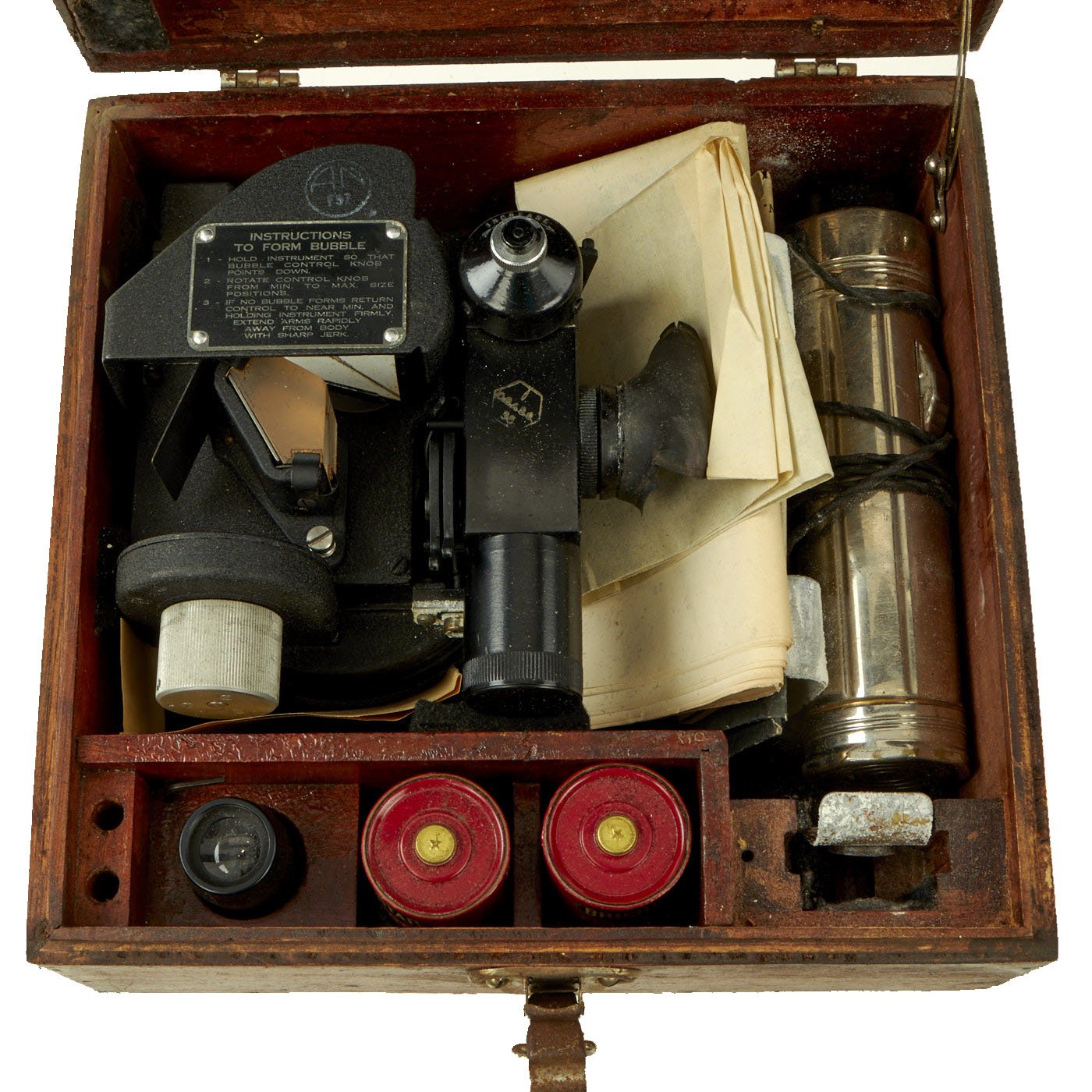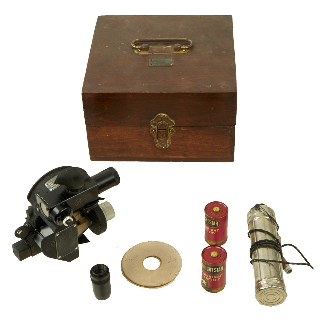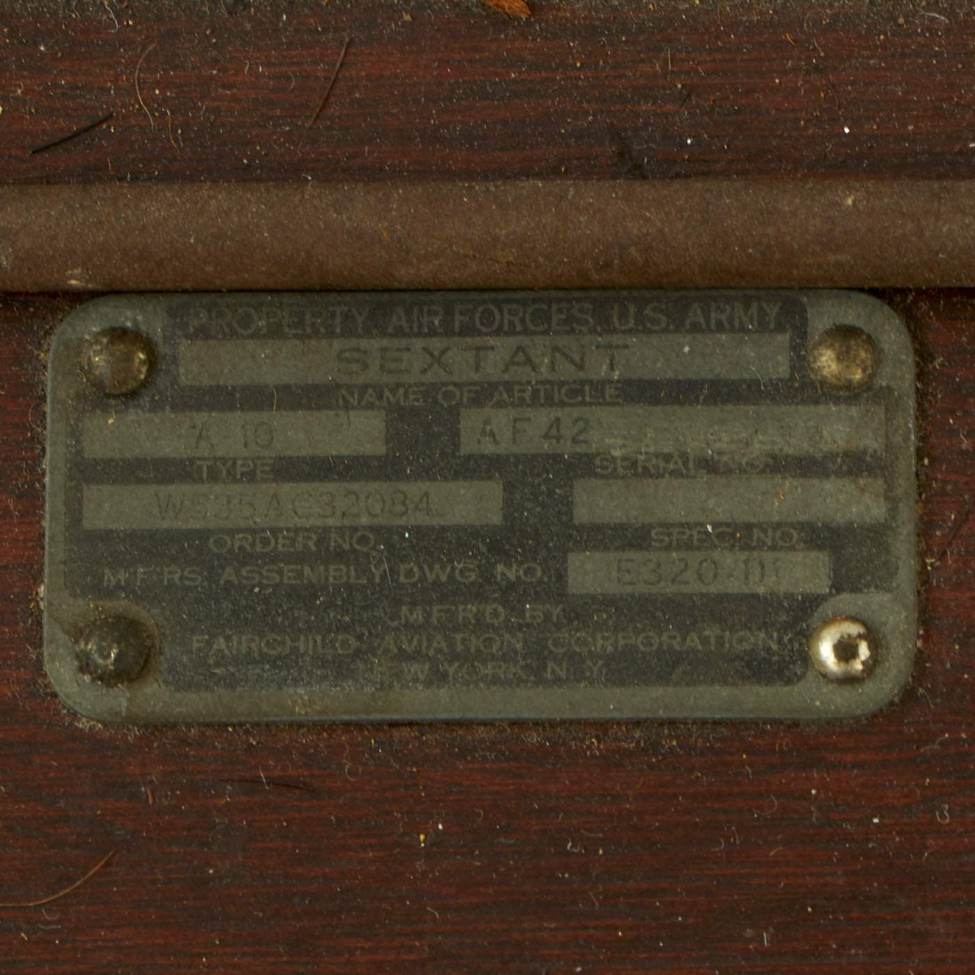This WWII Fairchild USAAF A-10 Sextant was issued during World War two to personnel from the U.S. Army Air Forces (USAAF). It has an original data plate, which is somewhat faded, but the "42" in the serial number can still be seen, which indicates 1942 manufacture. The sextant comes complete with the issue wooden box, which has multiple compartments to house the different components of the apparatus and offered in very good condition.