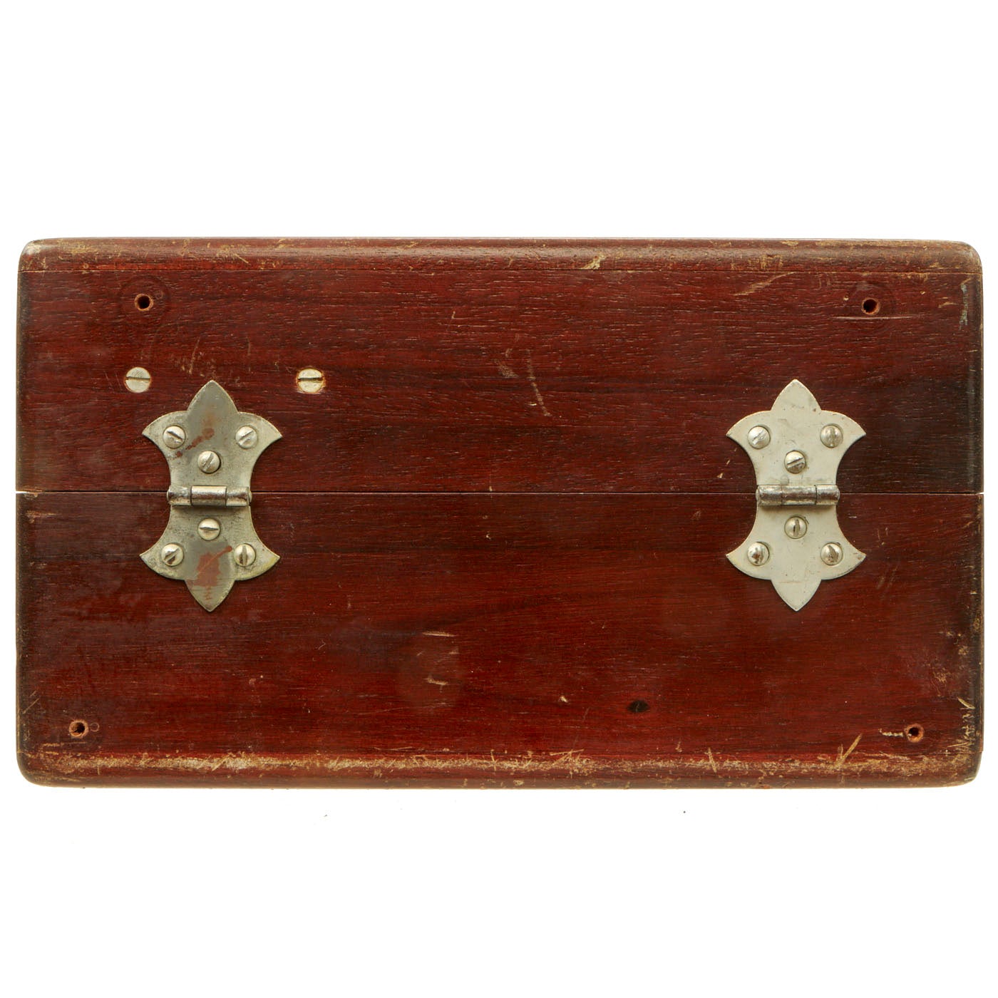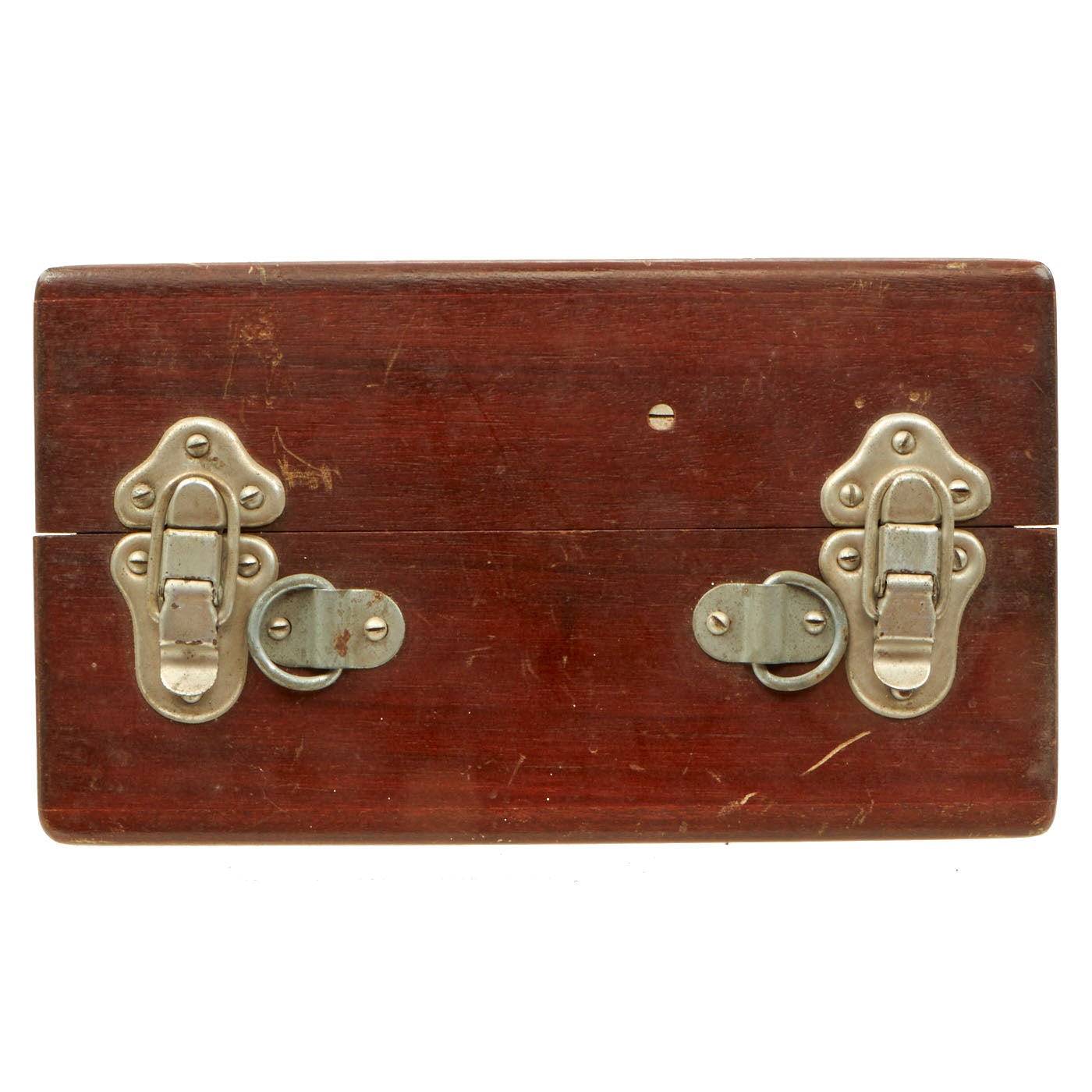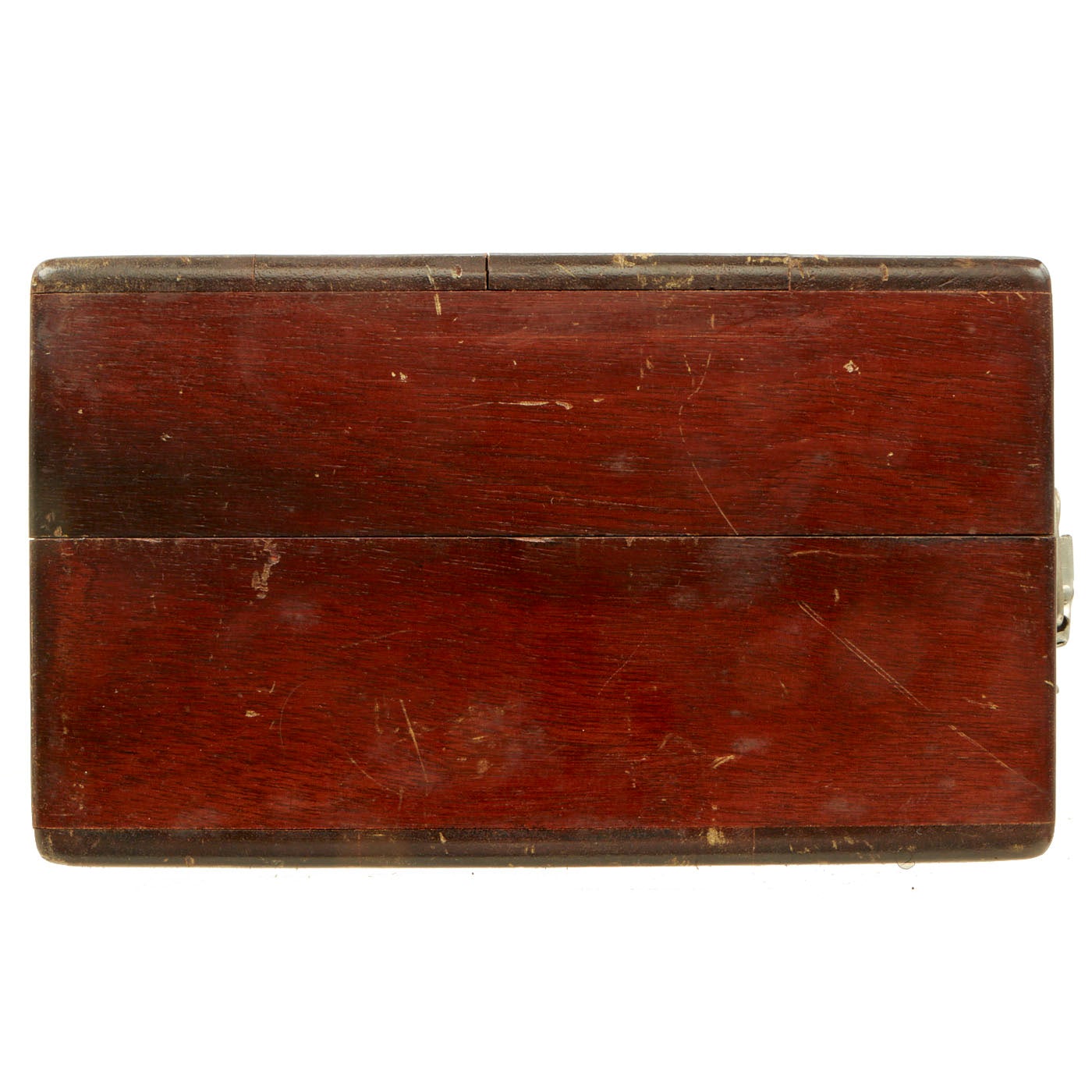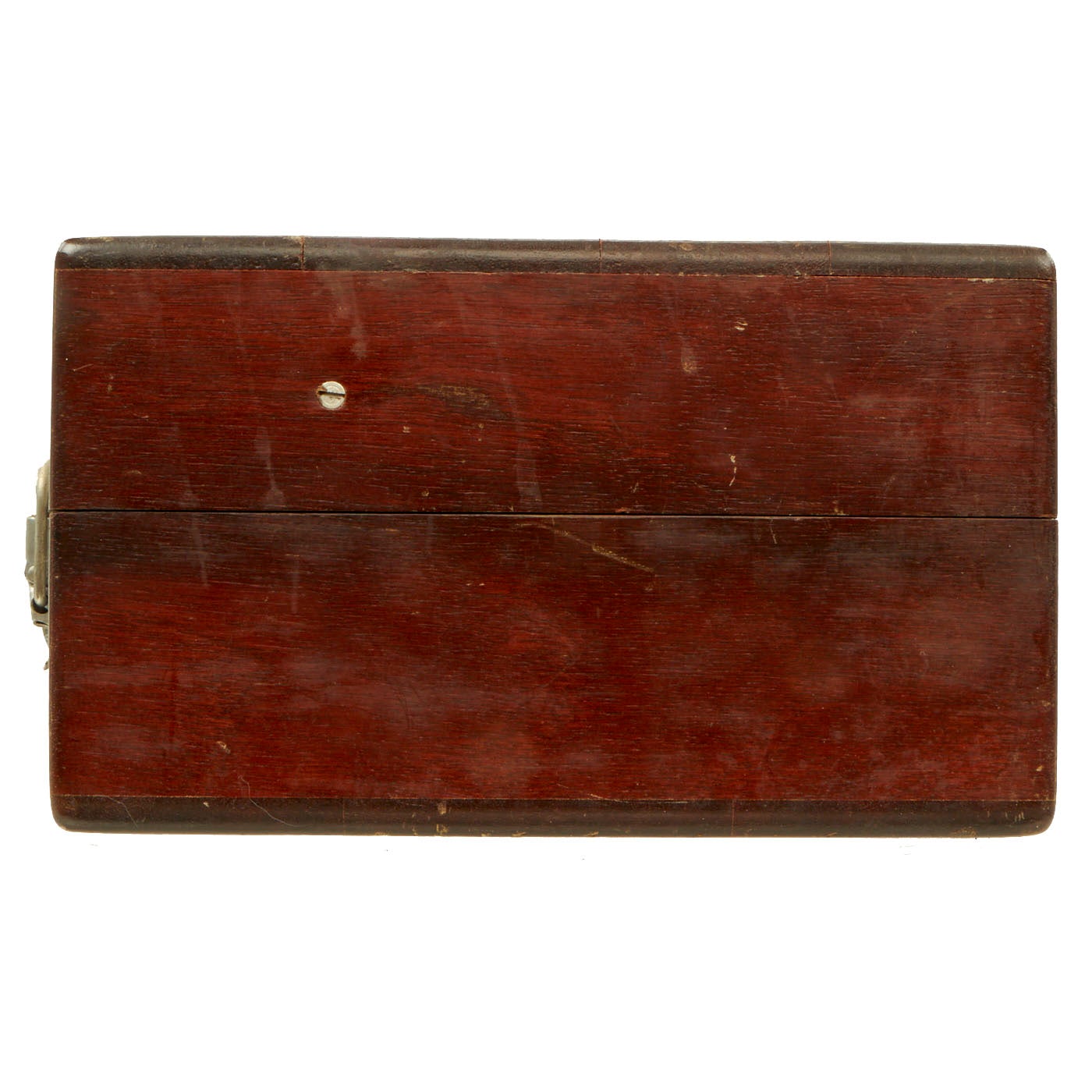 The sextant comes complete with the issue wooden box, which has multiple compartments to house the different components of the apparatus and offered