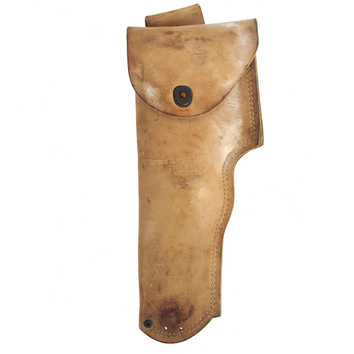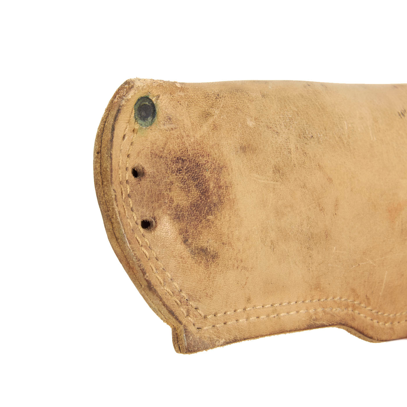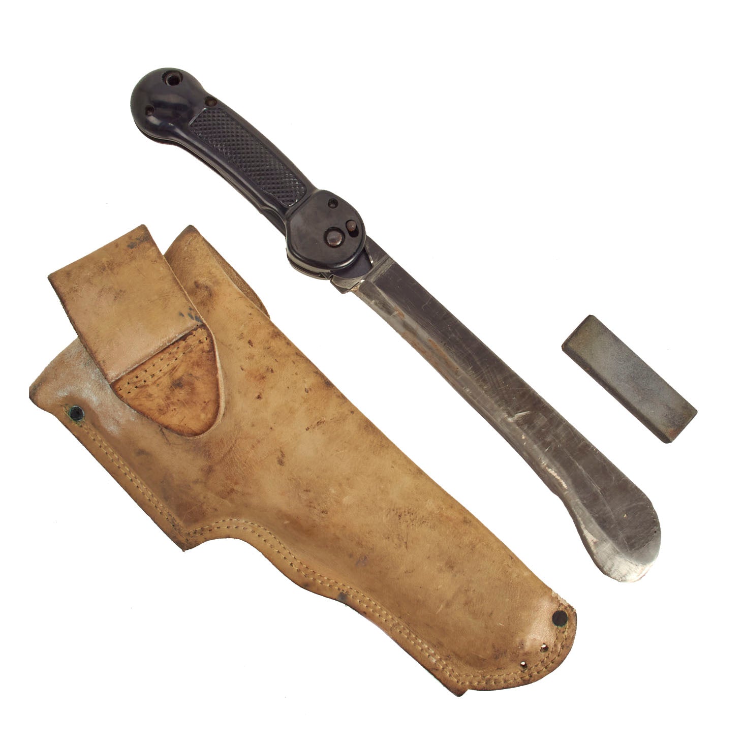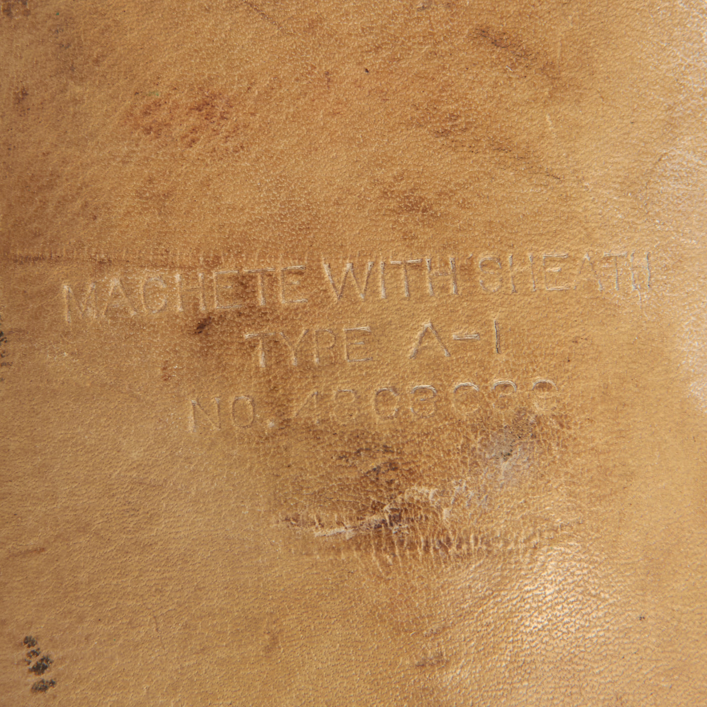The Folding Machete comes with an original sharpening stone and white / gray colored leather scabbard with flap and belt loop. It is marked MACHETE WITH SHEATH / TYPE A-1 / NO. 48C3639. on the front. The scabbard and sharpening stone are in used but very good condition. There is some staining on the exterior of the scabbard, but the swivel on the belt loop is still functional, and all stitching is intact.