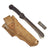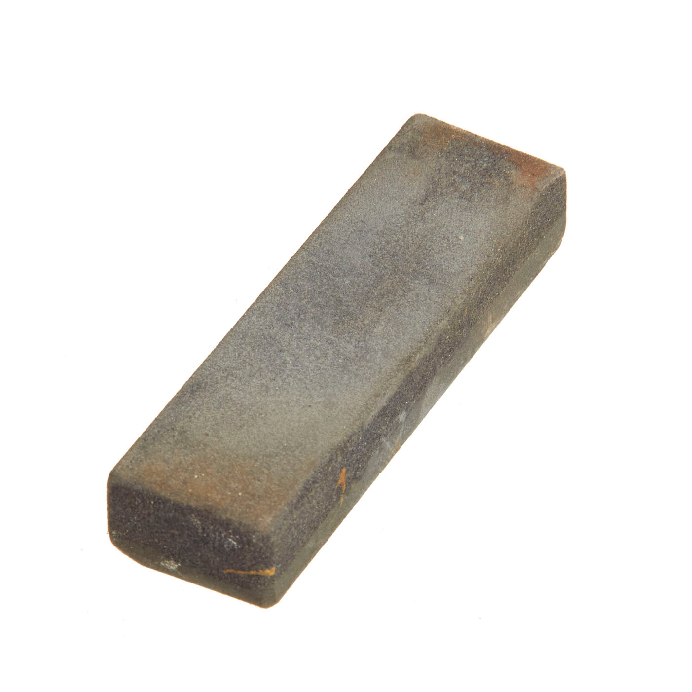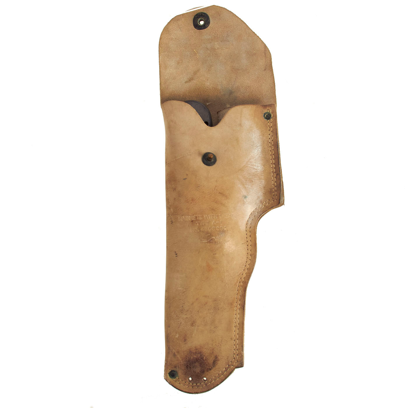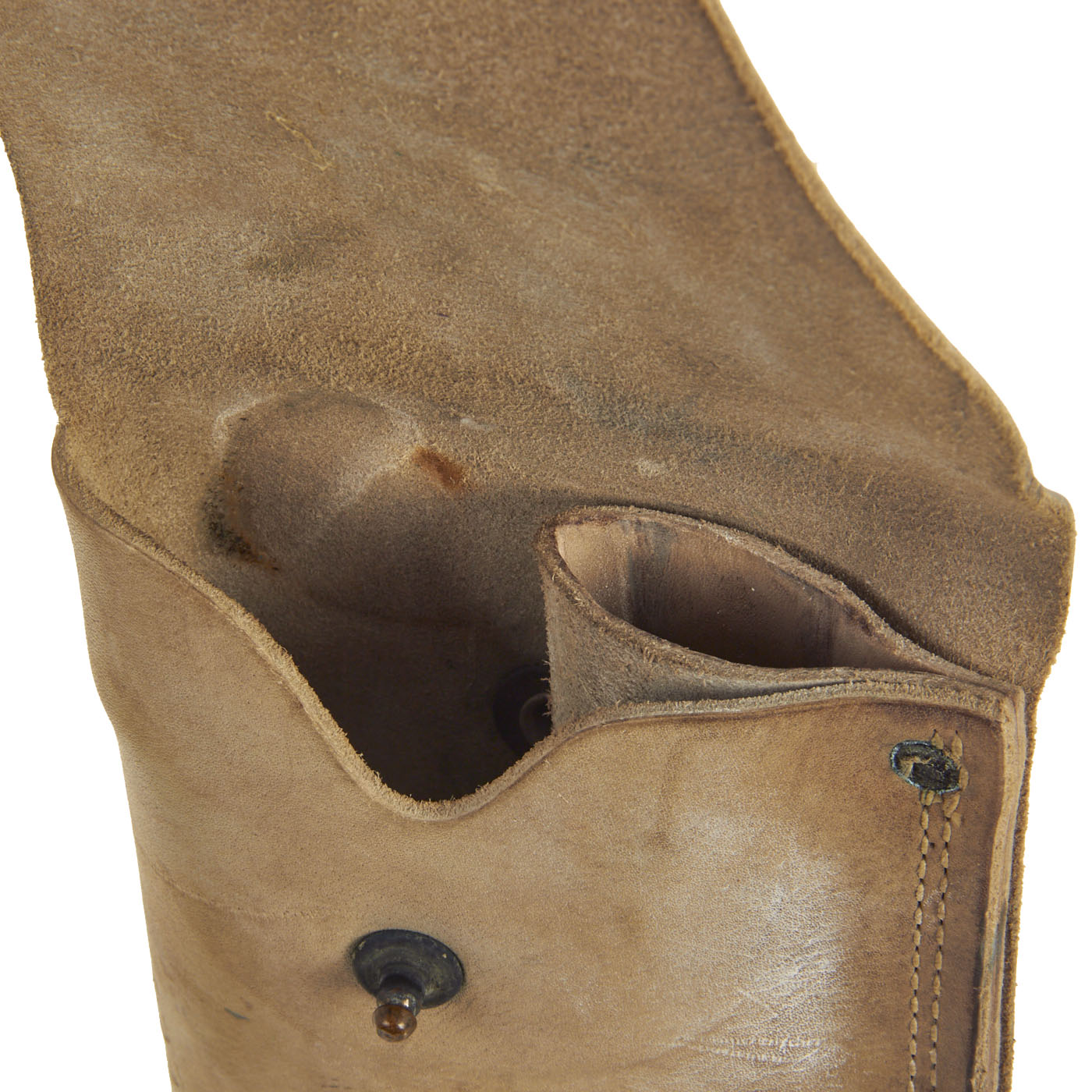 The Folding Machete comes with an original sharpening stone and white / gray colored leather scabbard with flap and belt loop. It is marked MACHETE WITH SHEATH / TYPE A-1 / NO. 48C3639. on the front. The scabbard and sharpening stone are in used but very good condition. There is some staining on the exterior of the scabbard, but the swivel on the belt loop is still functional, and all stitching is intact.