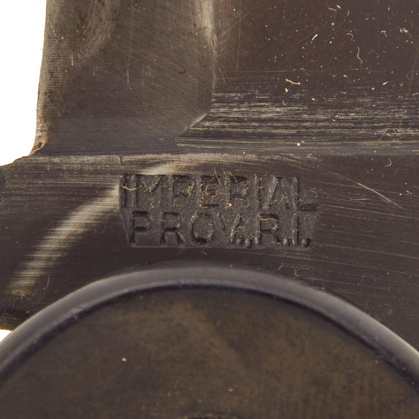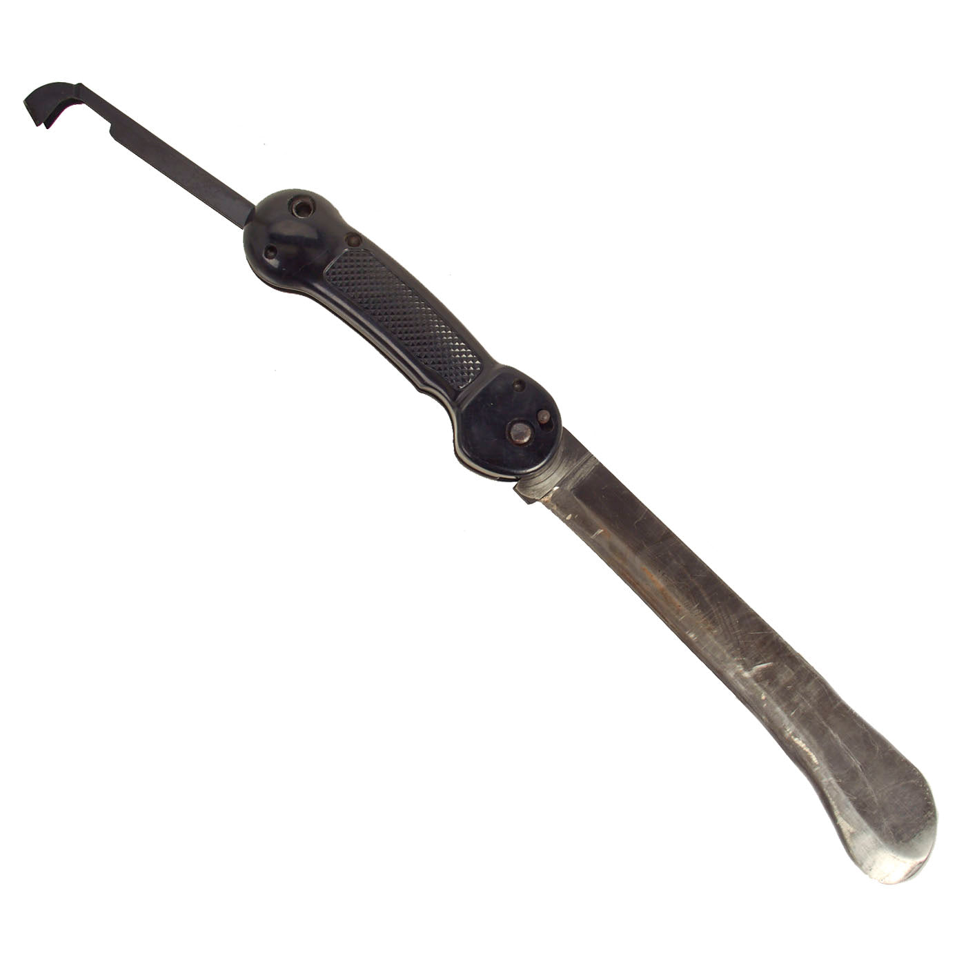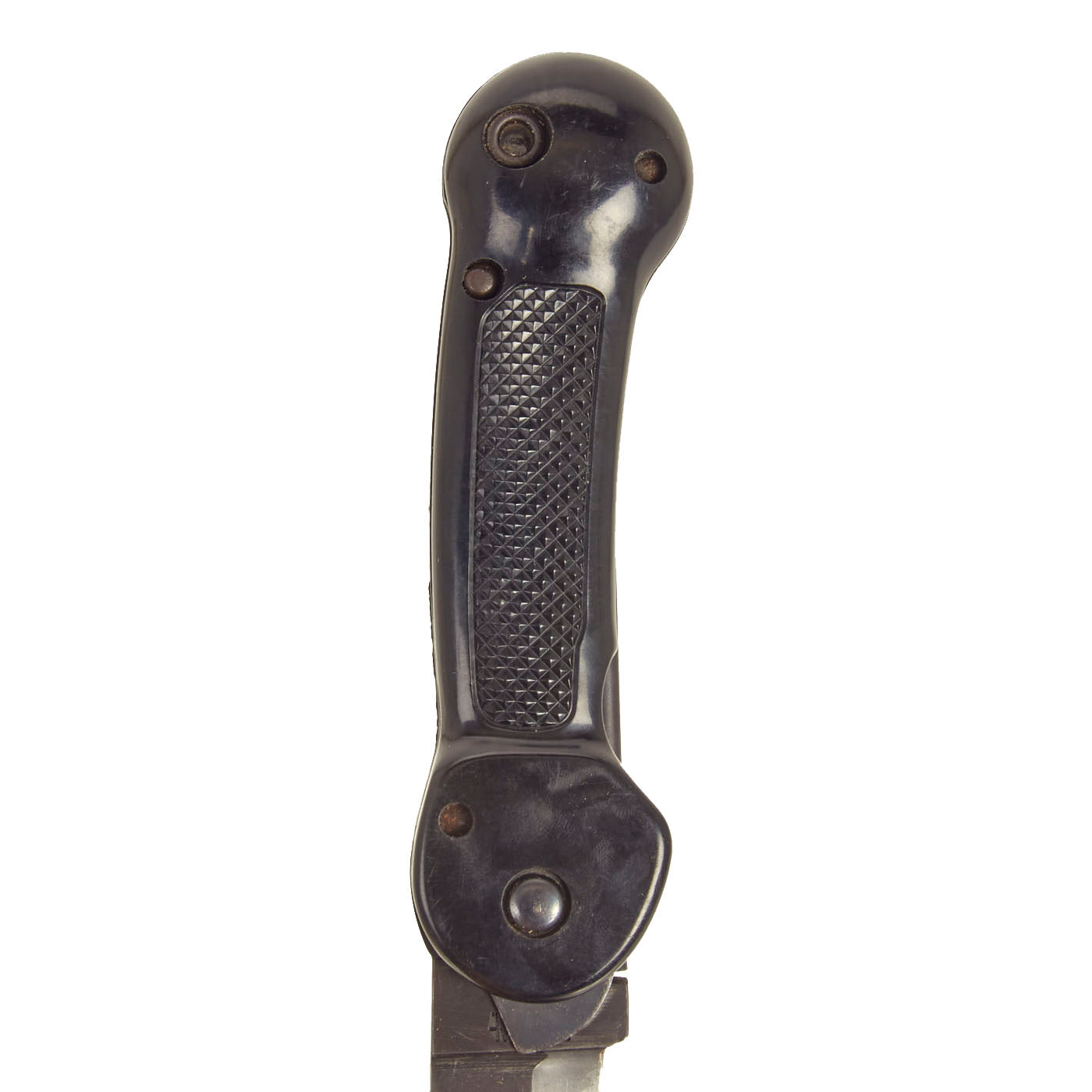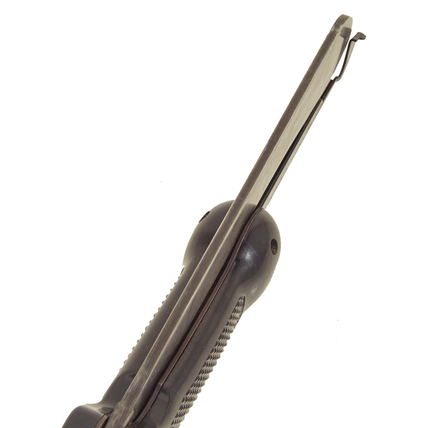 Original Item: Only One Available. This is a great example of a World War II U.S. Army Air Force Type A-1 folding machete survival knife. These were manufactured by Imperial Knife Co. Providence RI. as stamped on left ricasso: IMPERIAL / PROV. R.I.. Adopted by the US Military in 1942 for the B-4 emergency bail out kit usually attached to the parachute harness. The machete has checkered black plastic grip panels and a blued steel blade. There is a guard system built into machete that when closed, the metal guard protects the blade. When open, the guard flips closed to lock the blade in place with a small thumb button, which must be pushed back to the release the guard and close the blade.