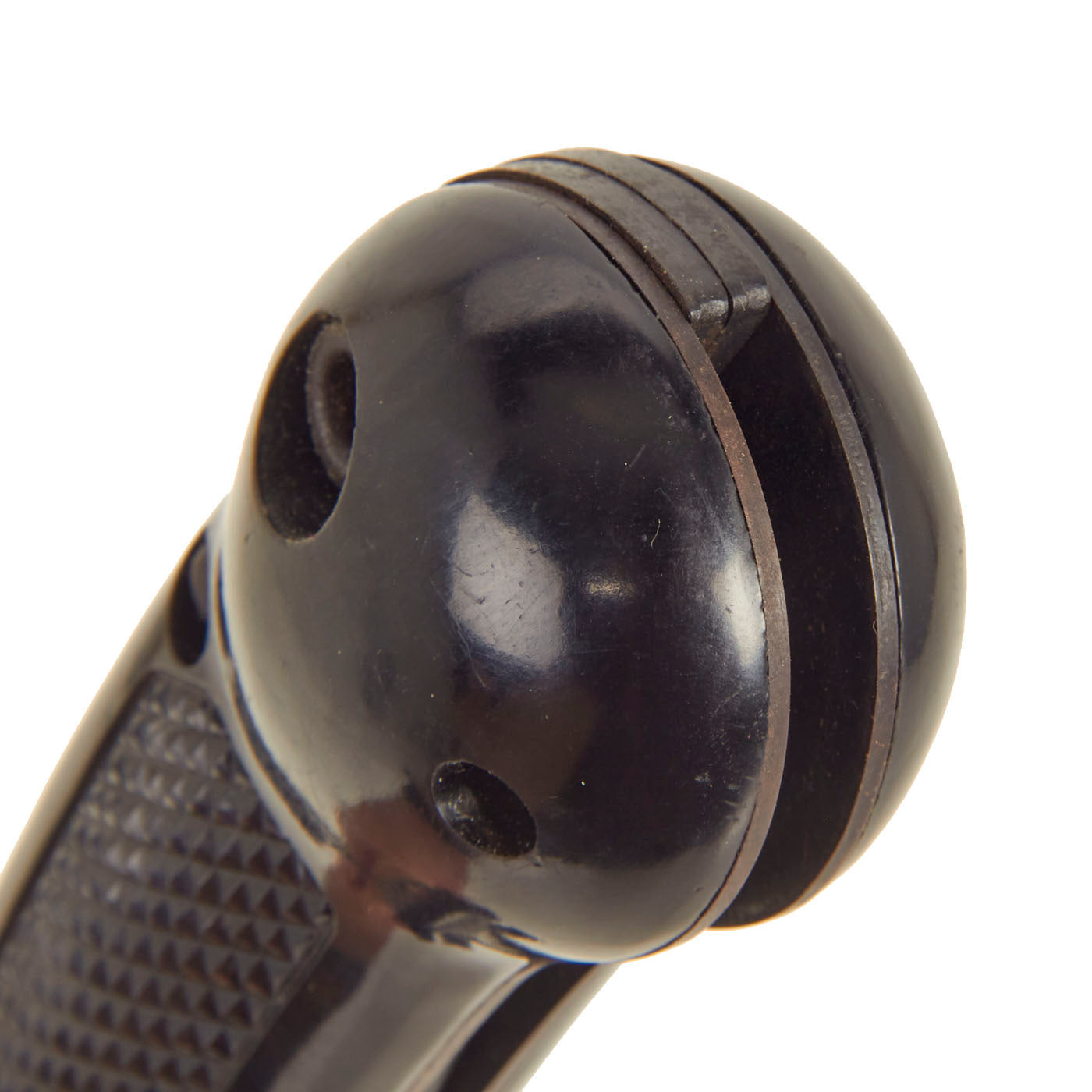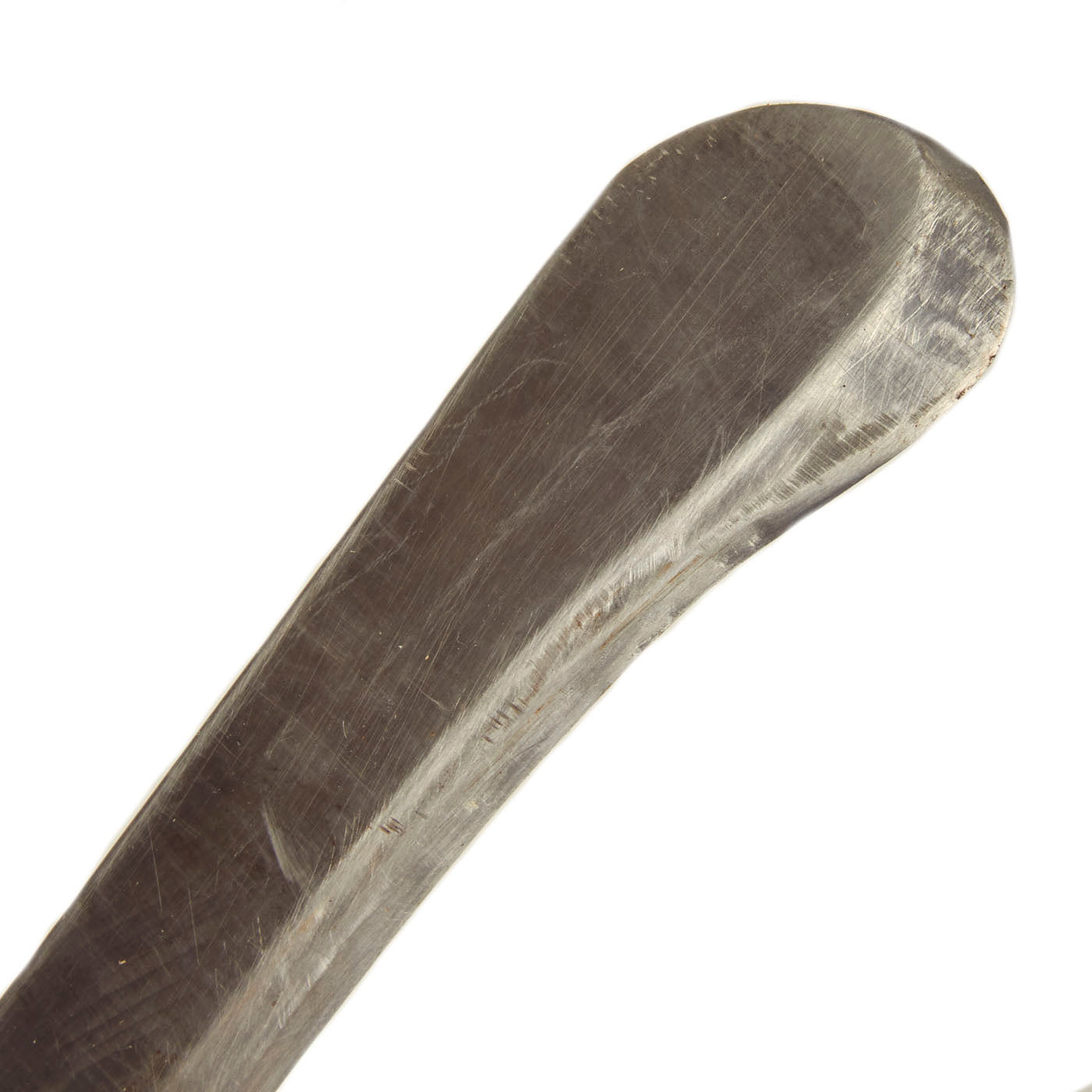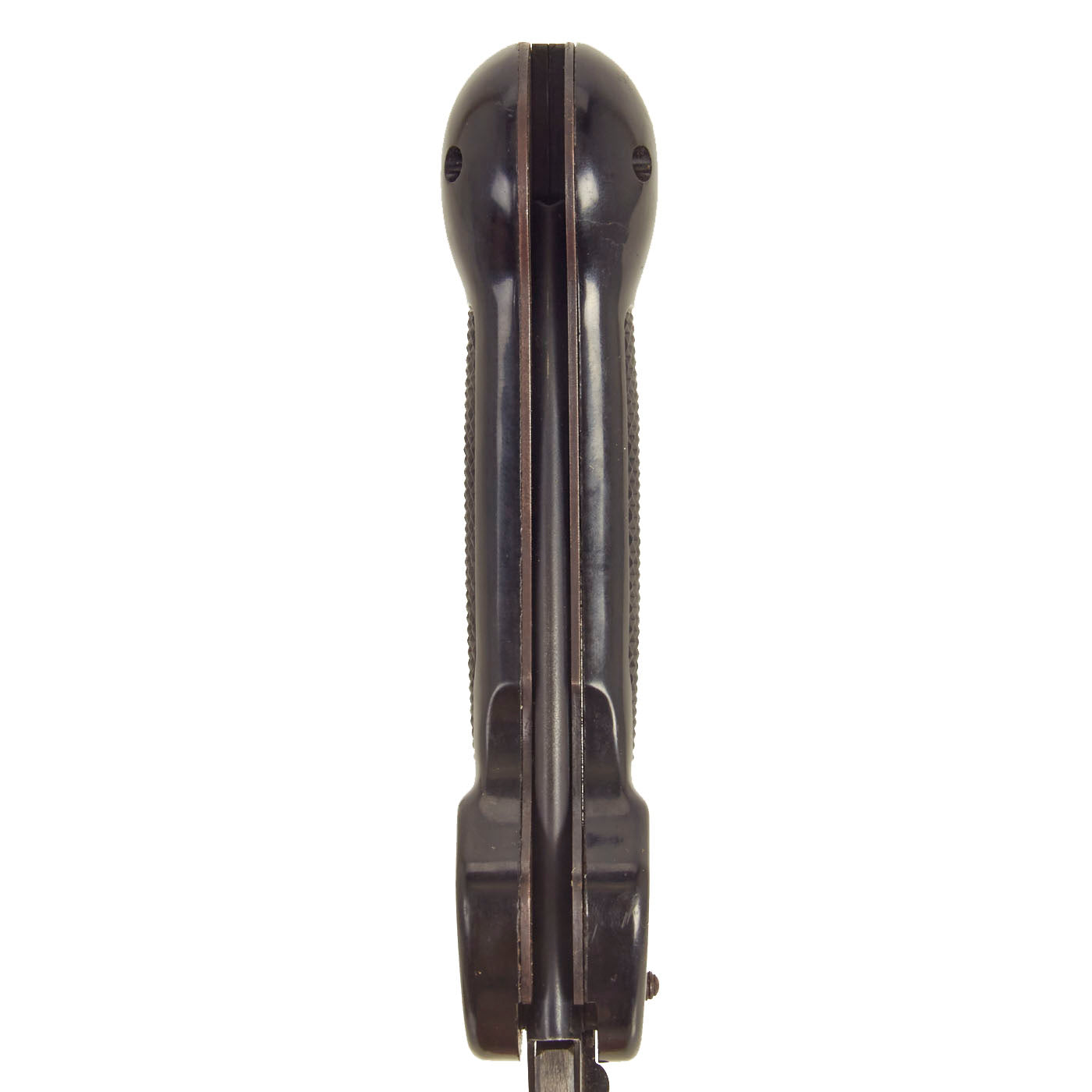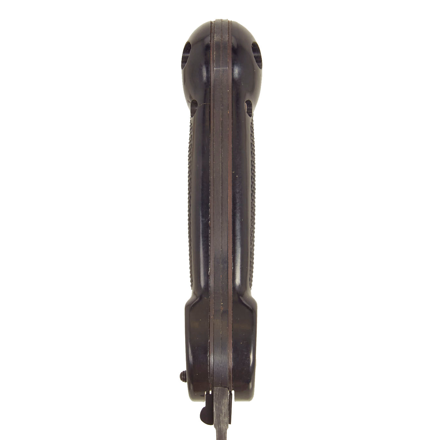 The blade on this example is in very good condition, with the original shape well retained, and no edge nicks or chips. It has been sharpened several times and cleaned, which has worn the original blued finish, except on the ricasso. The blade guard is in excellent condition, showing no real damage or oxidation. The grips are in very good shape, showing minimal wear, though there is a stress crack running across the lower right scale running from one of the securing rivets.