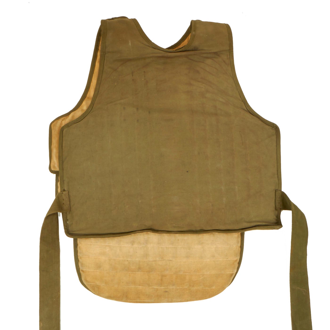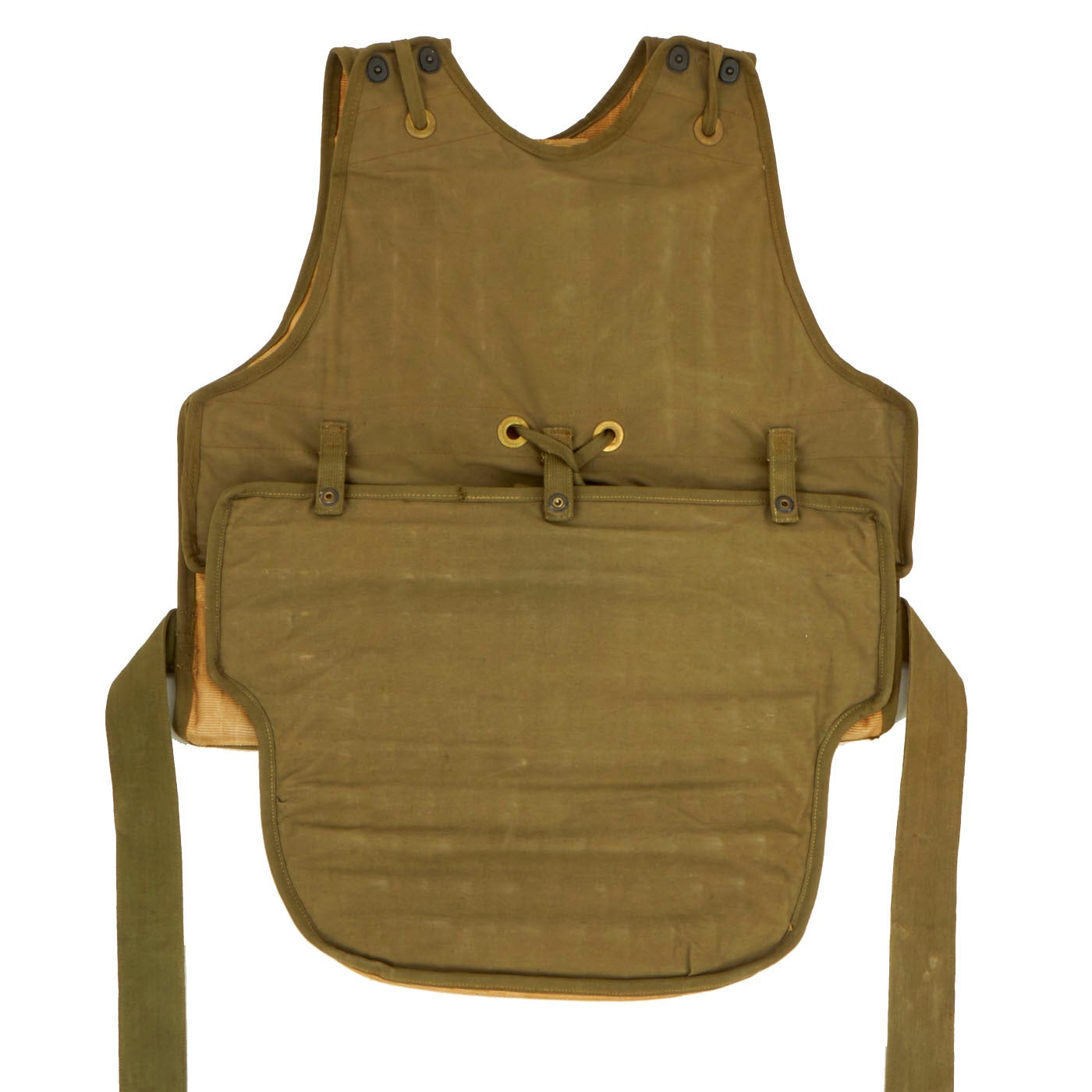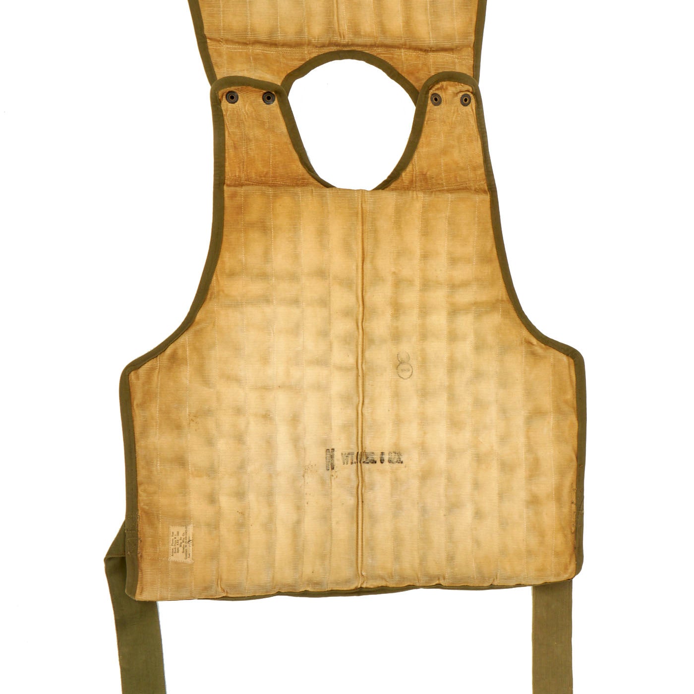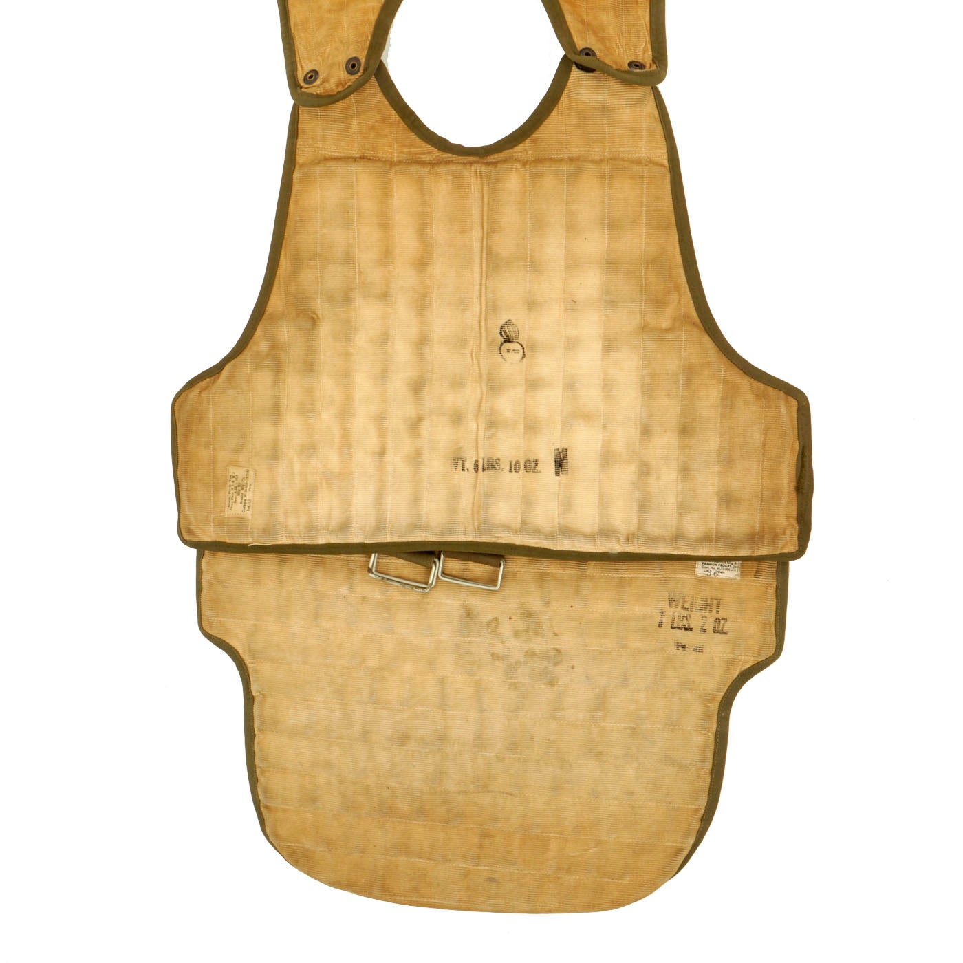 This is a genuine, very good condition mostly complete USAAF Armor, Flyer's Vest, M1 & M2 complete with data labels, though they are faded. This flak vest is made up of both armored front and back pieces, so it was intended for a crewman, and not a pilot. The condition is very good, though there is a bit of paint missing on the snaps. It appears as if all of the snaps, buckles and belts are present and they are complete and without damage. As stated this is a very cumbersome, bulky and heavy piece of equipment. The following is the information for each piece of the jacket: