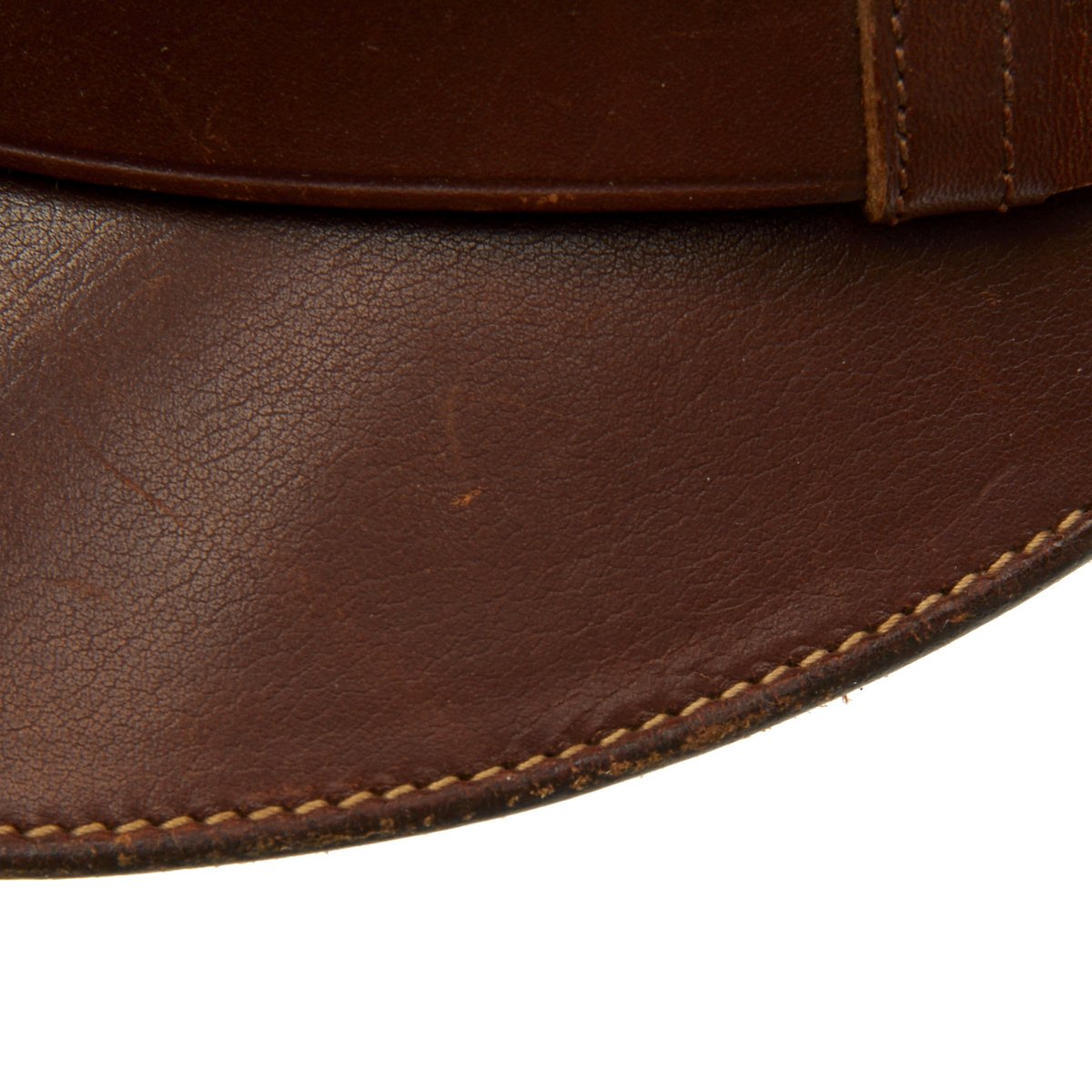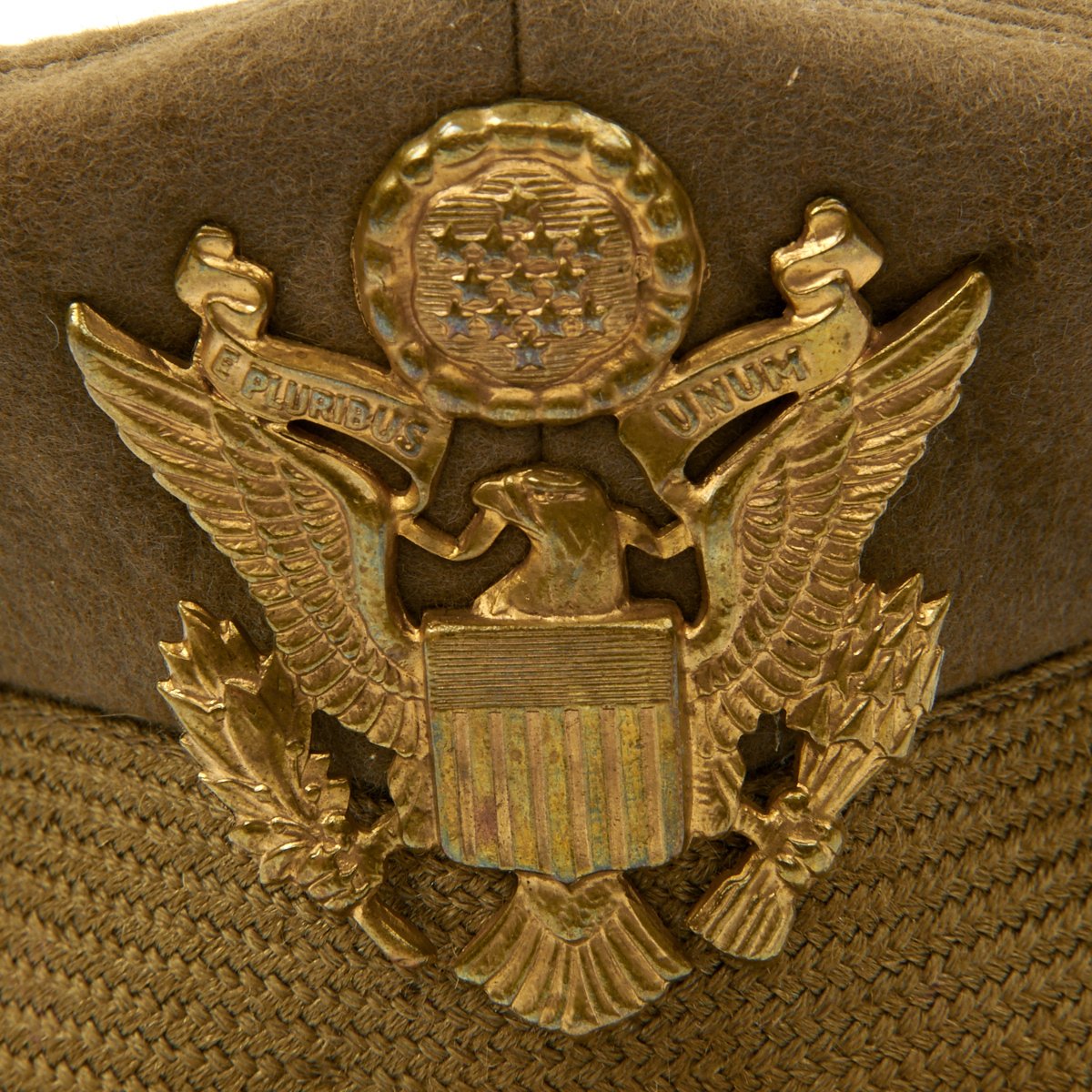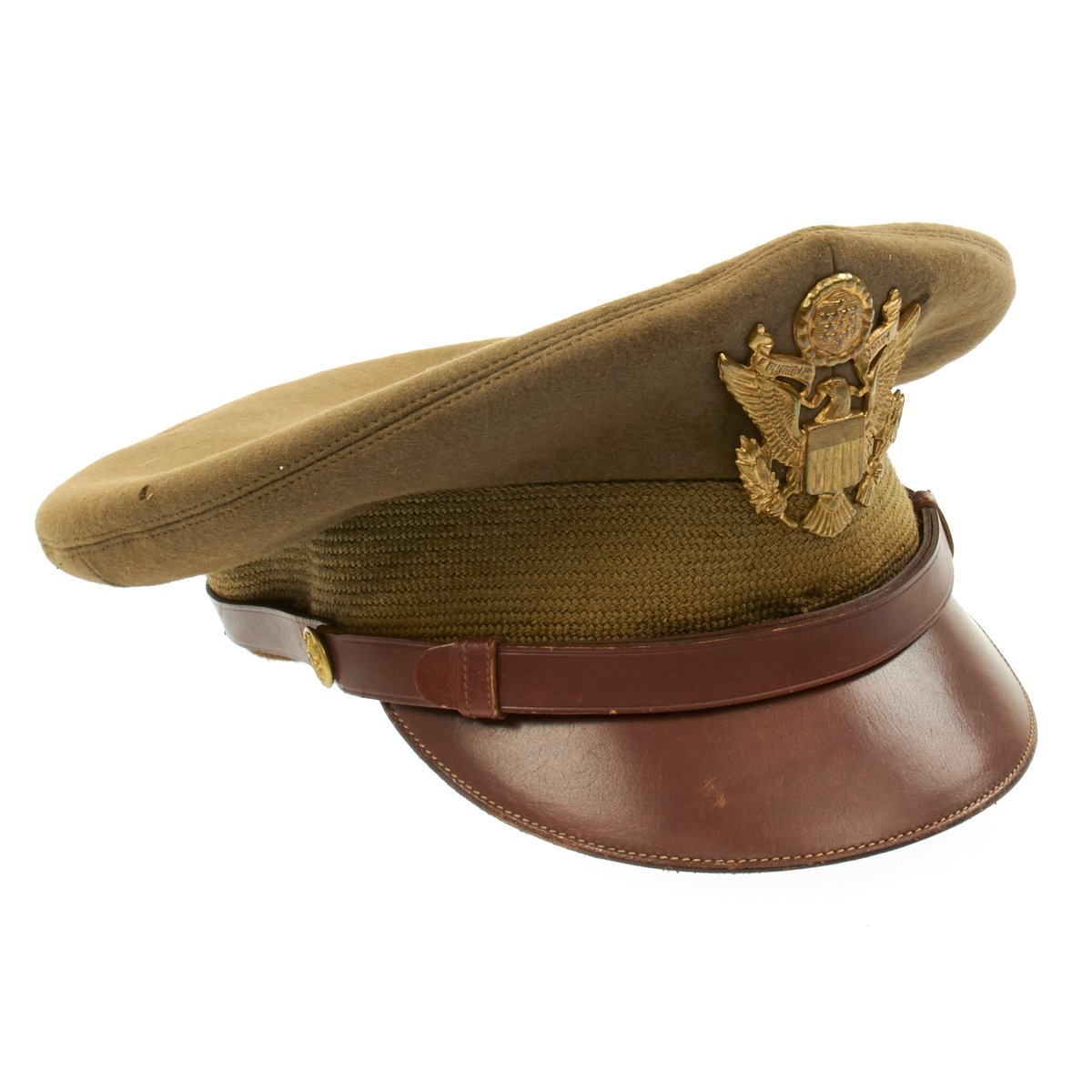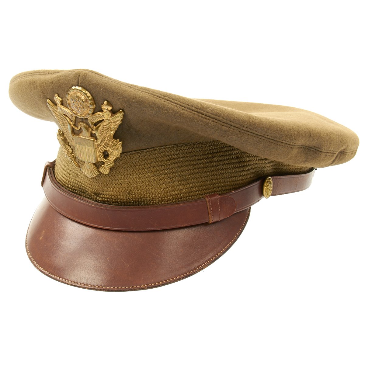 This is the classic "bomber pilot" headgear, worn by USAAF pilots in Europe and the Pacific. Actually, this was the standard Army/AAF officer's dress cap, worn by pilots and non-pilots alike, but pilots gave this cap their own unique twist. Normally, this cap had stiffeners -- a support piece behind the cap device and a wire around the inside top perimeter to maintain the cap's round shape. These kept the cap in its proper, regulation military shape and angle. However, since bomber pilots wore headsets over their caps during flights, they would remove the wire stiffener to make headset wear more comfortable, causing the sides of the caps to become crushed. Eventually, the caps retained their floppy "crushed" look, giving the pilot who wore it the look of a seasoned veteran.