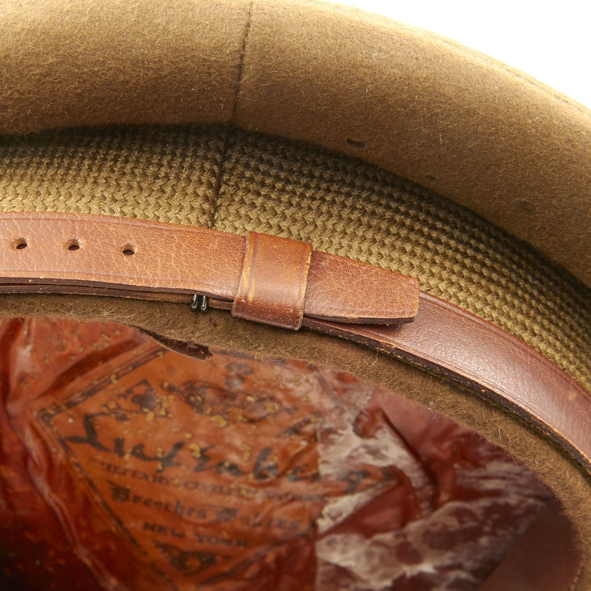 The sweatband is also embossed Luxenberg with address. The crown of the hat also bears a Luzenberg logo. Of note is that the chinstrap is the style that goes fully around the head with a buckle in the rear which were very popular with pilots and these were a deluxe addition which was a clear sign of a top quality hat.