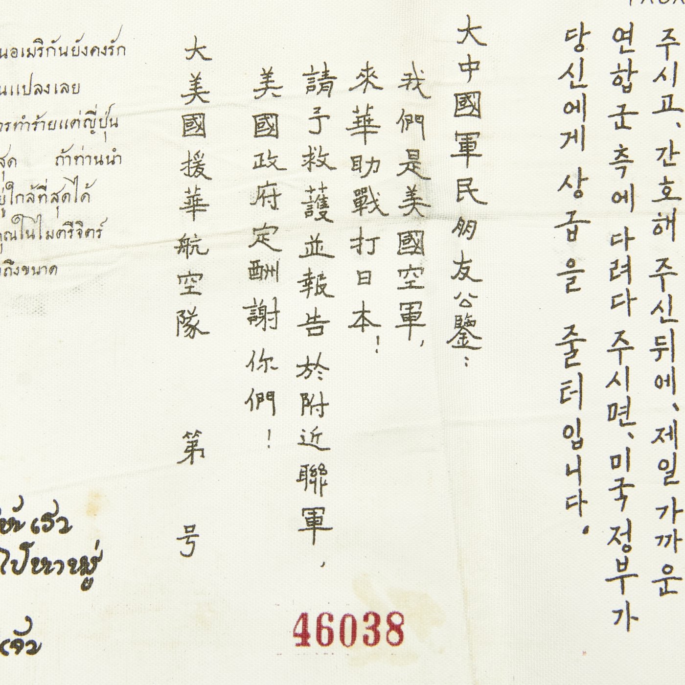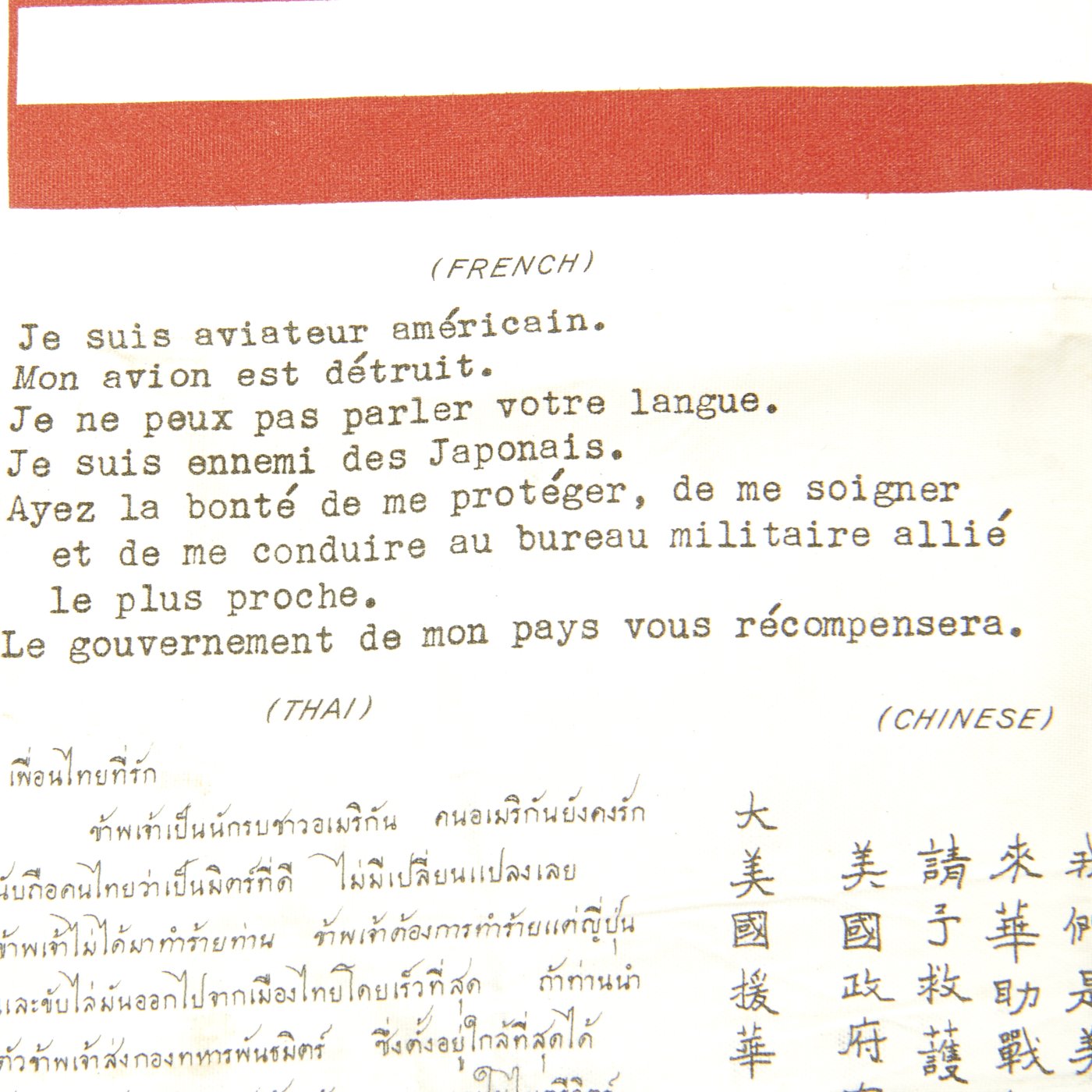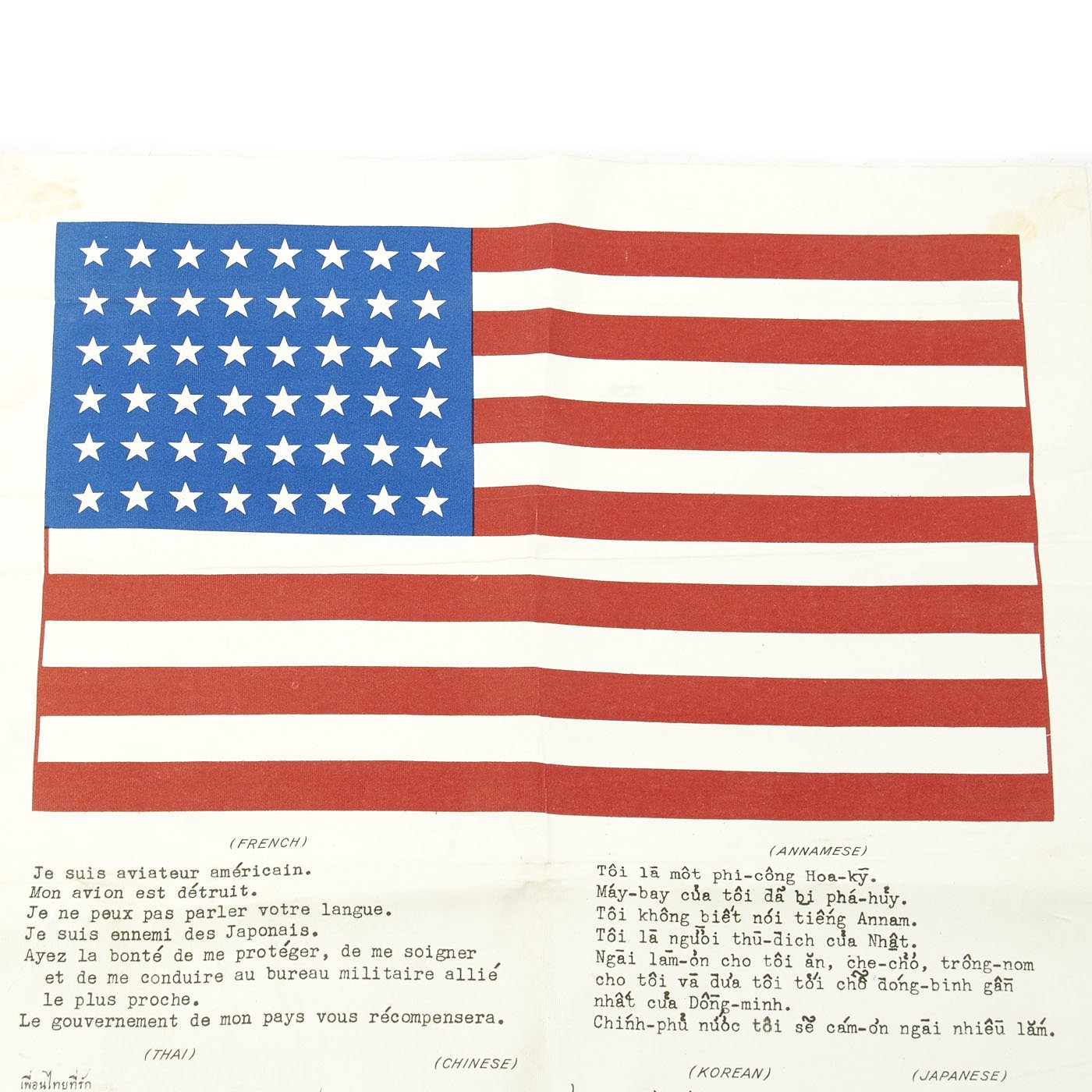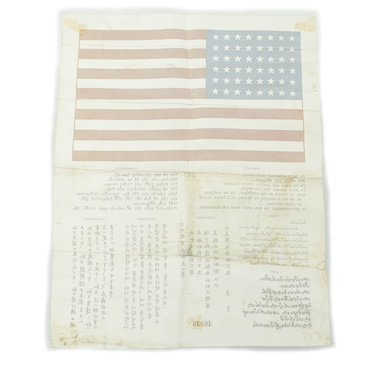 Original Items: Only One Set Available. This is an excellent condition silk blood chit from World War Two. It is a printed 48 Star American Flag and a message printed in 7 languages. Control number 46038, measures approximately 9 x 12 inches. This would have been stitched to the back or inside lining of a U.S. Aviator flight jacket.