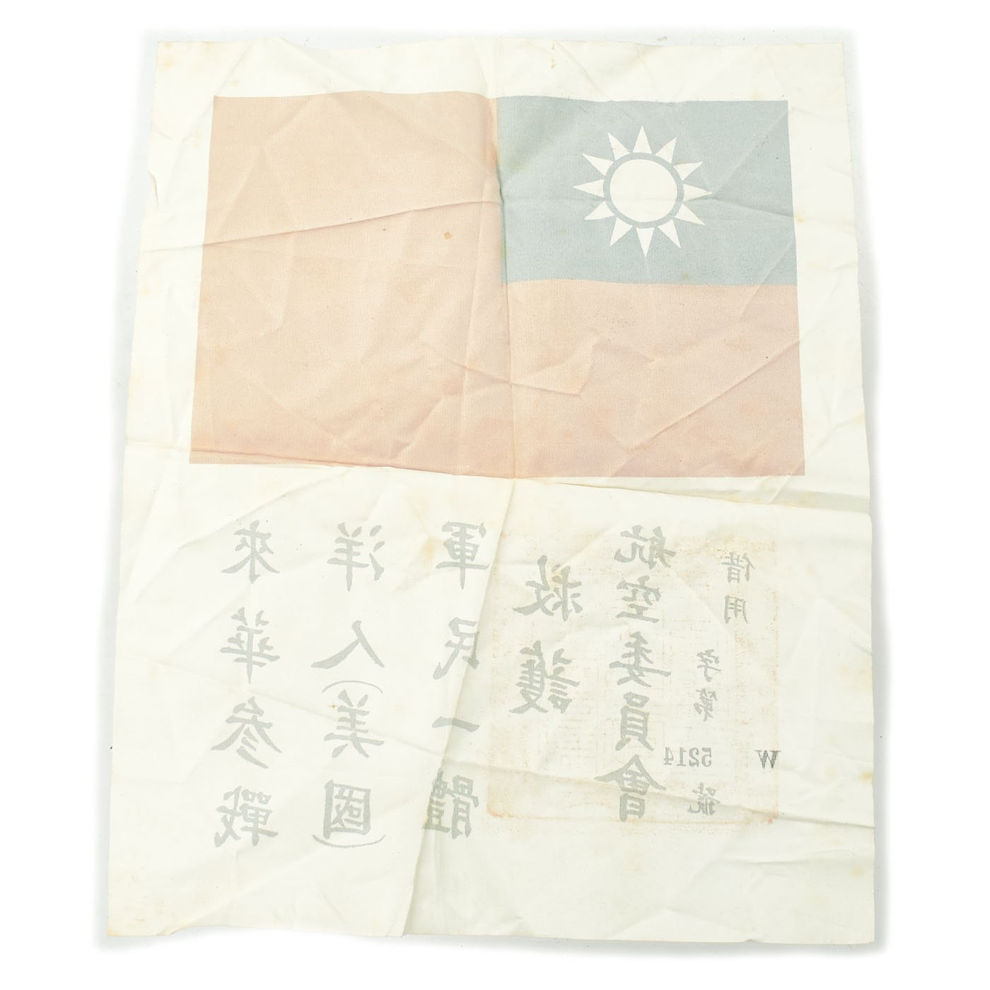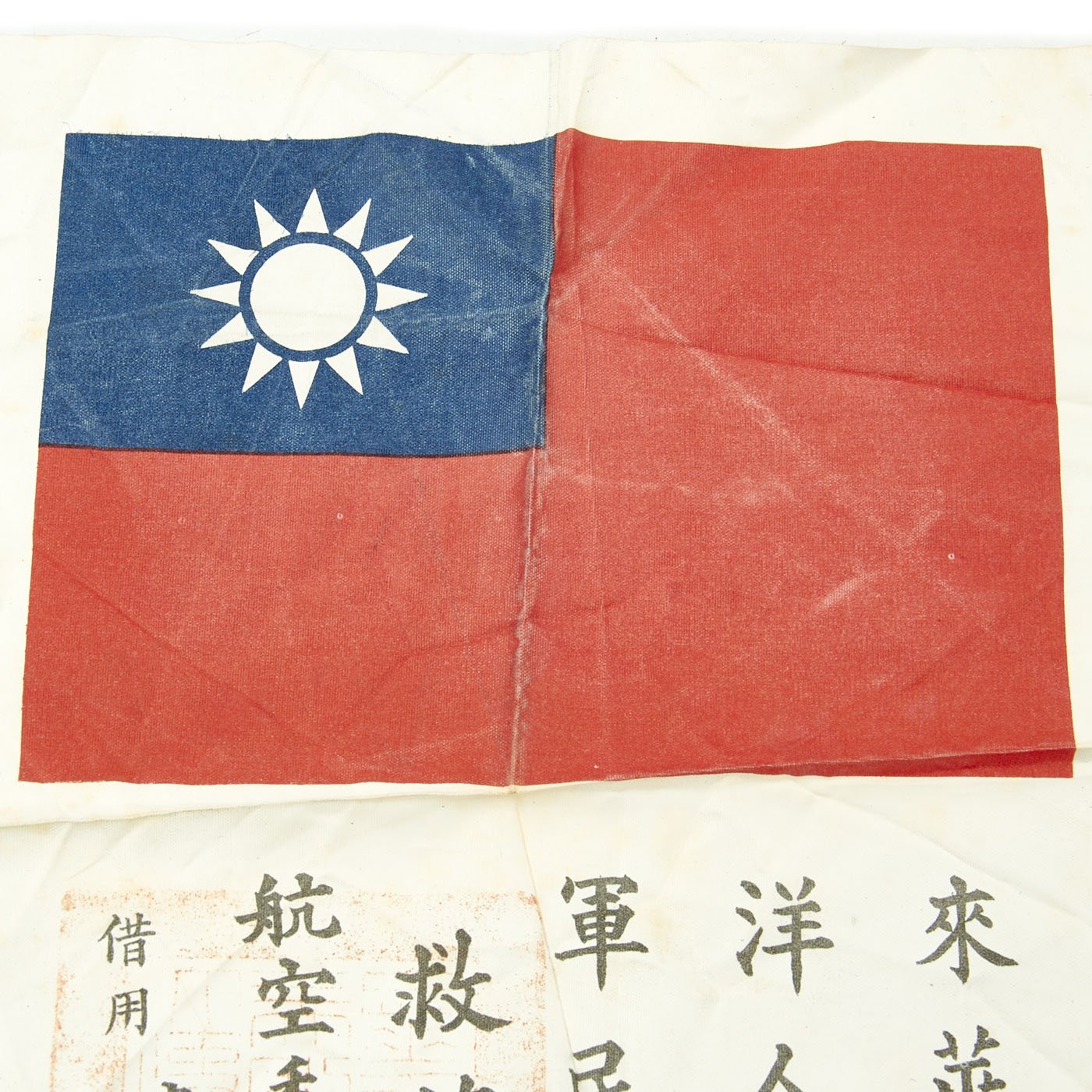 Original Items: Only One Set Available. These are excellent condition silk blood chit. A World War Two printed Chinese National Flag with Chinese Characters and a temple stamp. It measures 10 1/2 inches by 8 1/2 inches. This would have been stitched to the back or inside lining of a U.S. Aviator flight jacket.