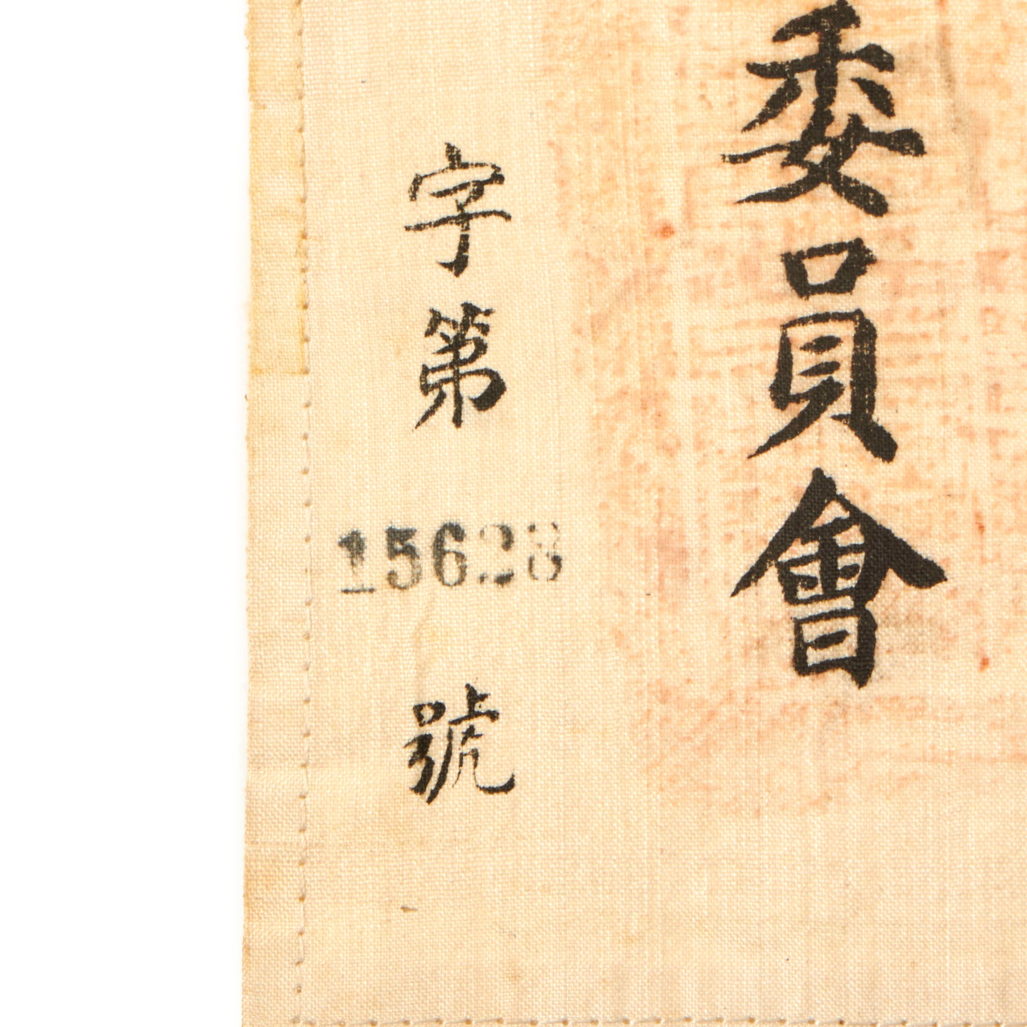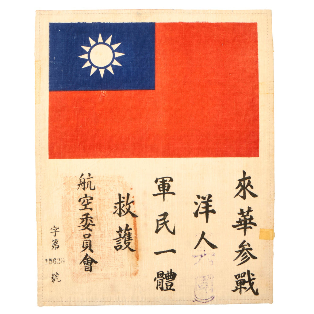 Original Items: Only One Set Available. This is an excellent condition, original pectin-treated silk blood chit. It bears a World War Two printed Chinese National Flag with Chinese Characters and a temple stamp. It measures approximately 7 ¾ inches by 9 ⅝ inches. This would have been stitched to the back or inside lining of a U.S. Aviator flight jacket. This example is marked with identification number 15628, and these are part of the standard contents of a China Burma India Survival set. Condition is very good, with just a bit of staining as one small crease from folding.