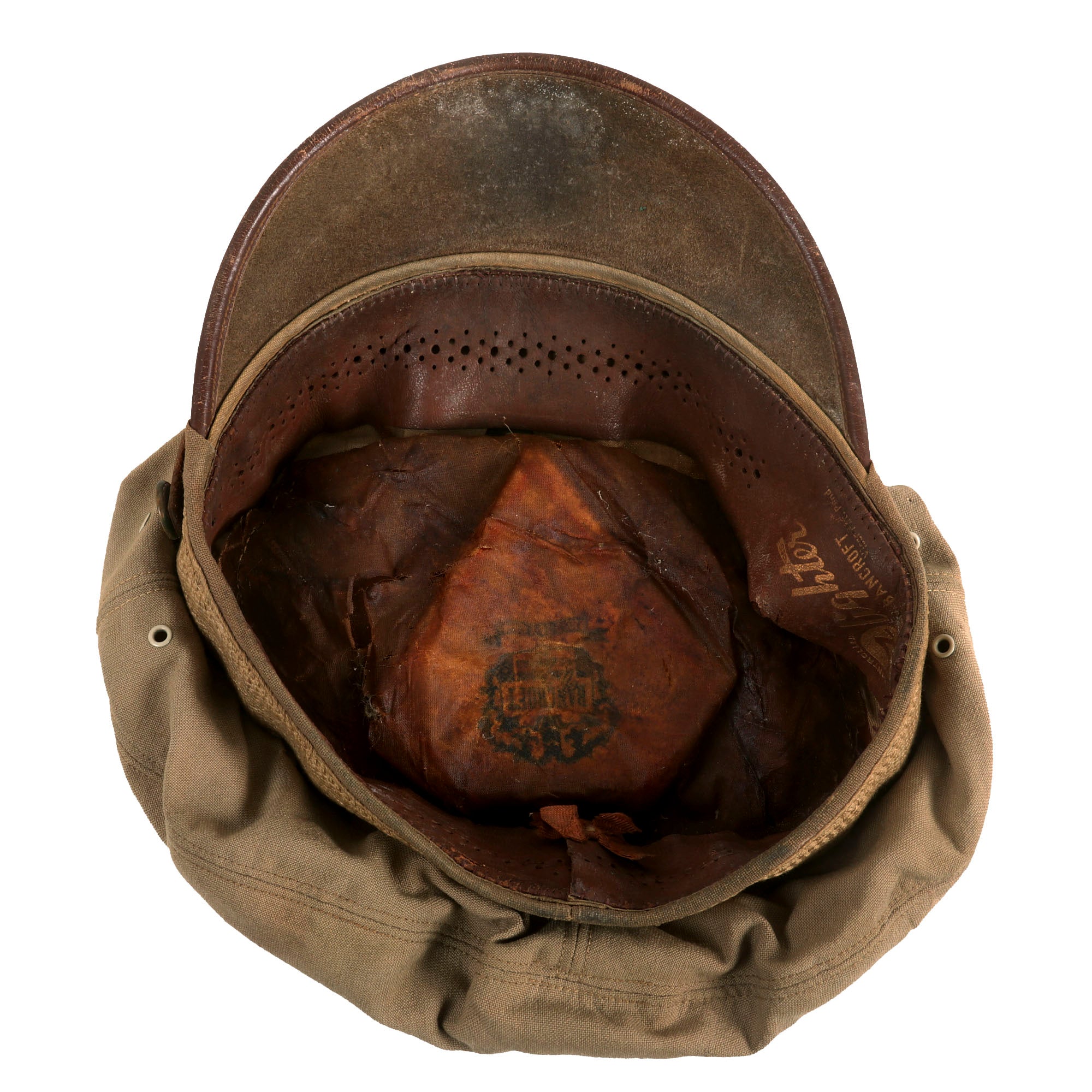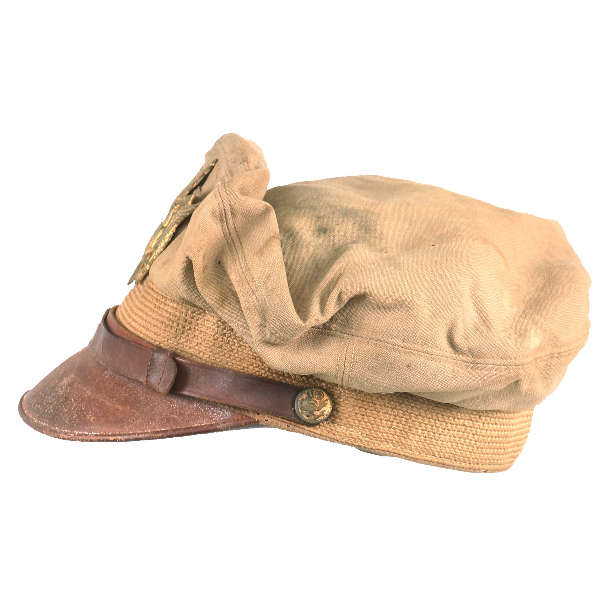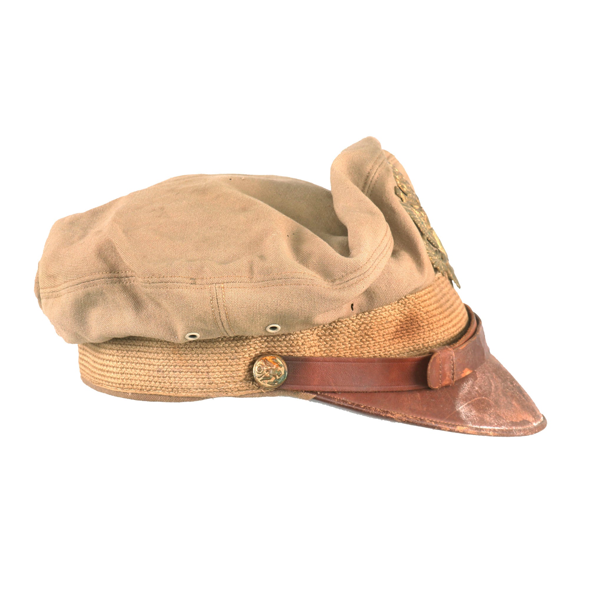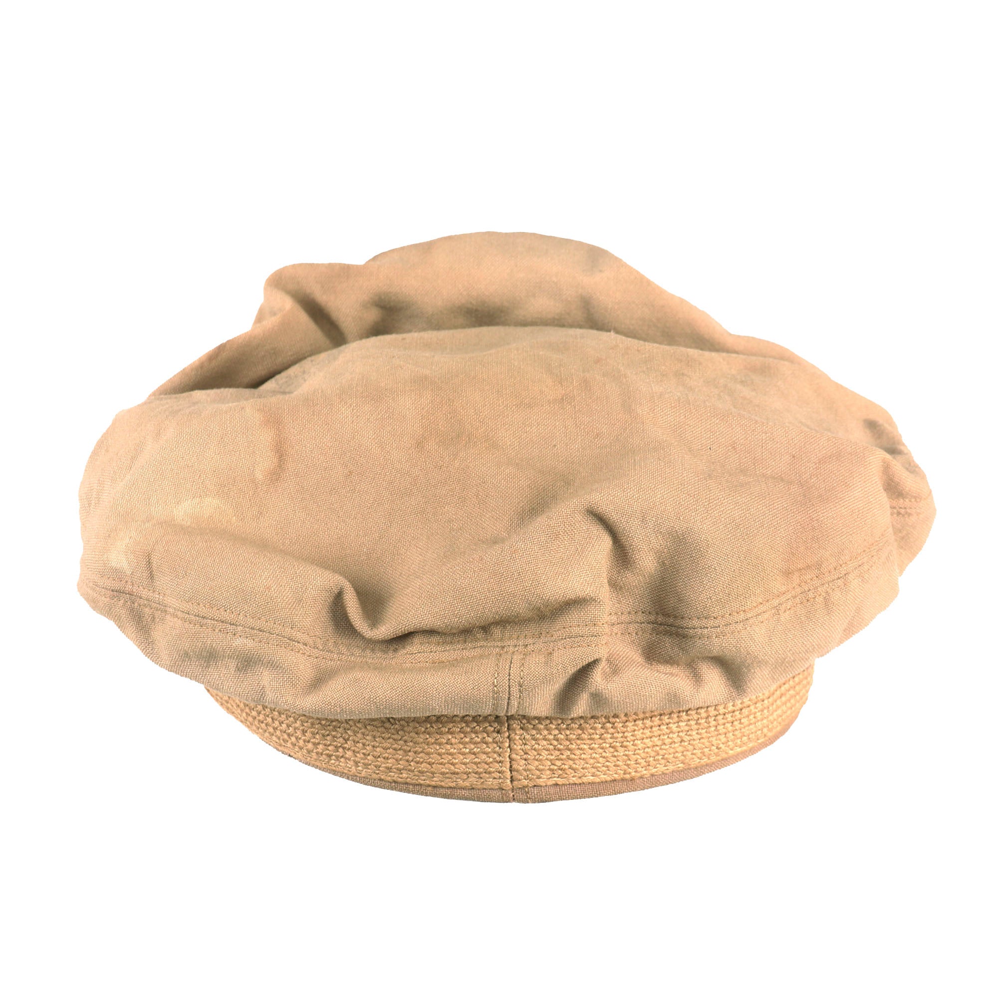 During World War II, the U.S. Crusher Cap, also known as the “Fifty Mission Cap”, was a piece of headgear that gained popularity among military personnel. This particular cap was made by Bancroft and was issued in the Summer Khaki color scheme. The company's name is visible on both the crown and sweatband of the cap.