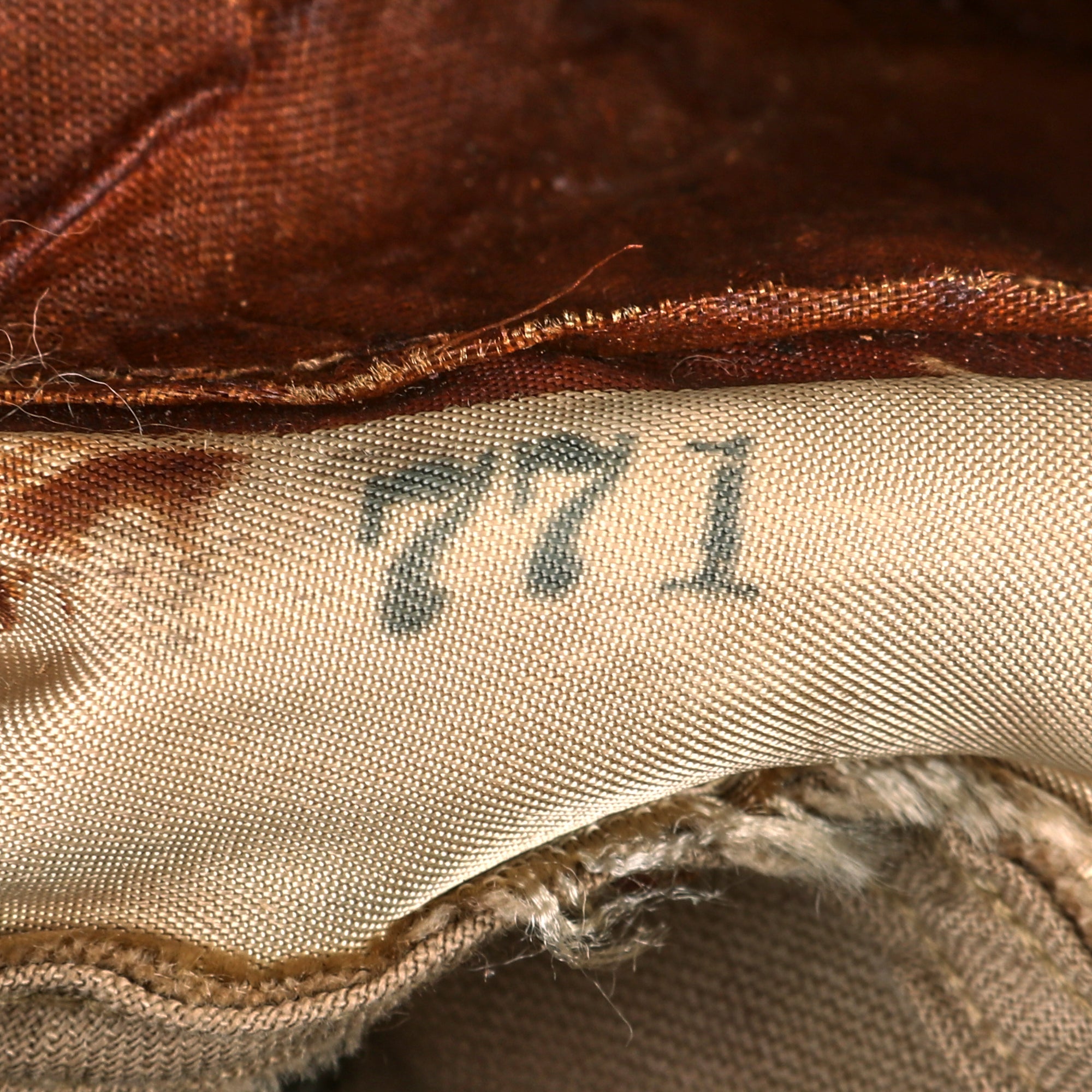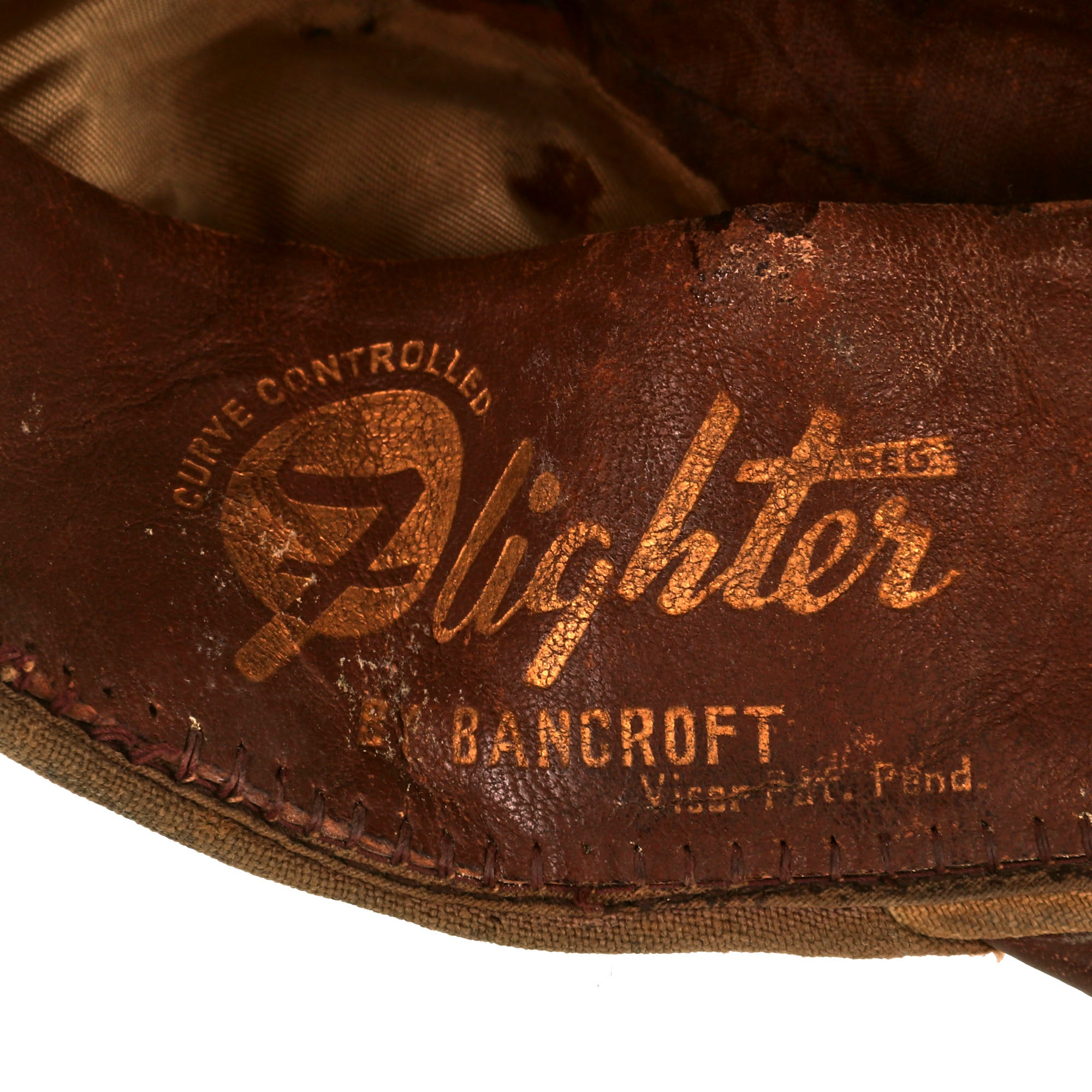 The sweatband of the cap is worth noting as it is embossed in gold with “FLIGHTER by BANCROFT.” The patent number and “Curve Control” are also visible on the sweatband. Moreover, the Bancroft label is still somewhat visible underneath the now stiffened weatherproof lining in the crown.