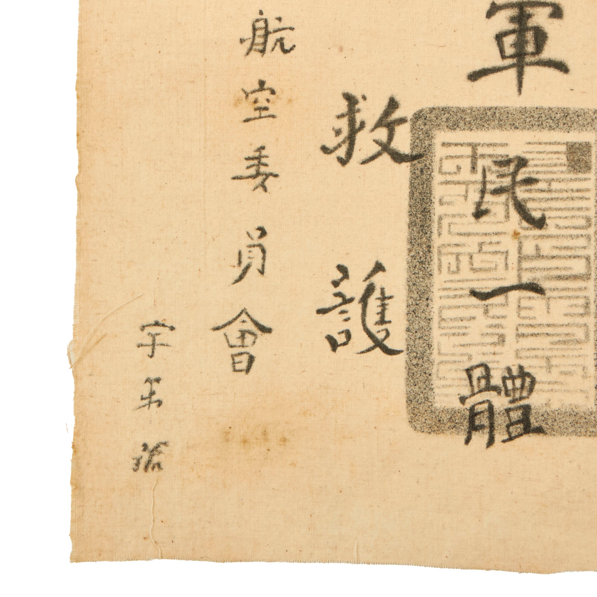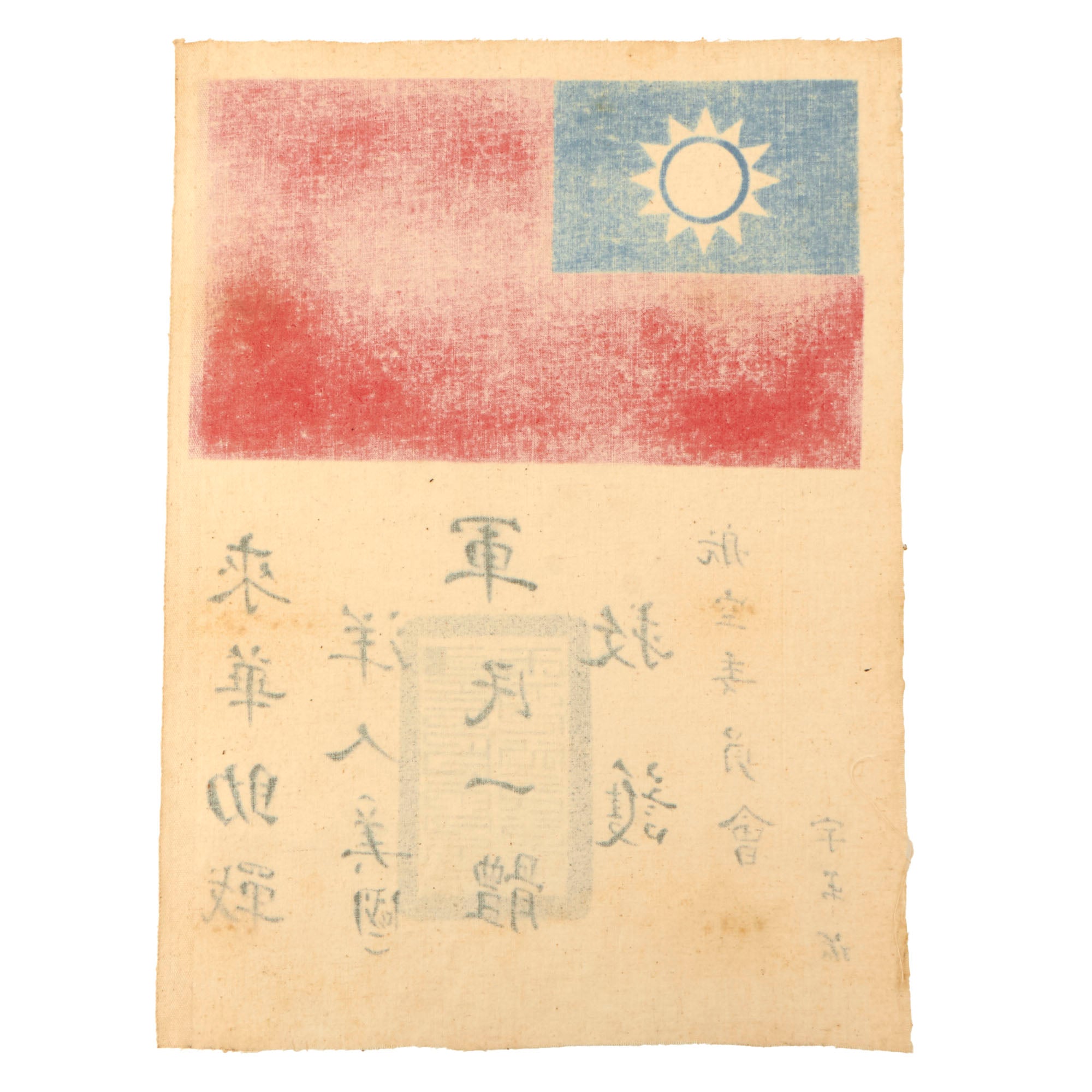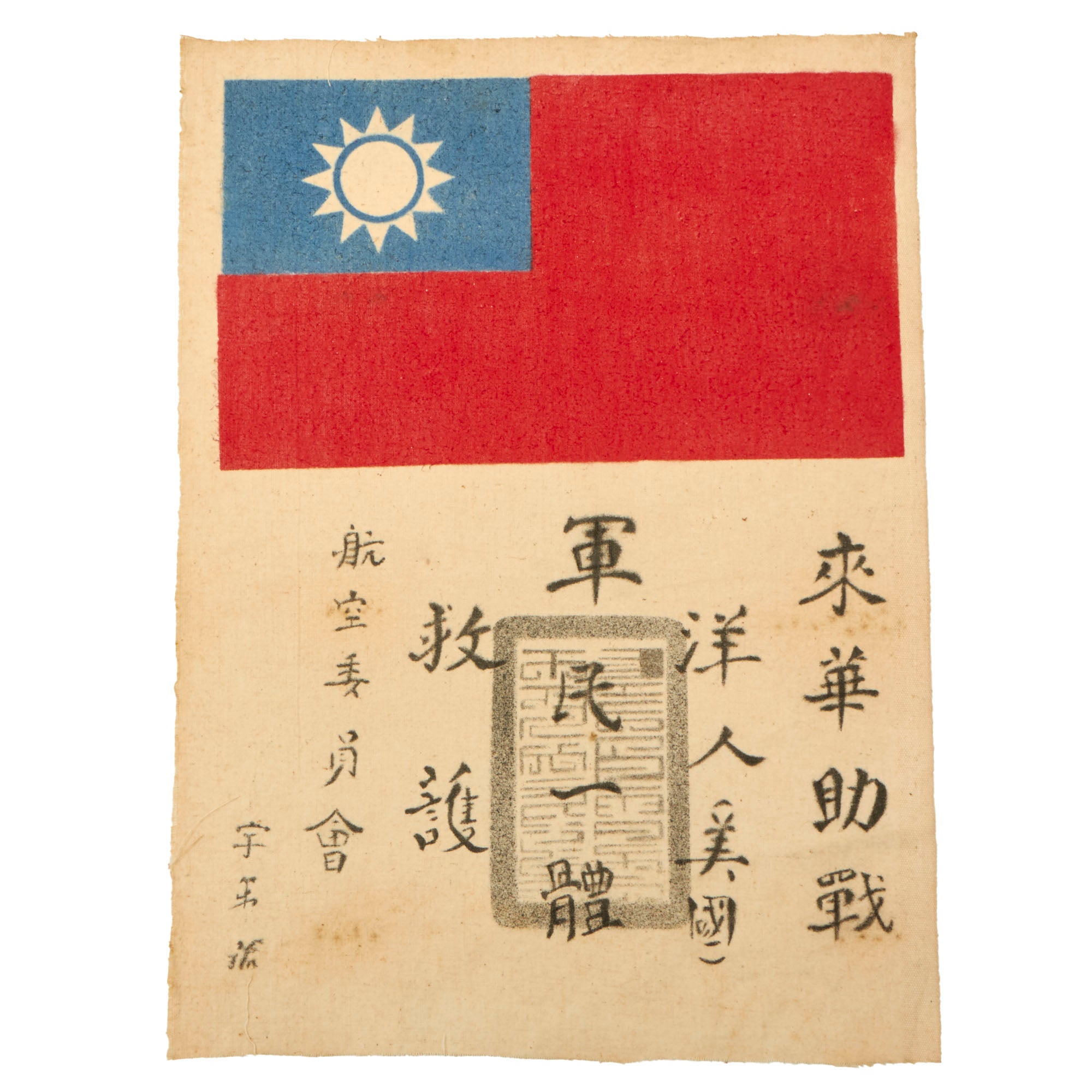 • Original Items: Only One Set Available. This is an excellent condition, original Chinese-made Screen-printed blood chit. It bears a World War Two printed Chinese National Flag with Chinese Characters and a temple stamp. It measures approximately 10 inches by 13¾ inches and is one of the largest we have ever seen. This would have been stitched to the back or inside lining of a U.S. Aviator flight jacket. This example was Chinese-made, so it is not numbered like American-made examples were. This chit came with a Ruptured Duck Honorable Discharge patch and an old low-quality photograph of the framed medals & photographs of the Lieutenant Colonel to whom this chit belonged. There is a plaque on one of the frames but it is too small to read. The officer was a recipient of the Navy Cross, the Distinguished Flying Cross, Air Medal, and more, so this could possibly be identified with enough research work. The condition is great without any serious wear.