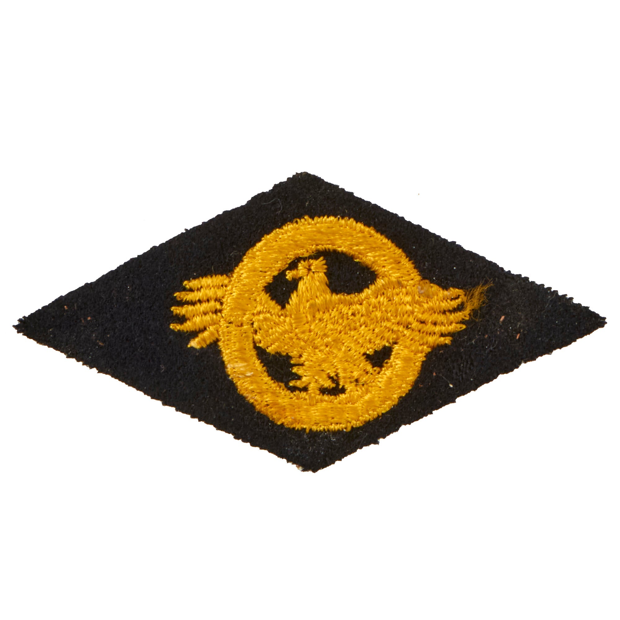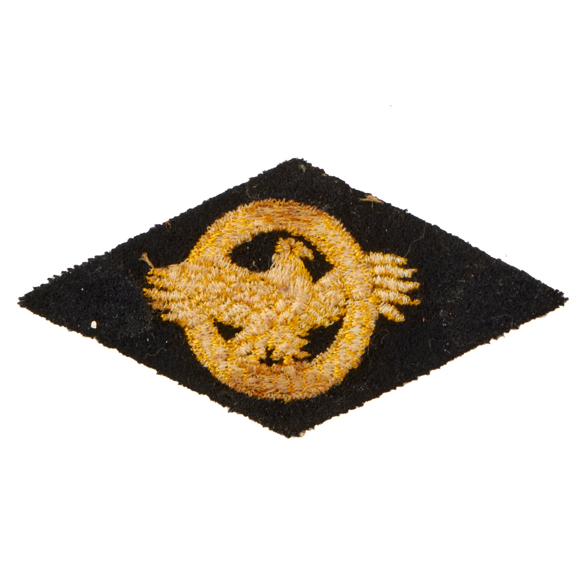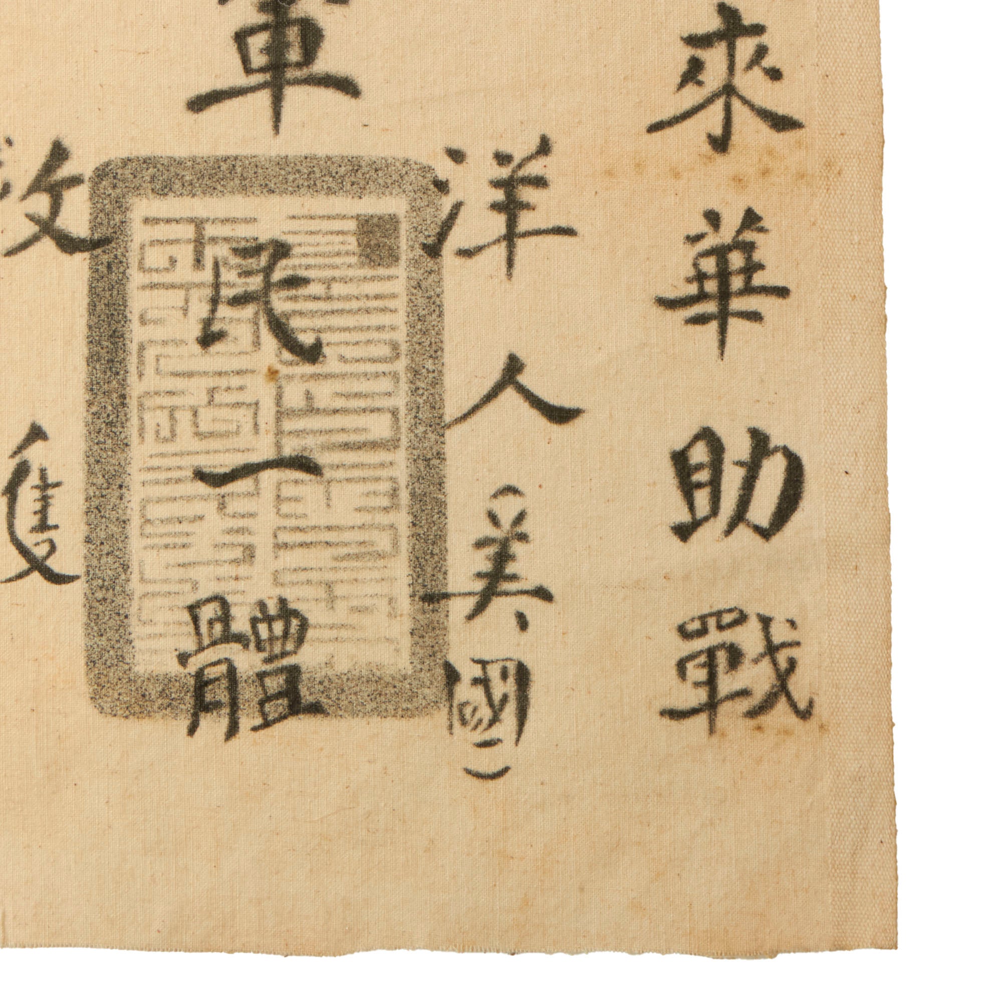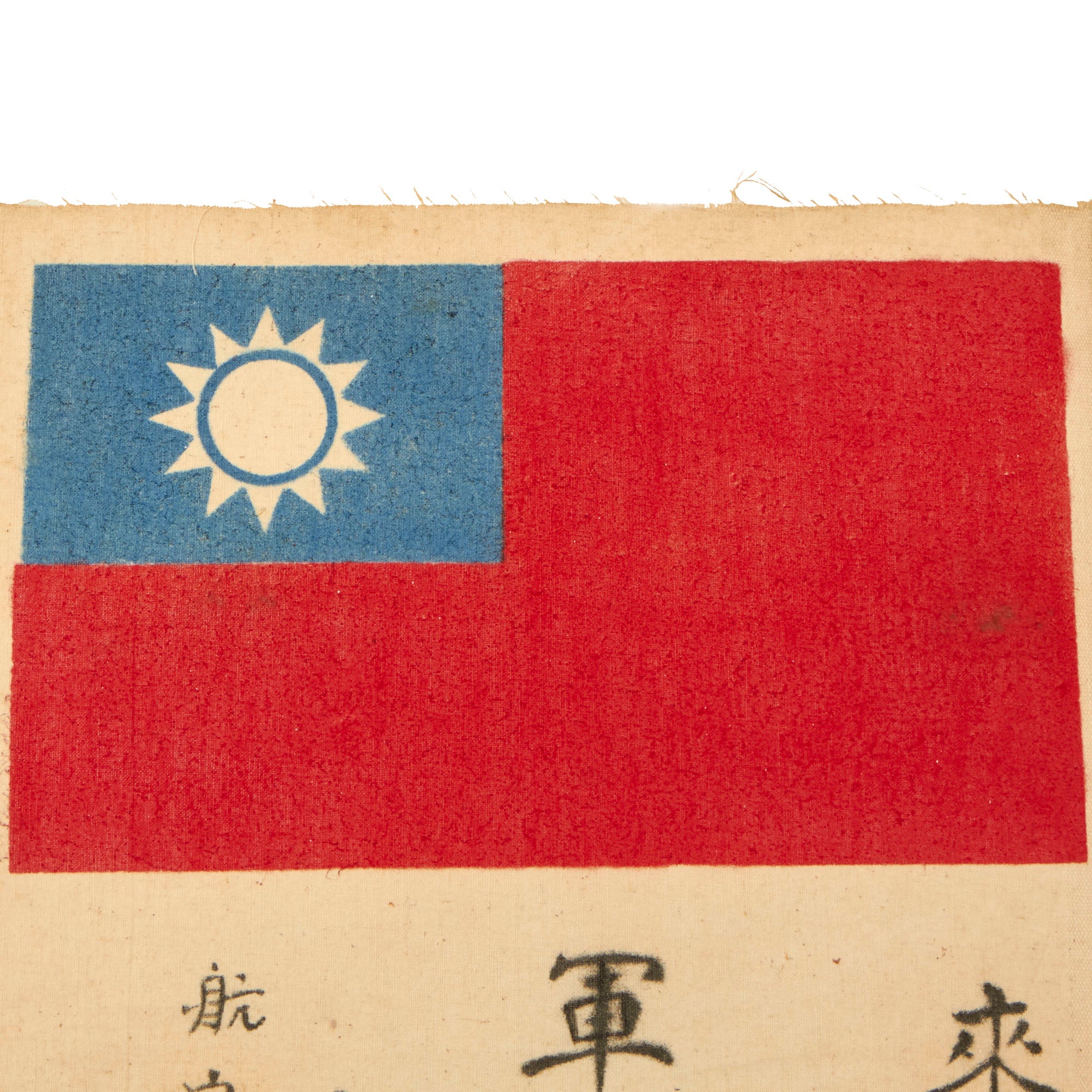 • Original Items: Only One Set Available. This is an excellent condition, original Chinese-made Screen-printed blood chit. It bears a World War Two printed Chinese National Flag with Chinese Characters and a temple stamp. It measures approximately 10 inches by 13¾ inches and is one of the largest we have ever seen. This would have been stitched to the back or inside lining of a U.S. Aviator flight jacket. This example was Chinese-made, so it is not numbered like American-made examples were. This chit came with a Ruptured Duck Honorable Discharge patch and an old low-quality photograph of the framed medals & photographs of the Lieutenant Colonel to whom this chit belonged. There is a plaque on one of the frames but it is too small to read. The officer was a recipient of the Navy Cross, the Distinguished Flying Cross, Air Medal, and more, so this could possibly be identified with enough research work. The condition is great without any serious wear.