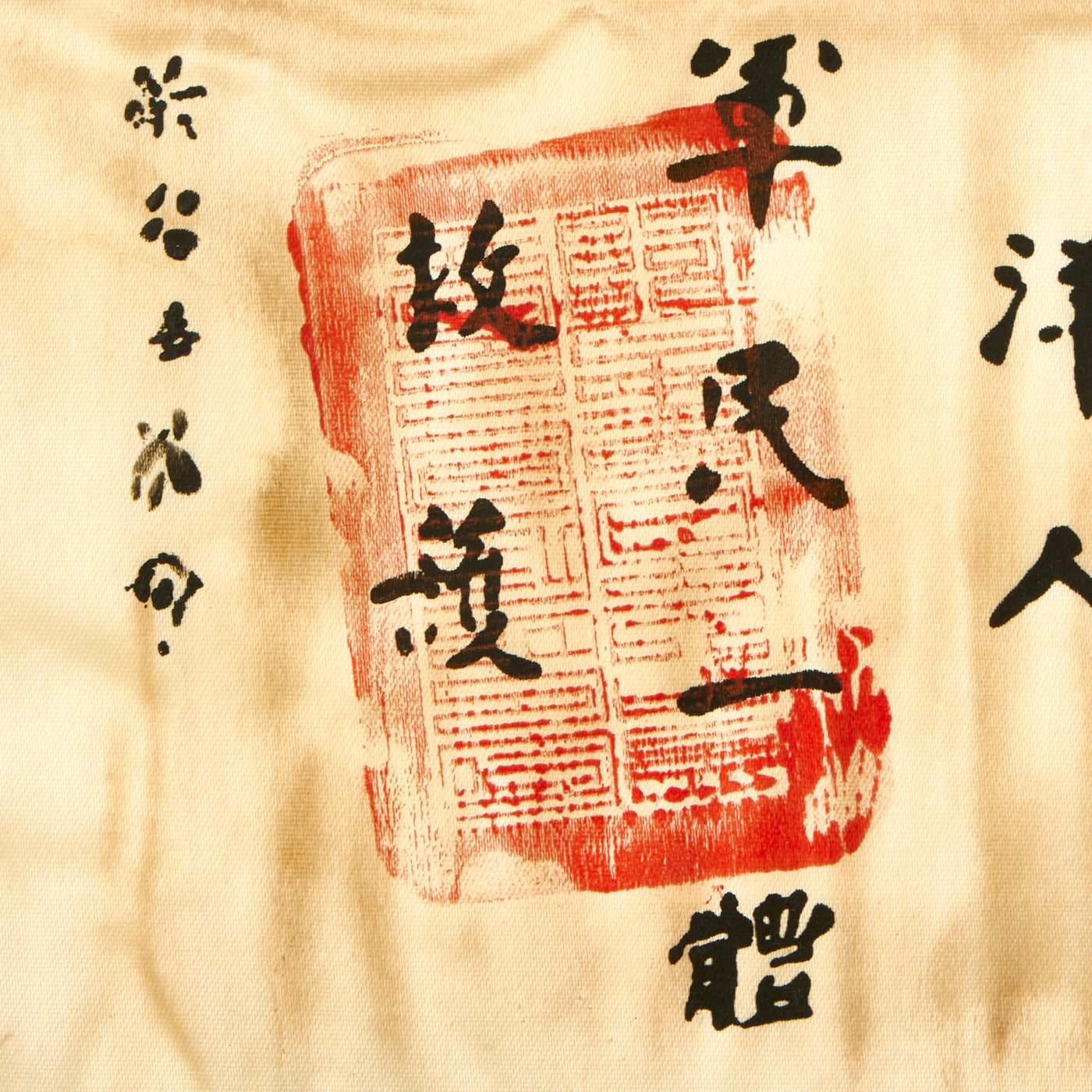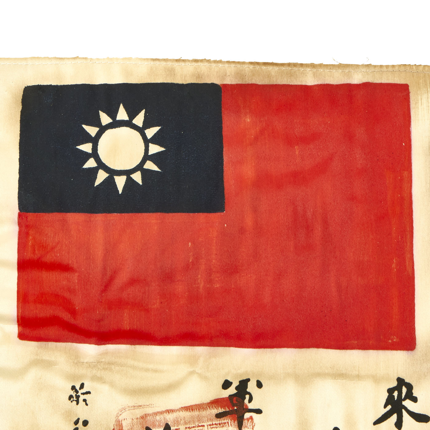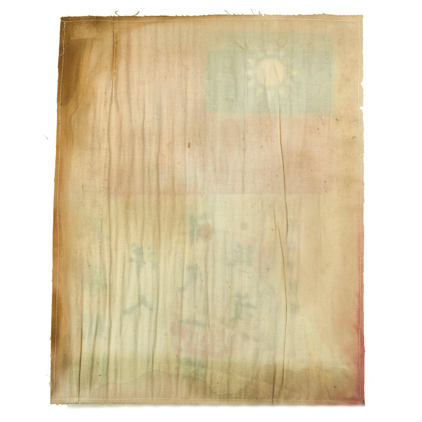 Original Items: Only One Available. This is an excellent condition, original rayon silk blood chit. It bears a World War Two painted Chinese National Flag with Chinese Characters and a temple stamp. It measures approximately 10 ½” x 8 ¼”. This would have been stitched to the back or inside lining of a U.S. Aviator flight jacket.