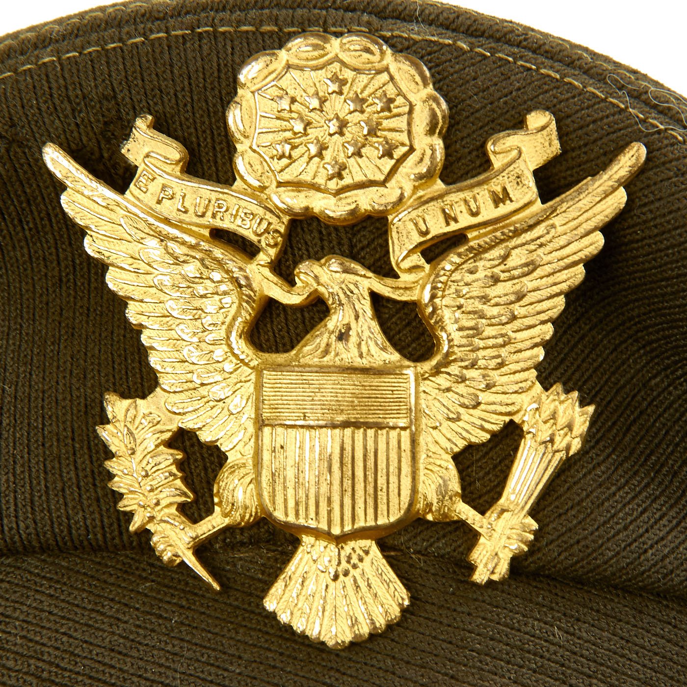 This is the classic "bomber pilot" headgear, worn by USAAF pilots in Europe and the Pacific. Actually, this was the standard Army/AAF officer's dress cap, worn by pilots and non-pilots alike, but pilots gave this cap their own unique twist. Normally, this cap had stiffeners -- a support piece behind the cap device and a wire around the inside top perimeter to maintain the cap's round shape. These kept the cap in its proper, regulation military shape and angle. However, since bomber pilots wore headsets over their caps during flights, they would remove the wire stiffener to make headset wear more comfortable, causing the sides of the caps to become crushed. Eventually, the caps retained their floppy "crushed" look, giving the pilot who wore it the look of a seasoned veteran.
