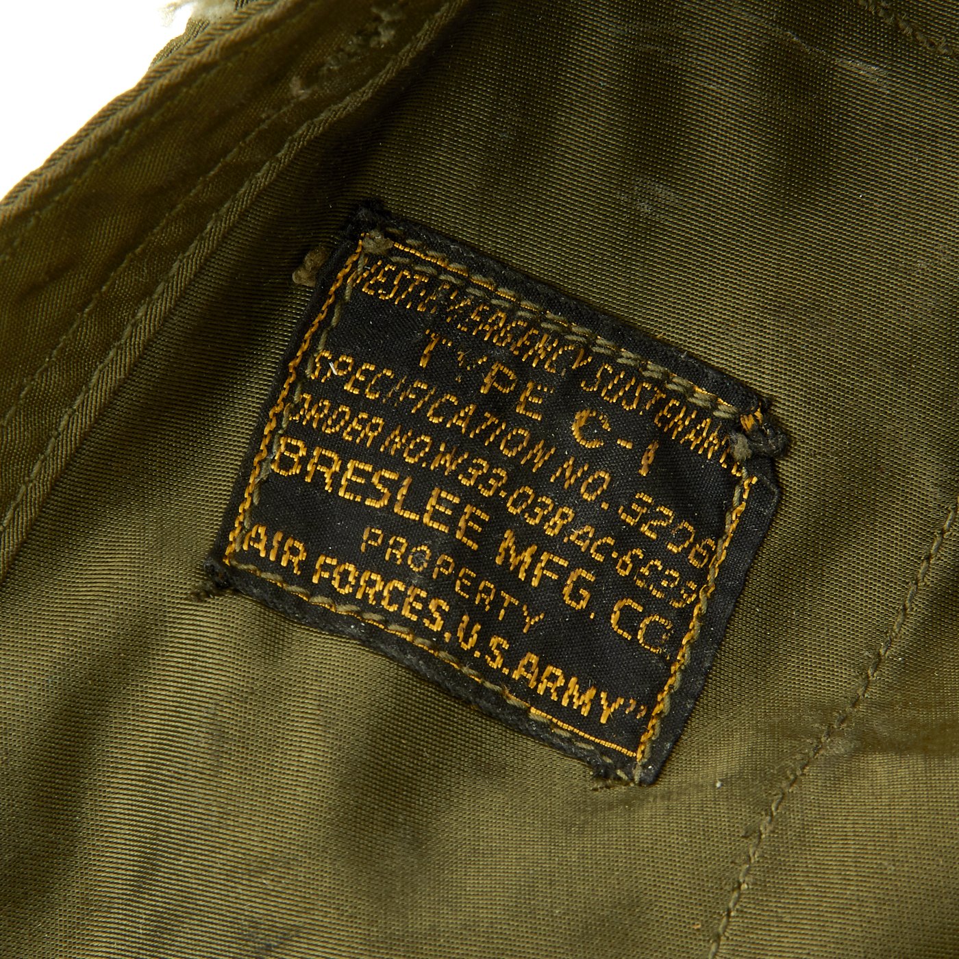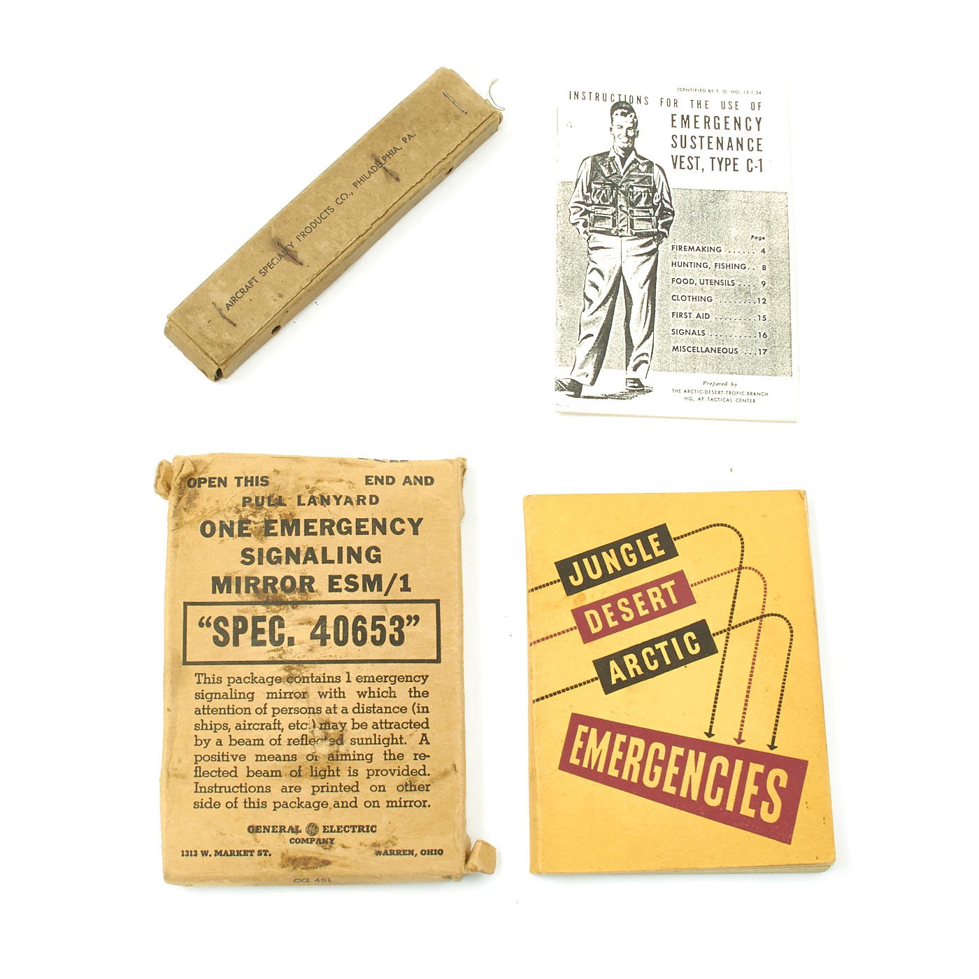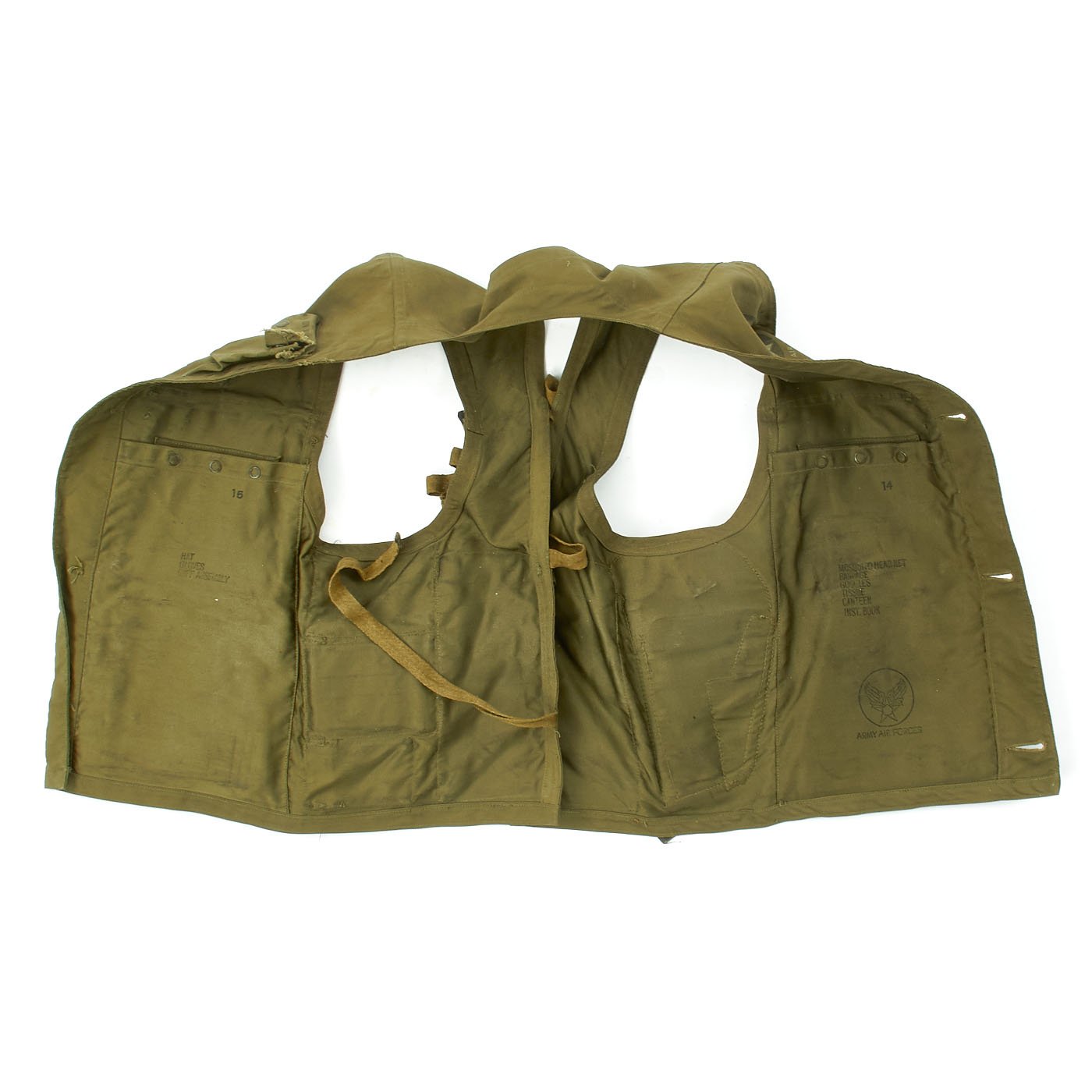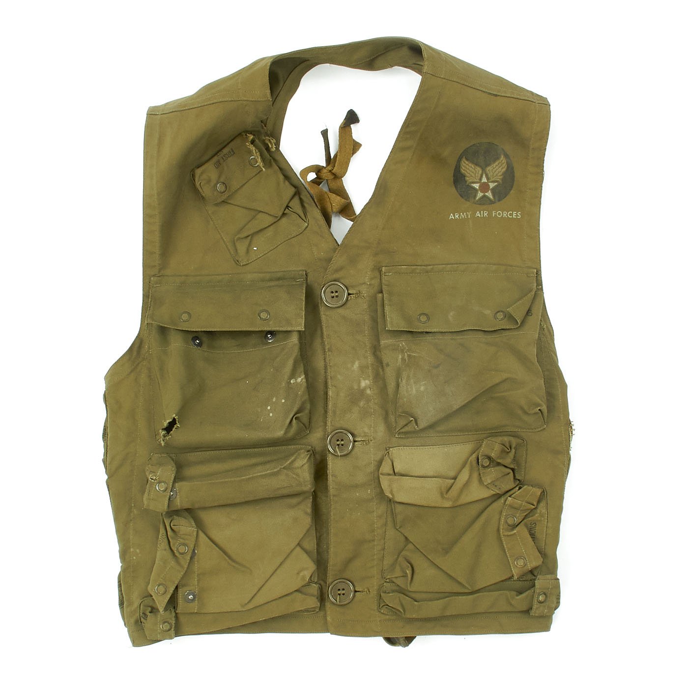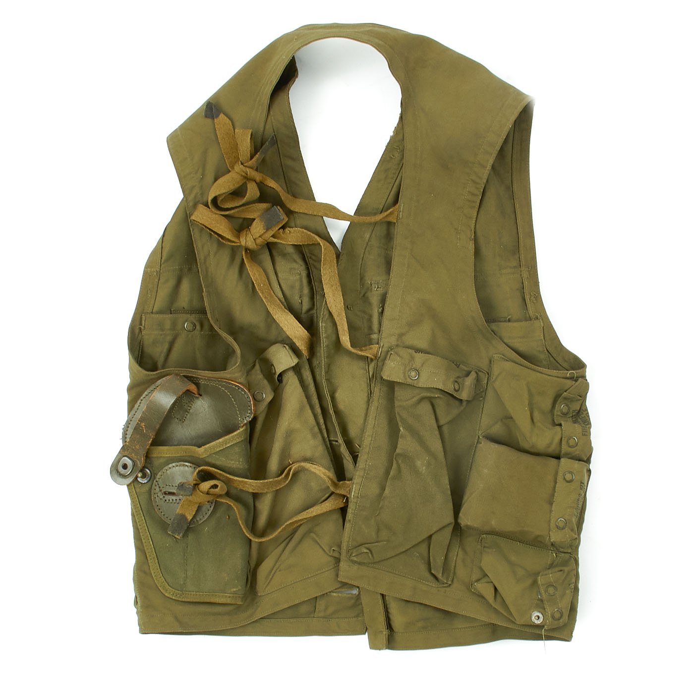 - Original U.S. WWII USAAF Pilot Type C-1 Emergency Sustenance Vest with accessories such as first aid kit, replica non-firing 1911 Pistol in period waterproof bag, bandages, signalling mirror and many other accessories.