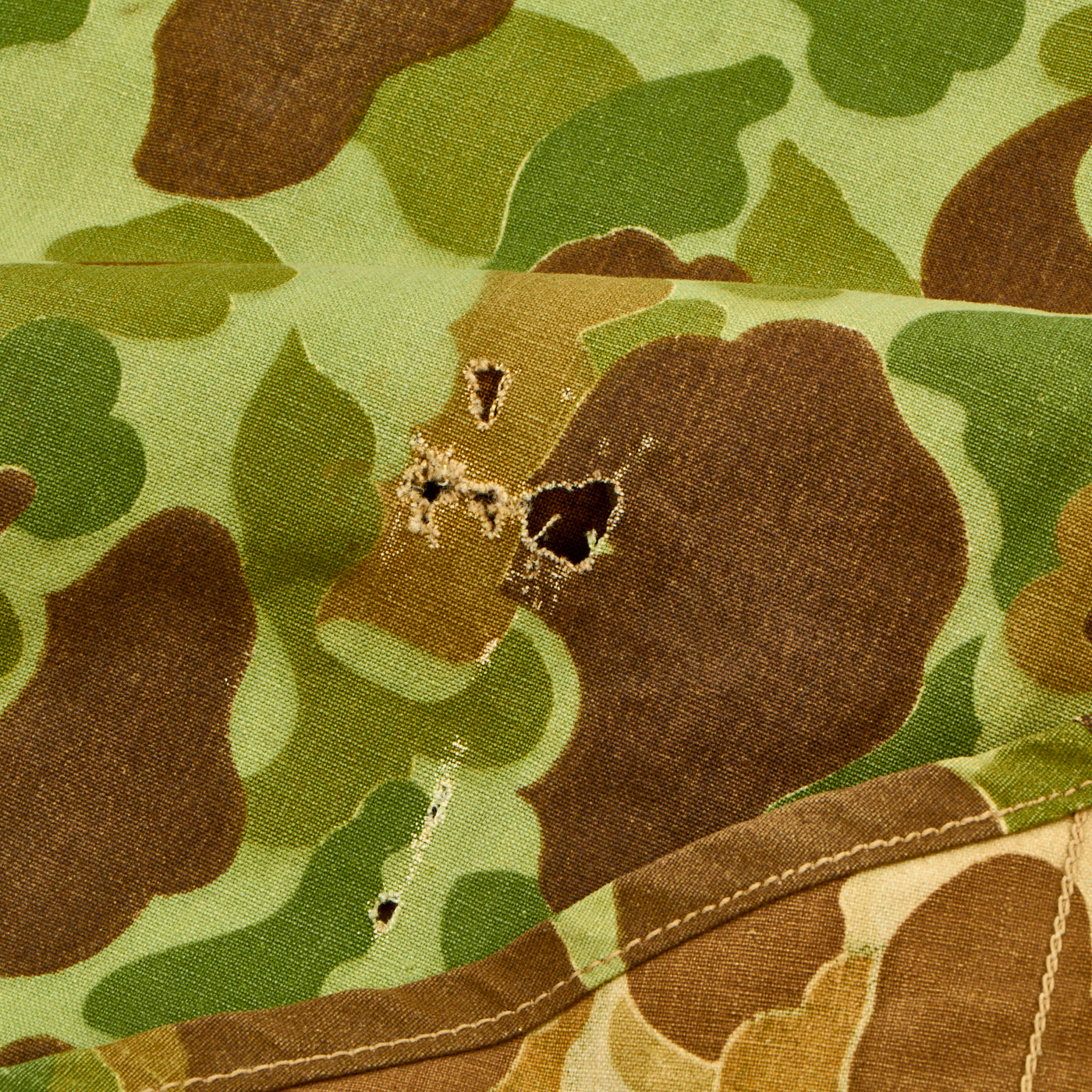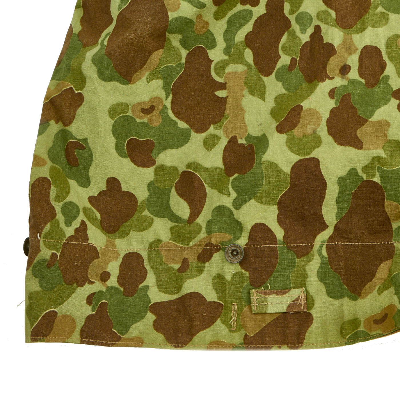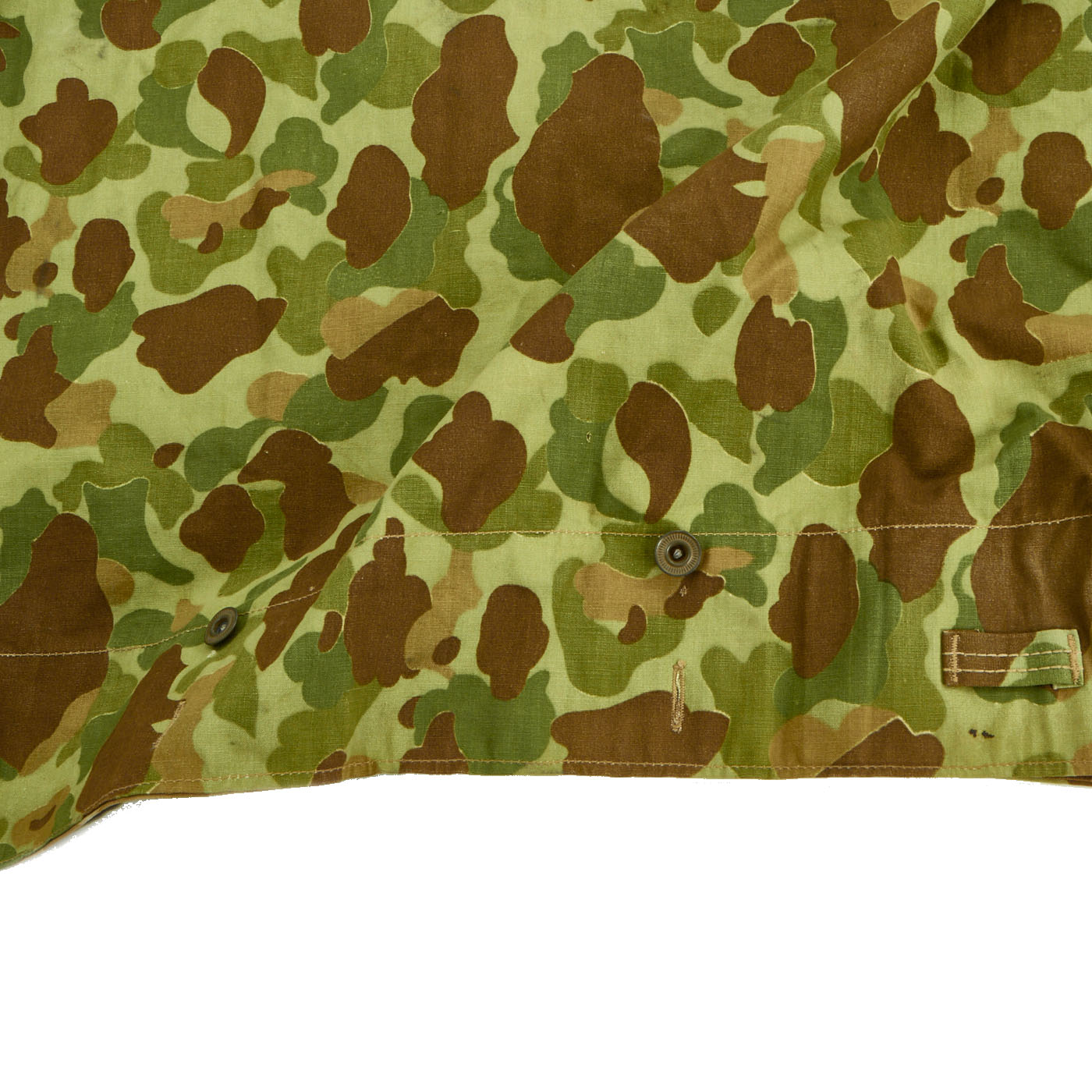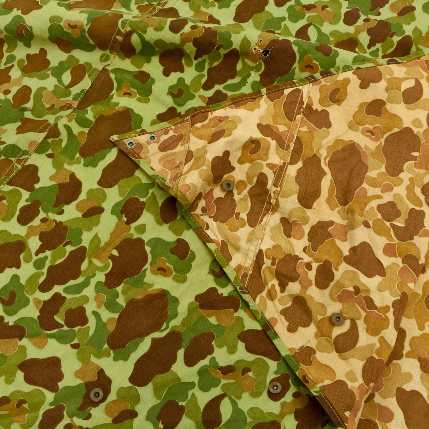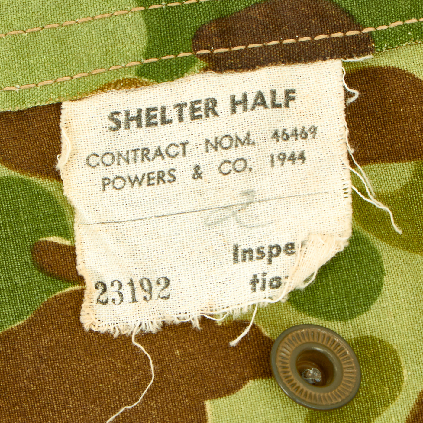 Original Item: Only One Available. The fundamental unit of shelter for the U.S. Army/Marine Corps in the field -- since the Civil War -- is the two-man pup tent. Each pup tent is made up of two shelter half pieces that fasten together with a row of buttons (up to late World War II) or snaps along the ridge line and, with poles, ropes and stakes, make up one pup tent. The buttons are matched to a row of button holes. The snaps are two sided. With either system, any pair of shelter half pieces can be fastened together with a watertight closure along the top line. The shelter half is approximately 7' long by 5' wide, double sided, rectangular panel with a pointed end on each side. Two Marines could button the sections together in order to make a tent. The colors are vibrant with minor staining to the fabric. There are a few scattered repaired holes and typical pulls but overall condition is very good with almost all the grommets and buttons intact. Original label still attached and reads: