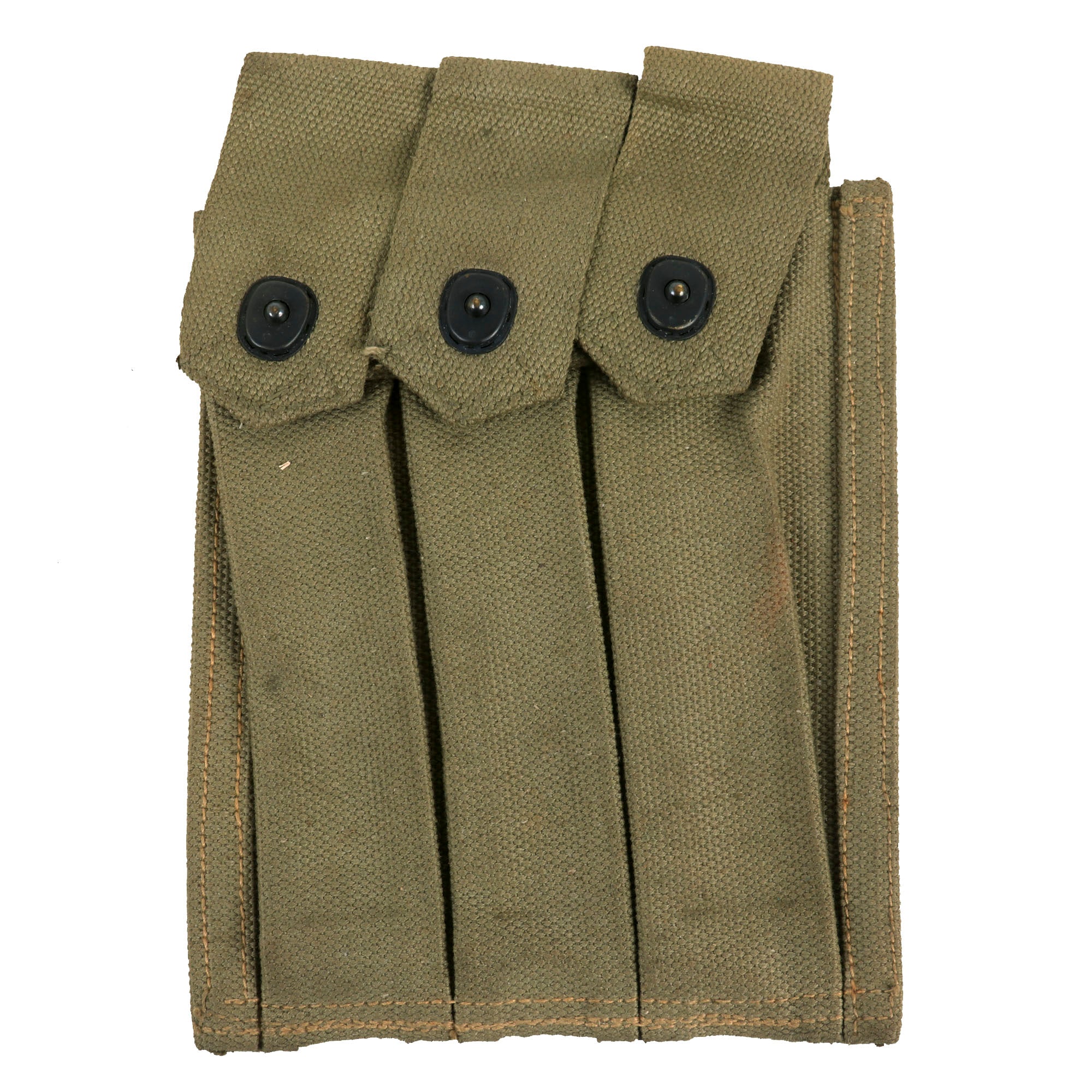 Original Item: Only One Available. This is a lovely original 1944 U.S.M.C. Thompson .45 Submachine Gun 30 round Magazine Pouch. The Thompson was used in World War II in the hands of Allied troops as a weapon for scouts, non-commissioned officers (corporal, sergeant, and higher), and patrol leaders, as well as commissioned officers, tank crewmen, and soldiers performing raids on enemy positions.