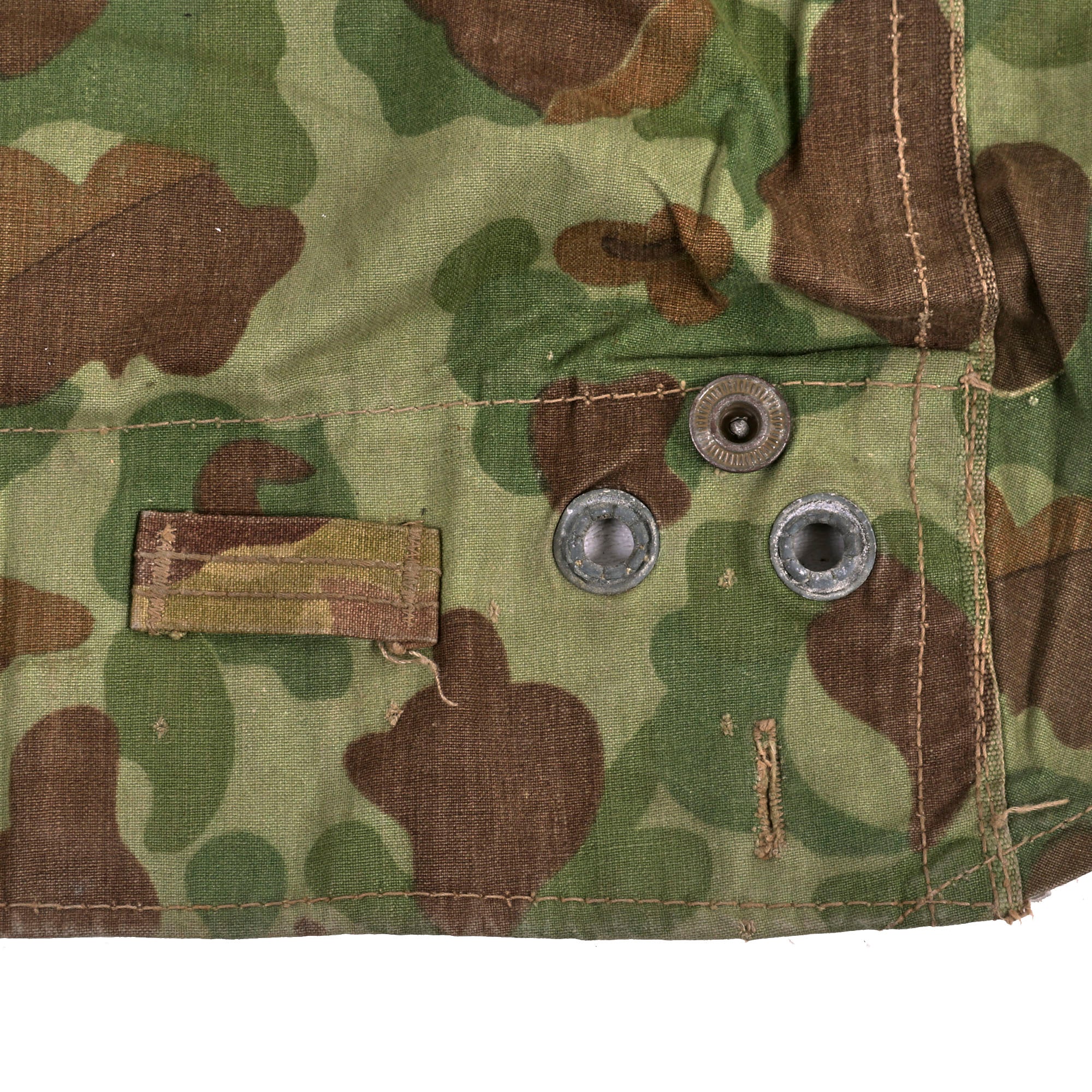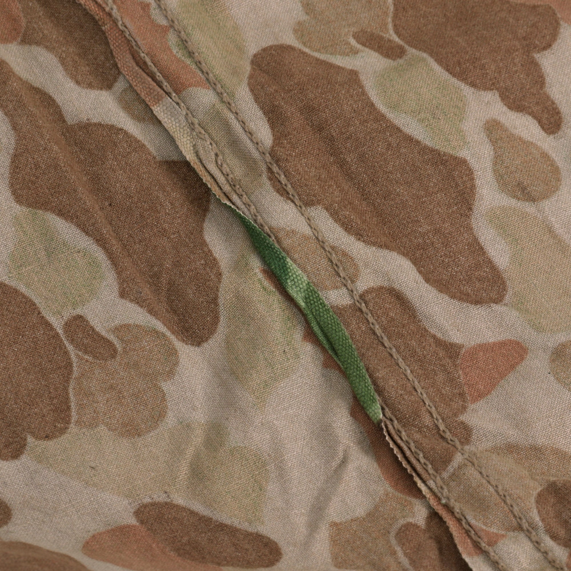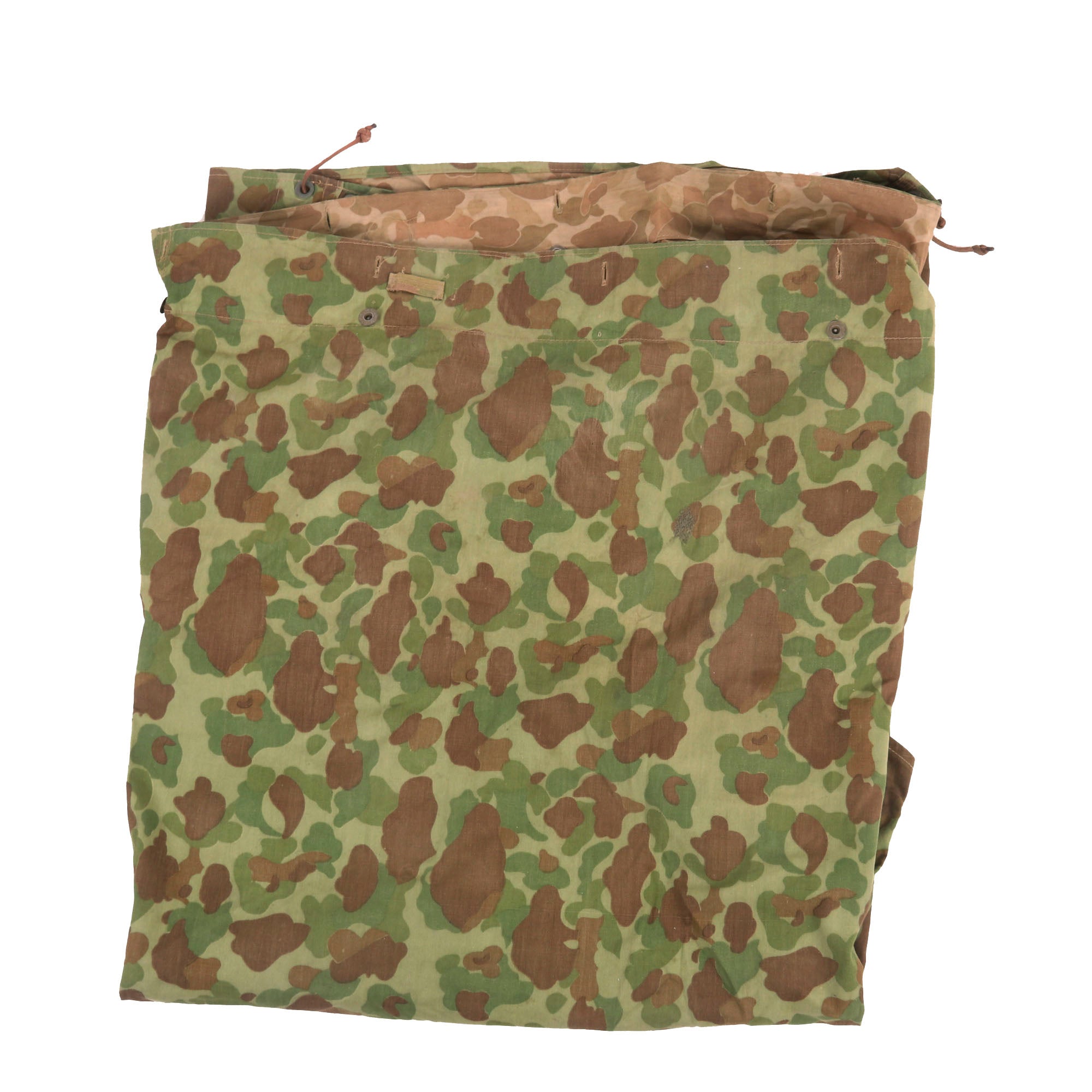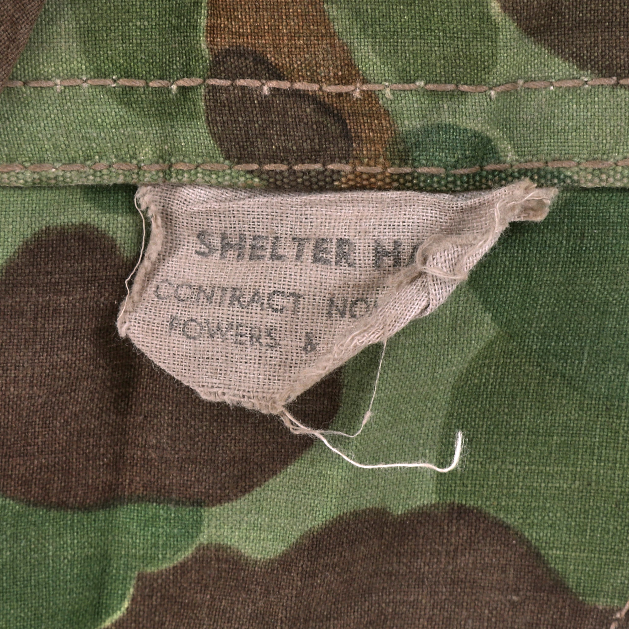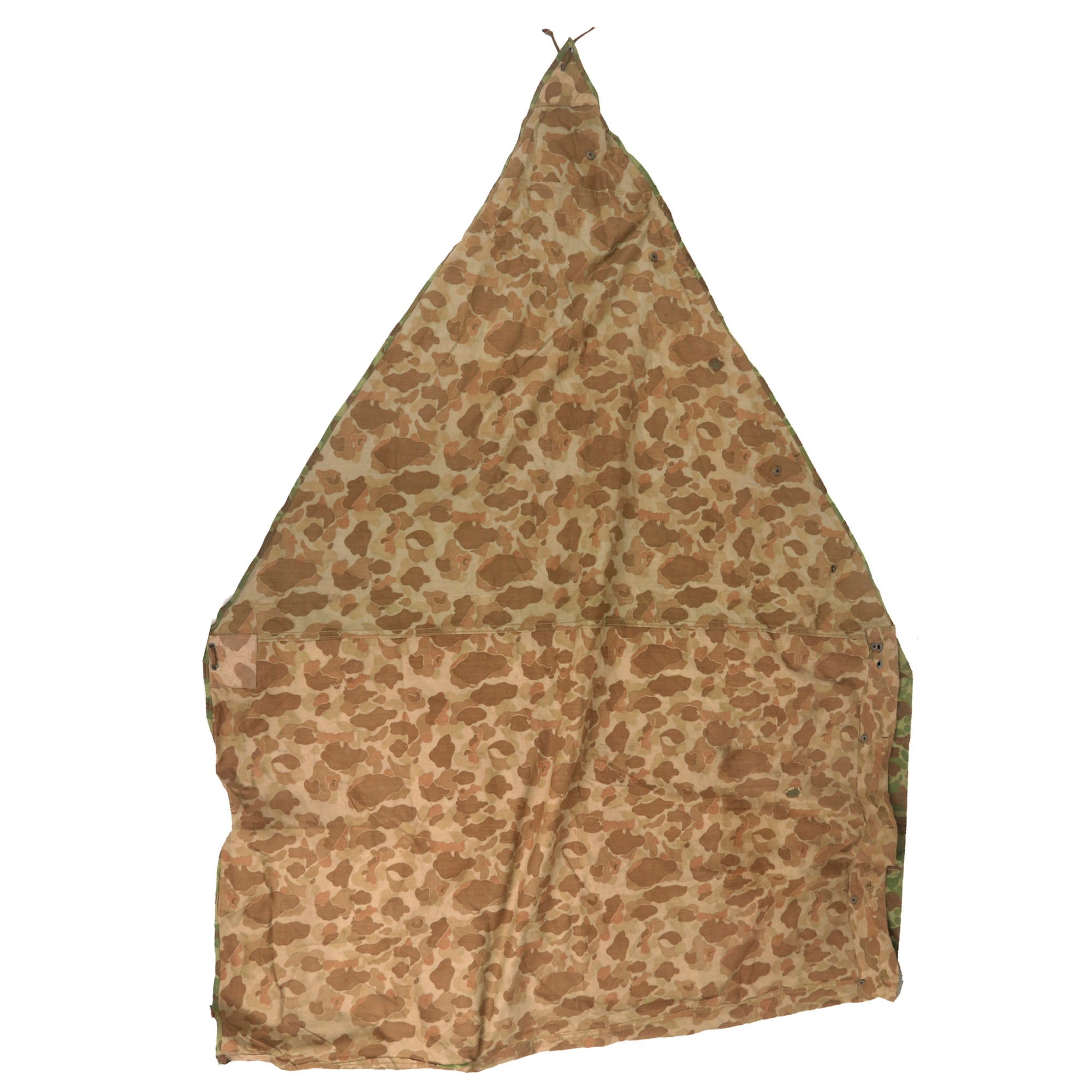 Original Item: Only One Available. Double sided, rectangular panel with a pointed end on each side. Two Marines could button the sections together in order to make a tent. The colors are vibrant with no staining to the fabric. Overall condition is good, the fabric is still soft and pliable, with all the grommets and buttons intact. There are multiple period fabric repairs, giving the piece some great character. The shelter half retains its original tag reading: