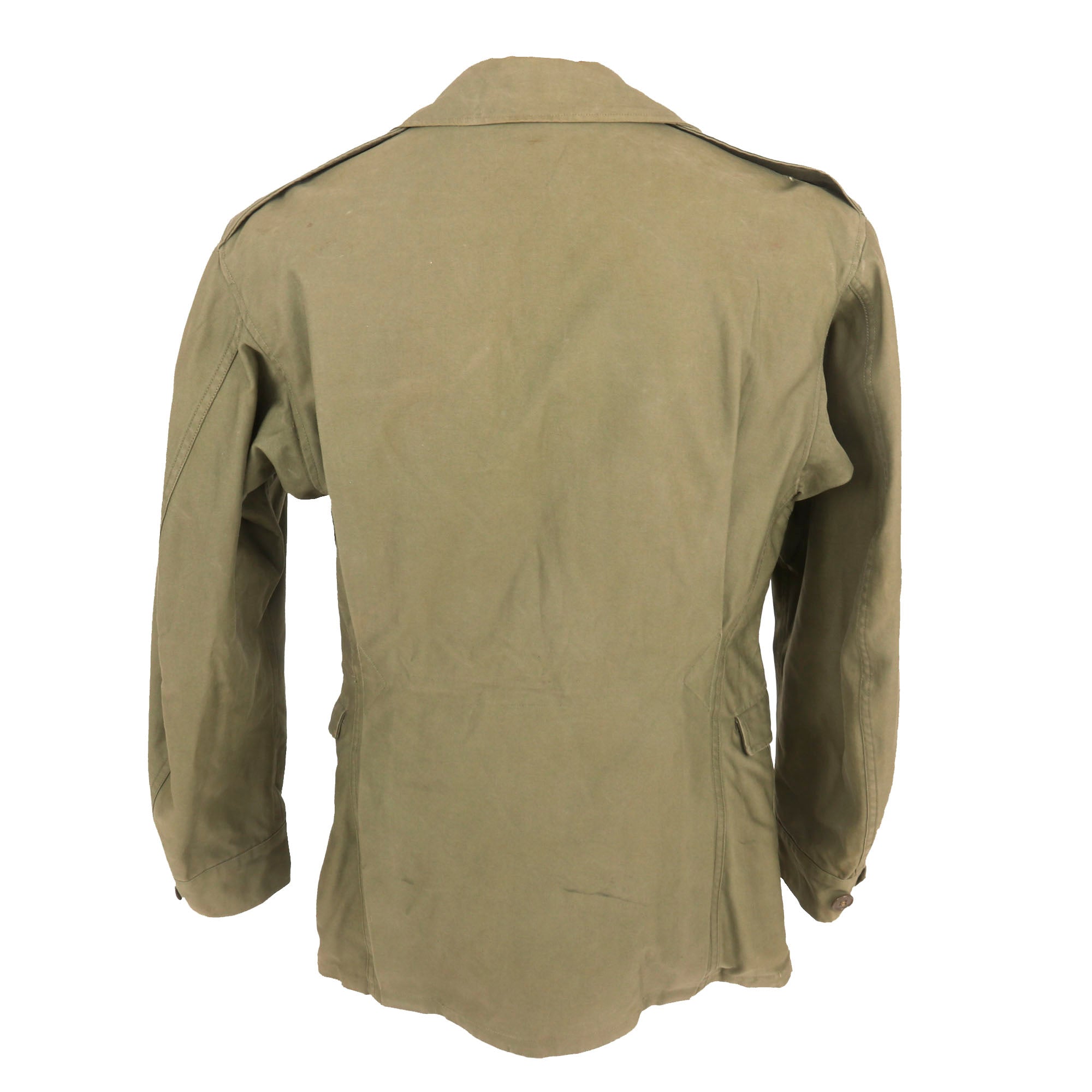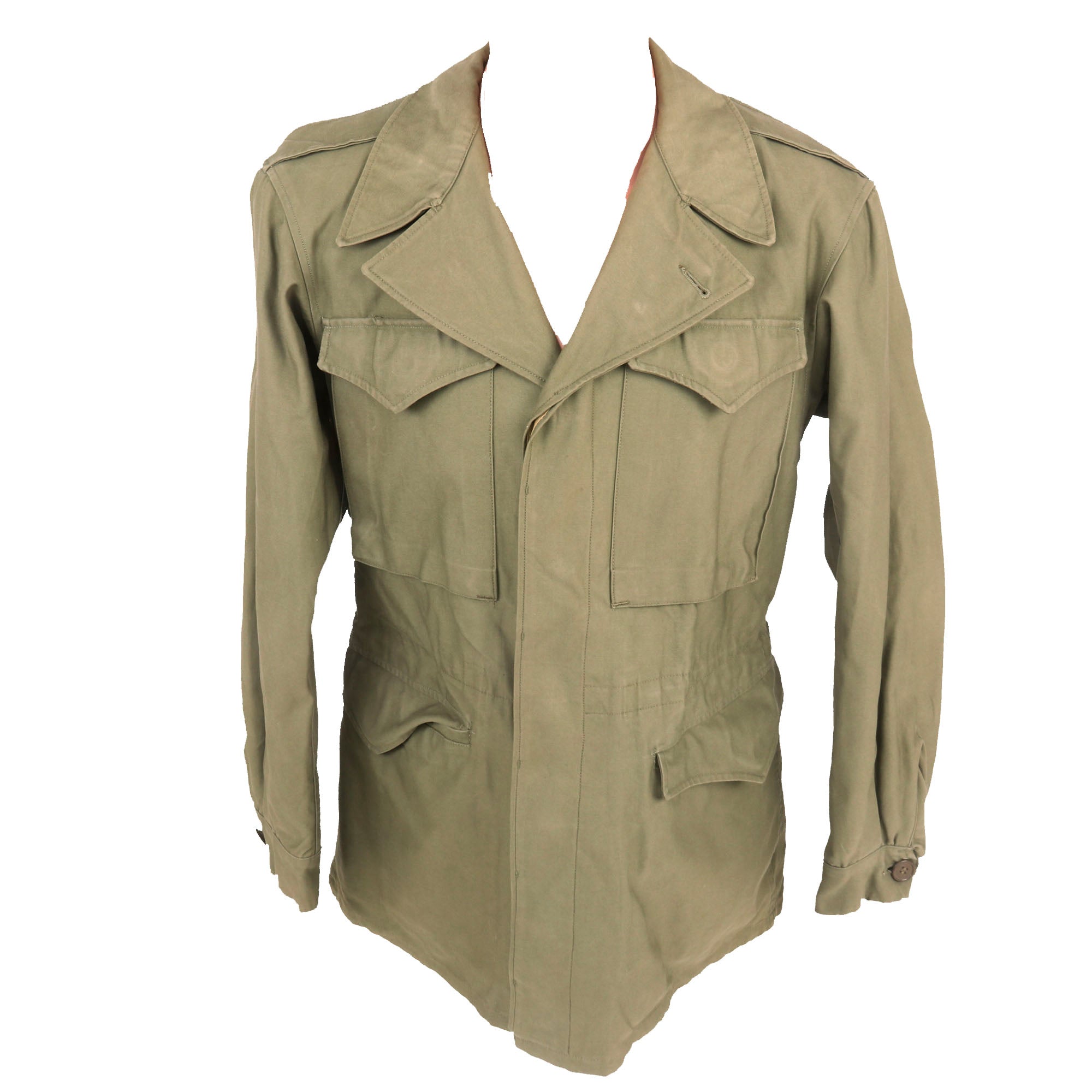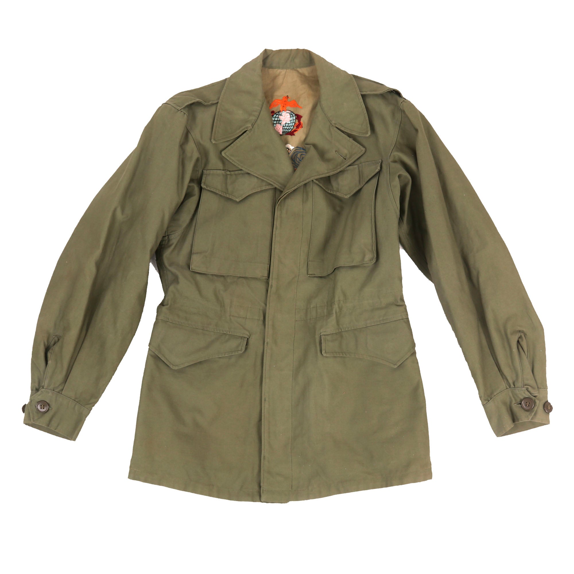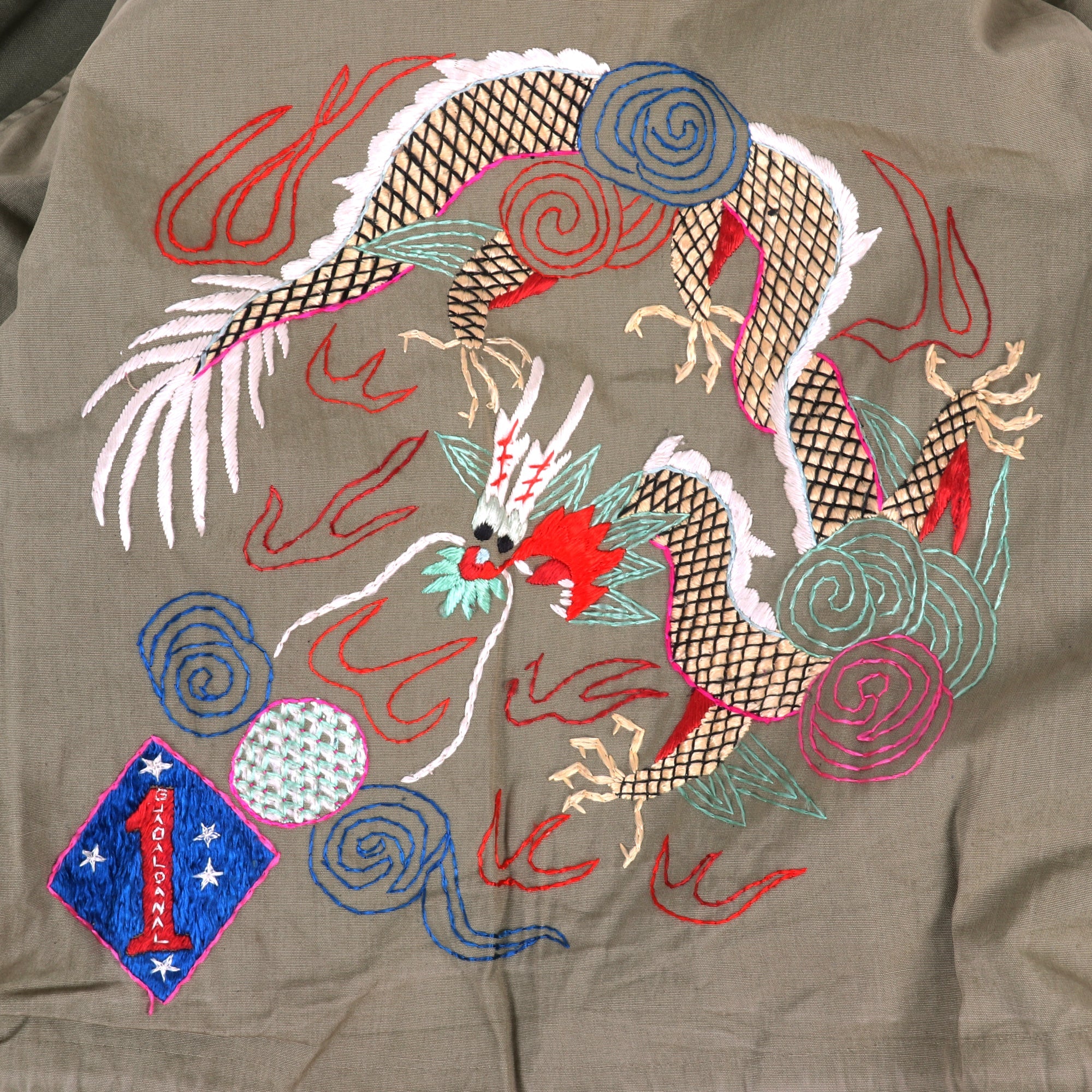 Original Item. One-of-a-Kind. This is a gorgeous M43 Field Jacket worn by Marine Corps Corporal Ewald Schuettner who briefly served in China during the Second World War. The interior lining of the jacket is professionally embroidered with an EGA (Eagle, Globe, Anchor) insignia over a lovely dragon motif with the 1st Marine Division insignia.