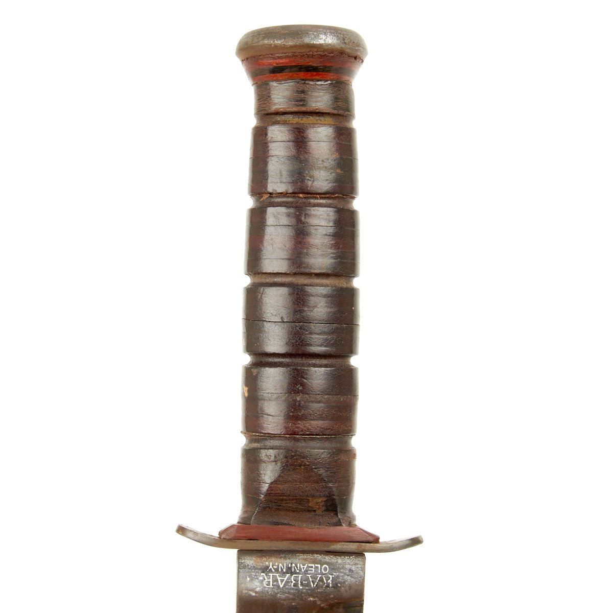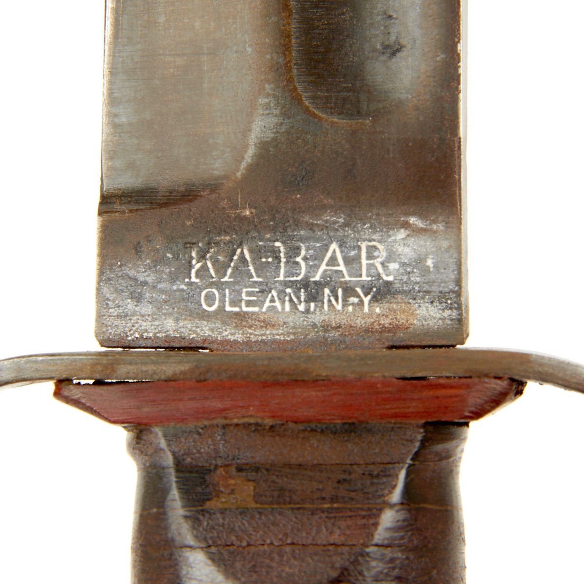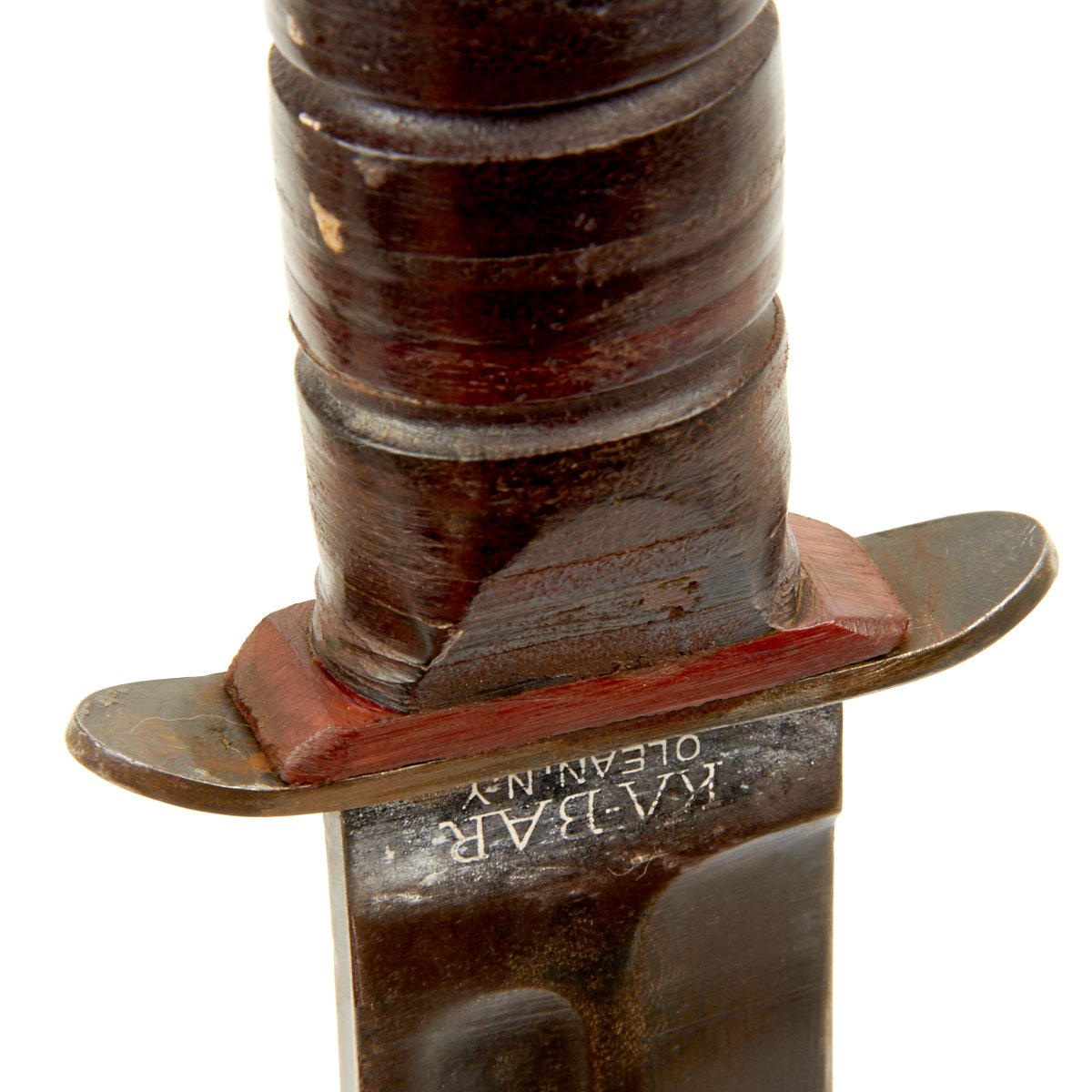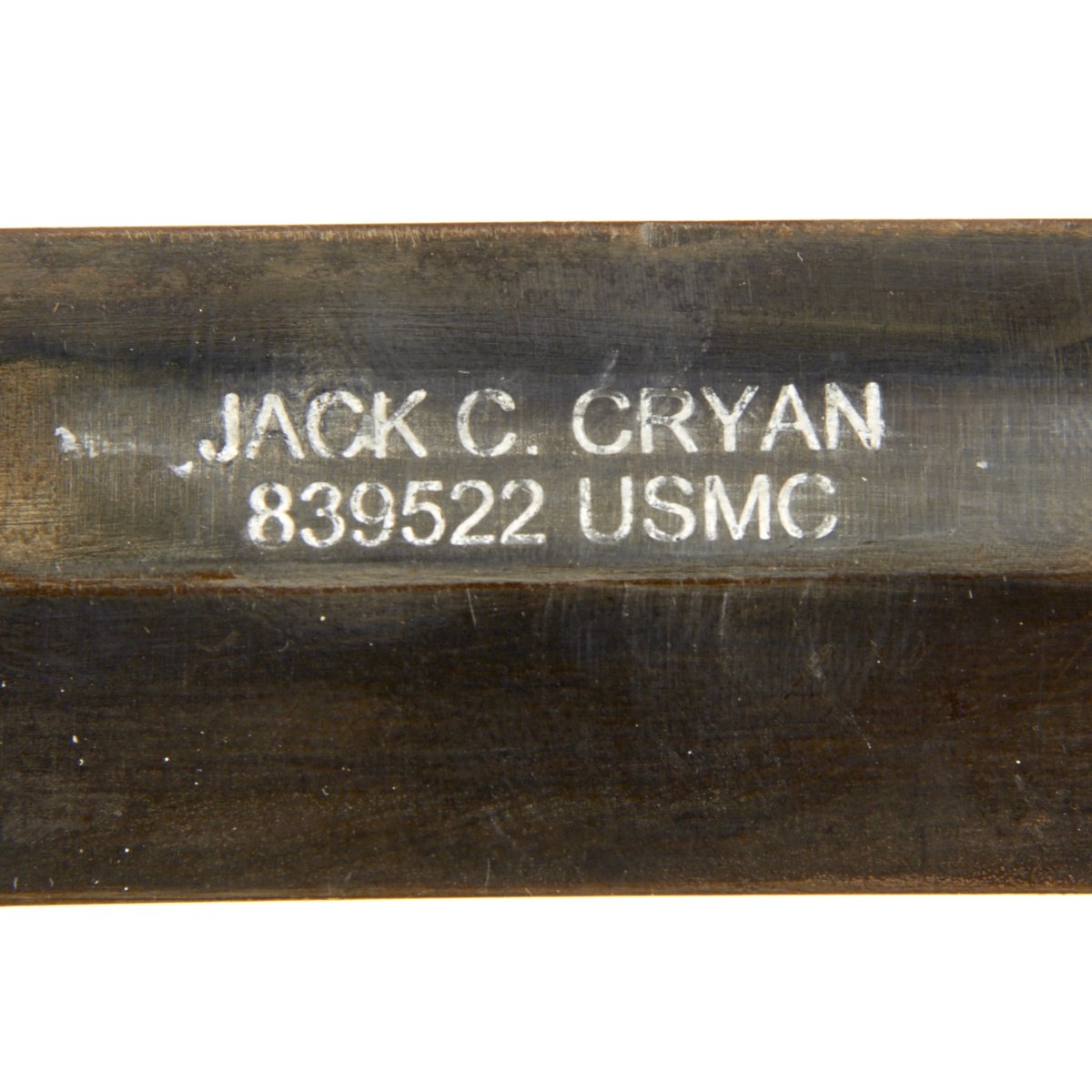 - Early War Red Spacer KA- BAR knife that is marked USMC JACK C. CRYAN 839522 in the fuller of the blade, as well as USMC on the right ricasso and on the other KA-BAR OLEAN. N.Y. The condition of the knife is excellent the blade still retains a razor sharp edges, the leather washer grip is in excellent condition as are the rare early red spacers used at both the top and bottom of the grip. Original leather sheath or scabbard is also in excellent condition, with the exception of a torn closure strap.