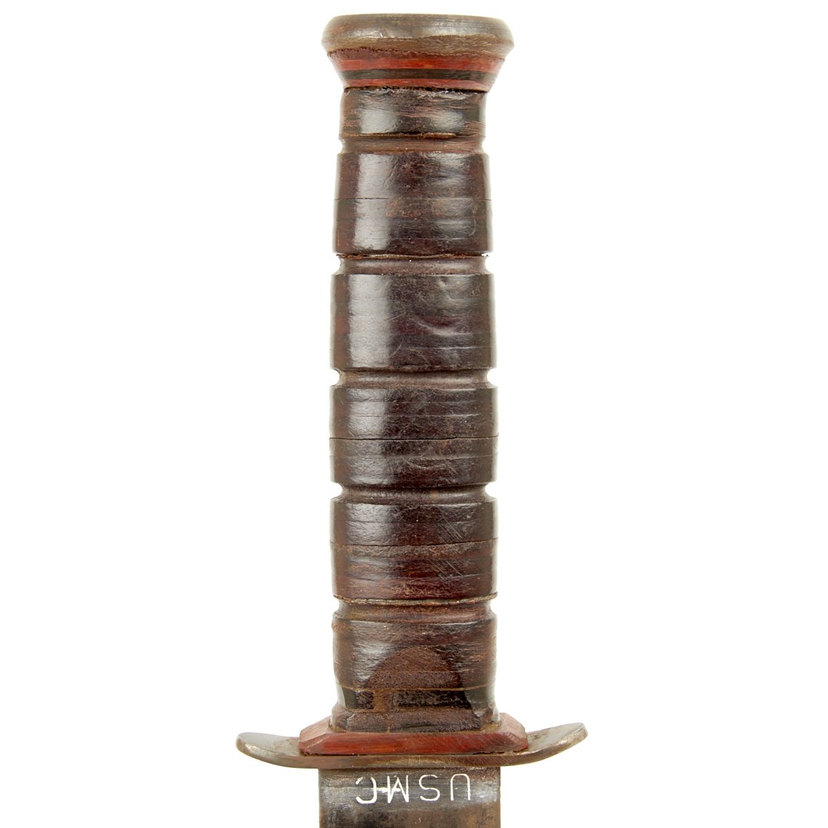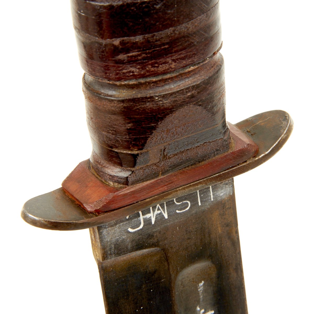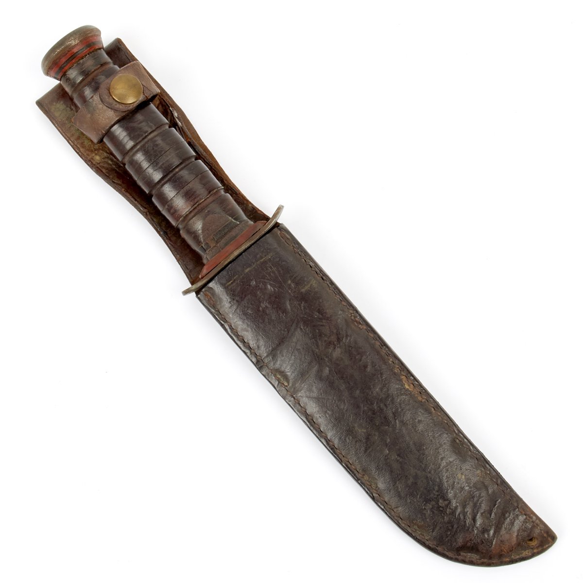 - Early War Red Spacer KA- BAR knife that is marked USMC JACK C. CRYAN 839522 in the fuller of the blade, as well as USMC on the right ricasso and on the other KA-BAR OLEAN. N.Y. The condition of the knife is excellent the blade still retains a razor sharp edges, the leather washer grip is in excellent condition as are the rare early red spacers used at both the top and bottom of the grip. Original leather sheath or scabbard is also in excellent condition, with the exception of a torn closure strap.