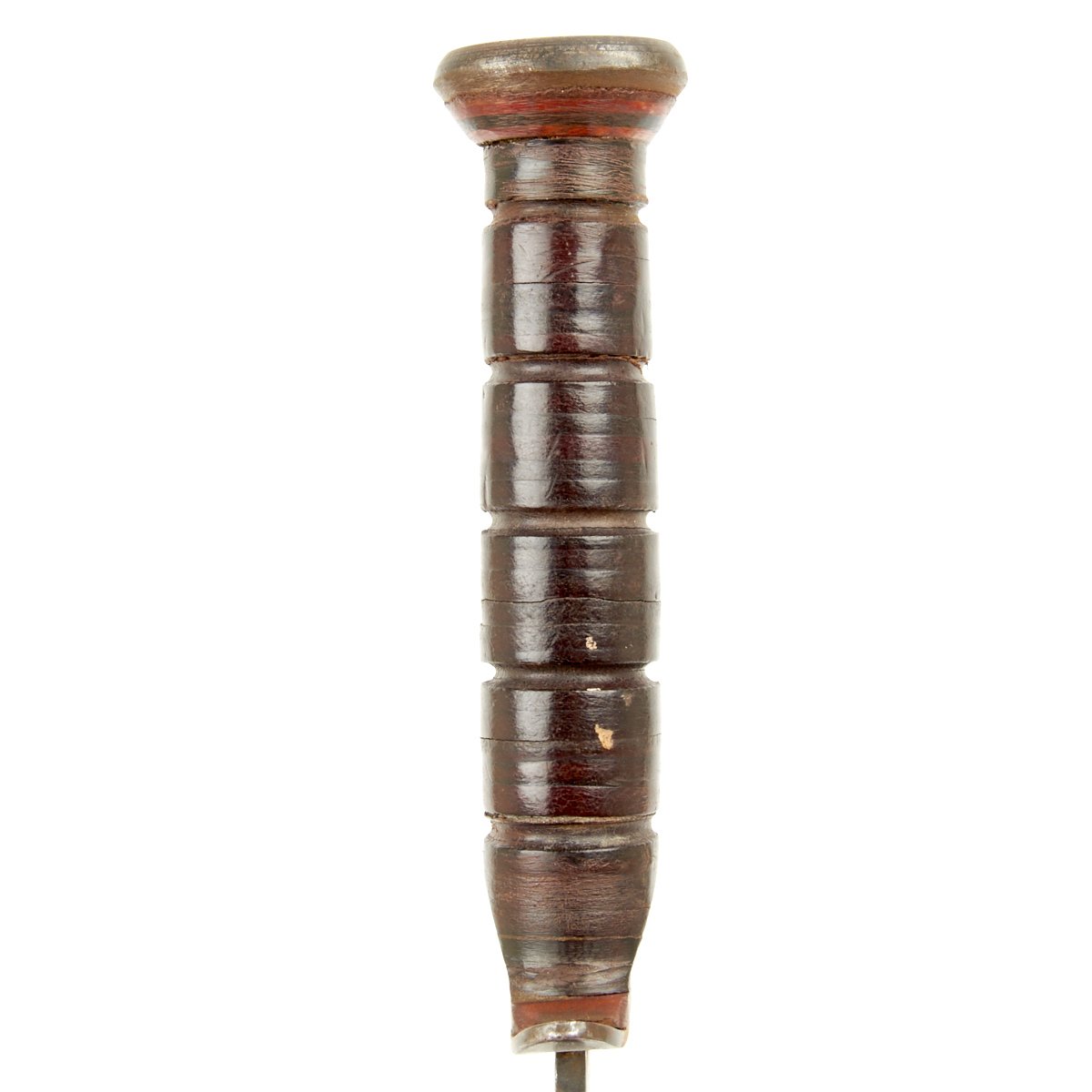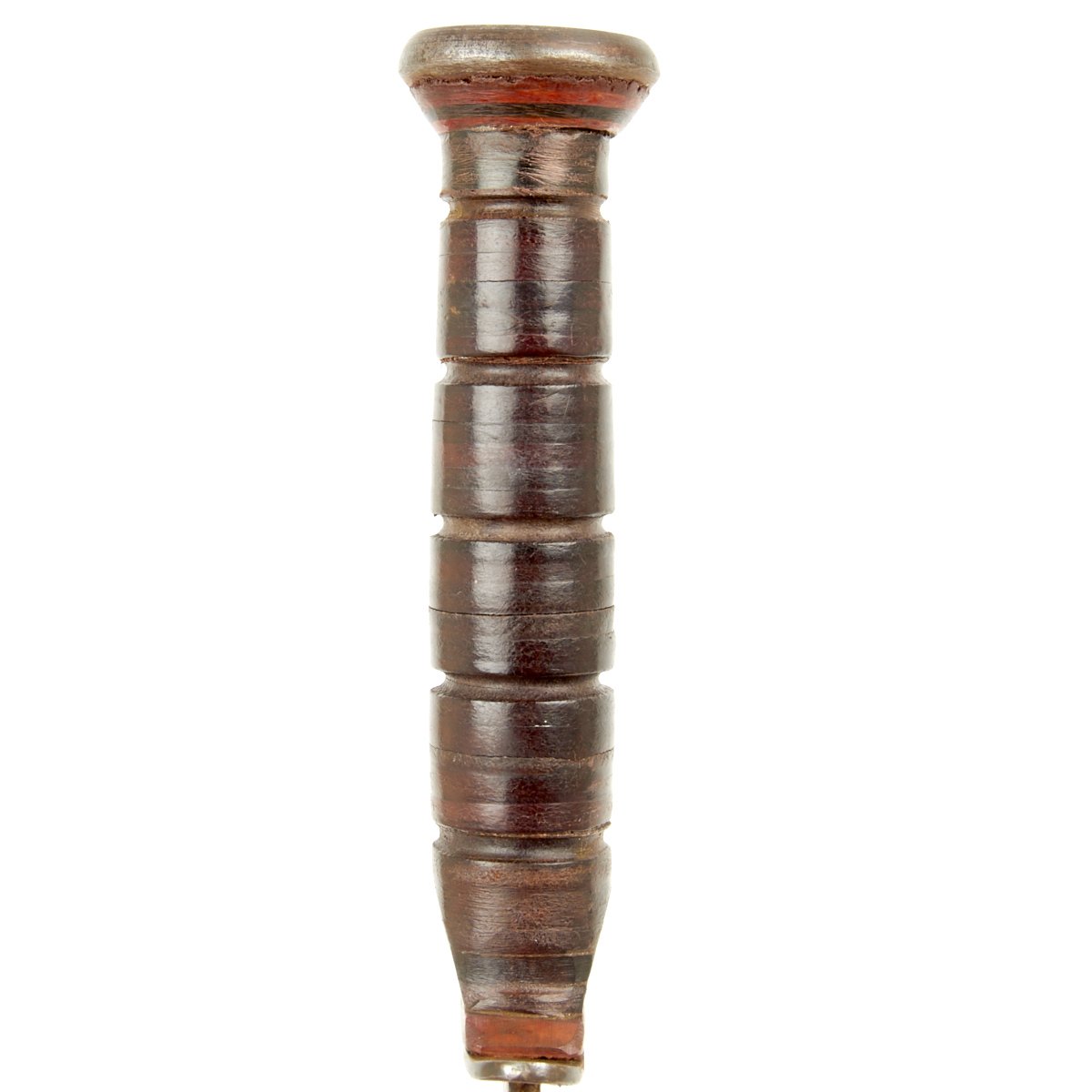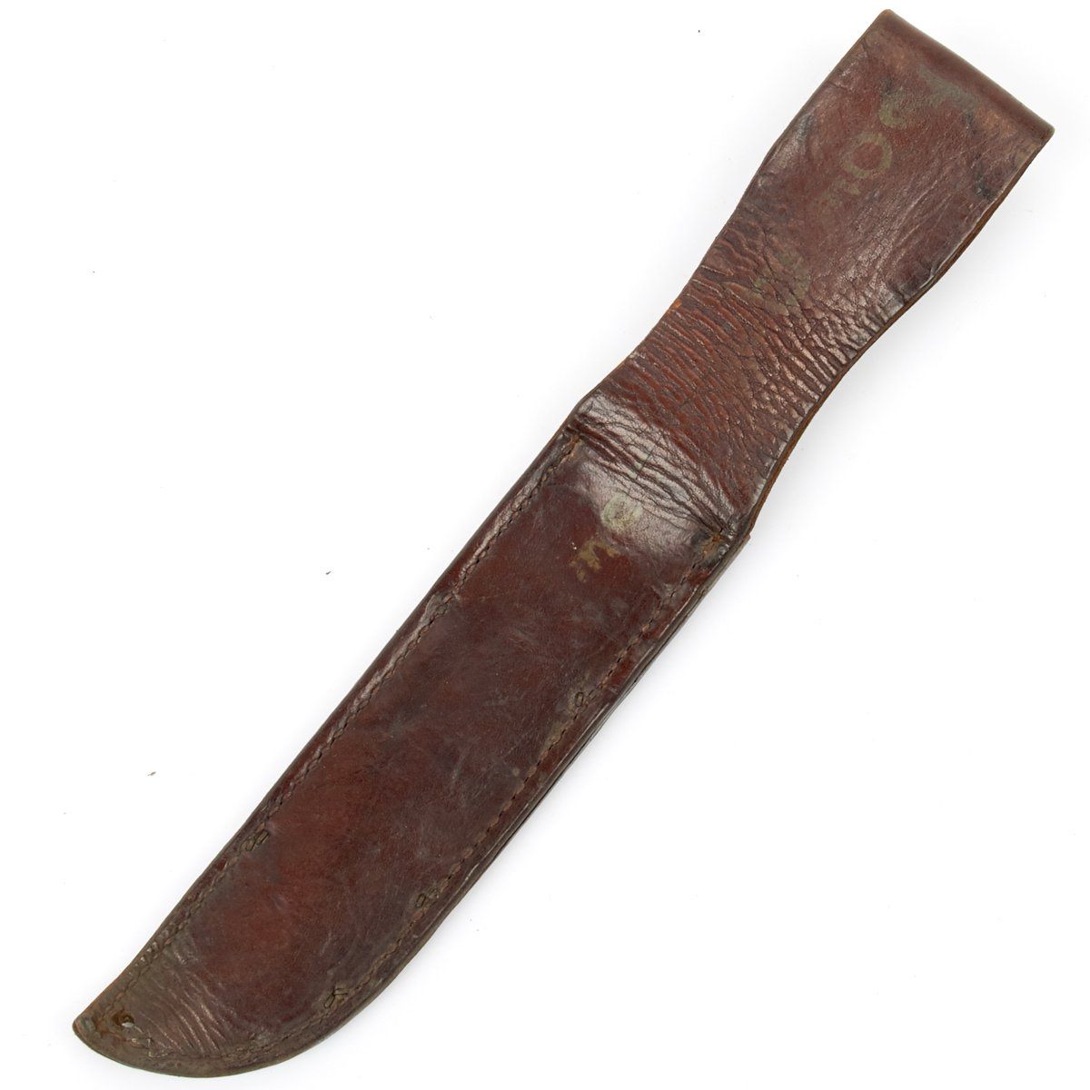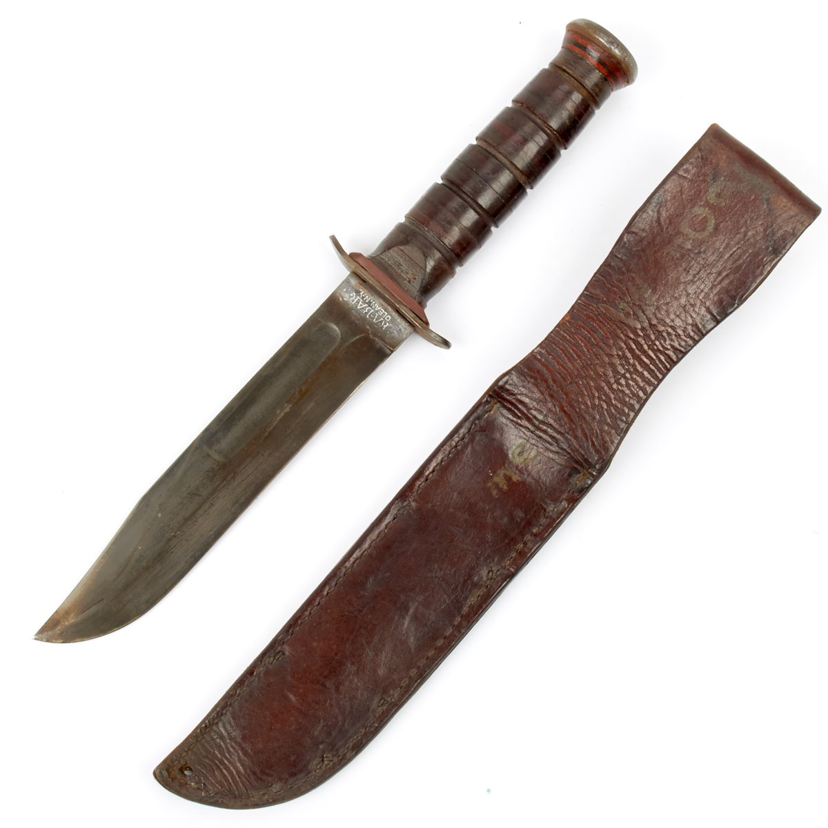 - Early War Red Spacer KA- BAR knife that is marked USMC JACK C. CRYAN 839522 in the fuller of the blade, as well as USMC on the right ricasso and on the other KA-BAR OLEAN. N.Y. The condition of the knife is excellent the blade still retains a razor sharp edges, the leather washer grip is in excellent condition as are the rare early red spacers used at both the top and bottom of the grip. Original leather sheath or scabbard is also in excellent condition, with the exception of a torn closure strap.