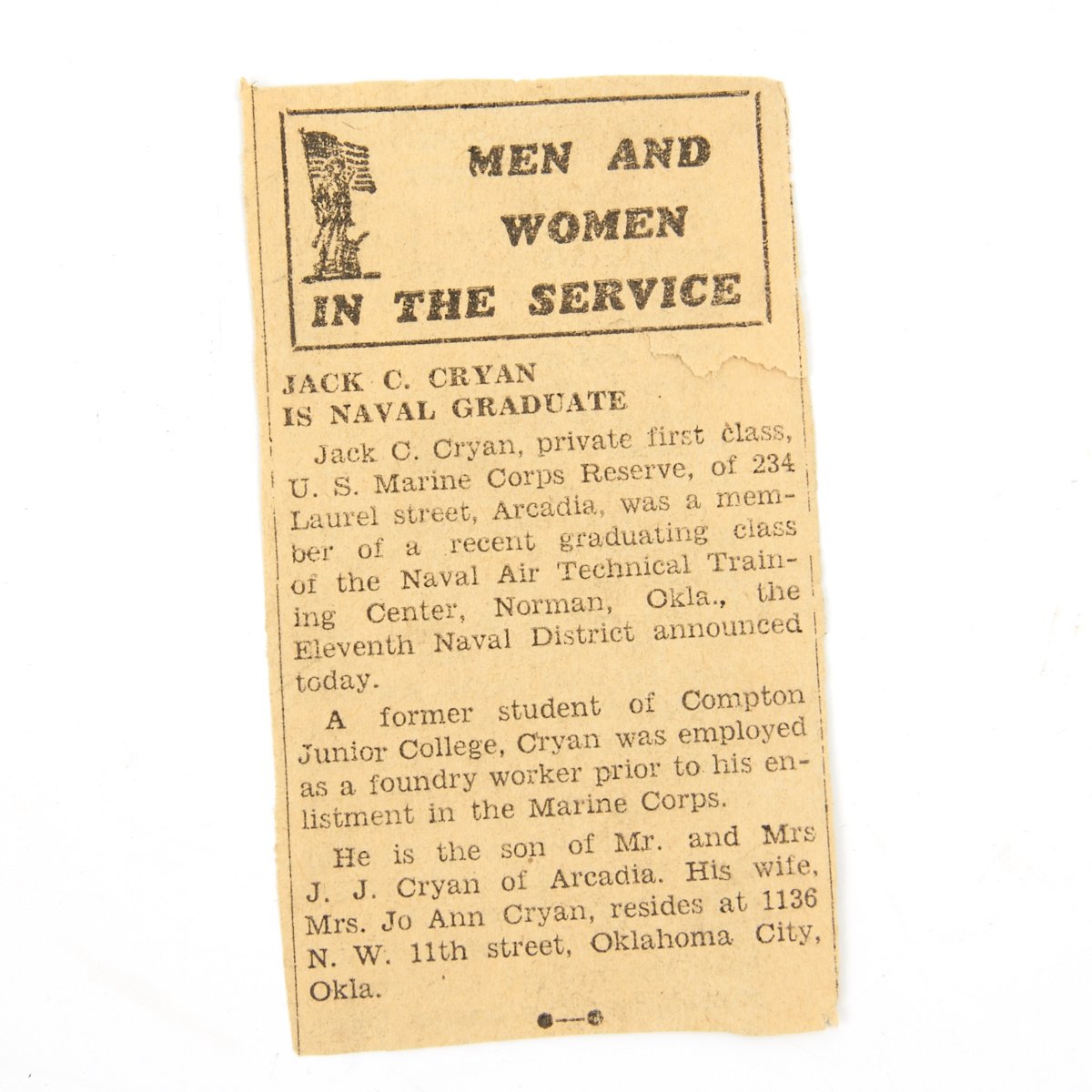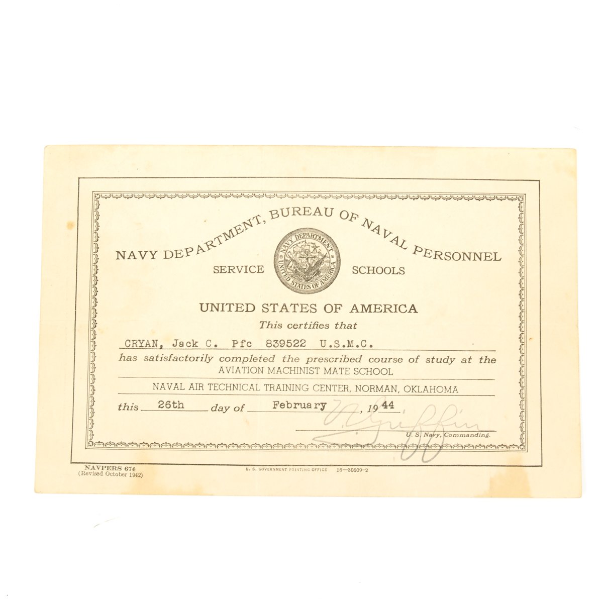 Original Items: One-of-a-kind set. USMC Sargent Jack C. Cryan USMC serial number 839522 was a member of the Marine Transport Squadron 252 (VMR-252) and as a flight mechanic participated in some of the most well known battles in the Pacific Theatre of WWII including the Mariana Islands (Air Raids) Awarded the Presidential Unit Citation, Iwo Jima (Sniper Fire & Banzi Charge), Luzon and the Battle of Okinawa (Air Raids & Sniper Fire) Awarded the Admirals Commendation.