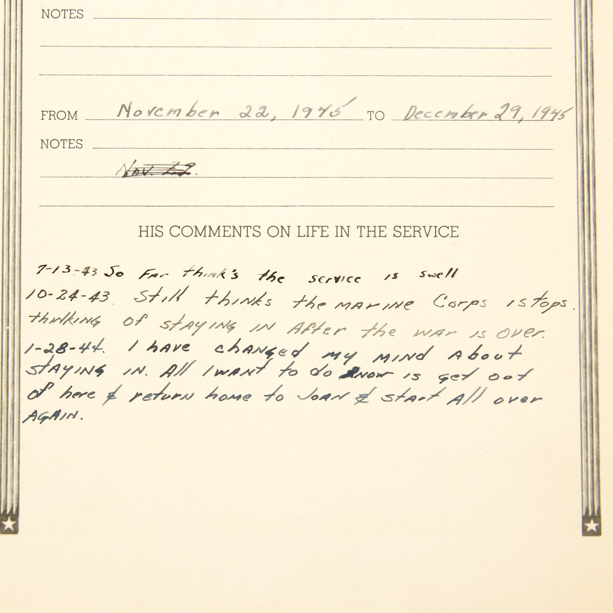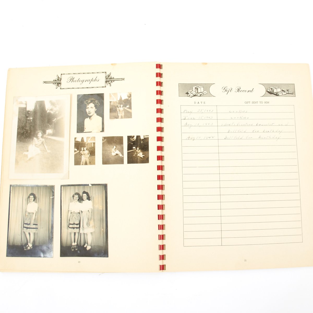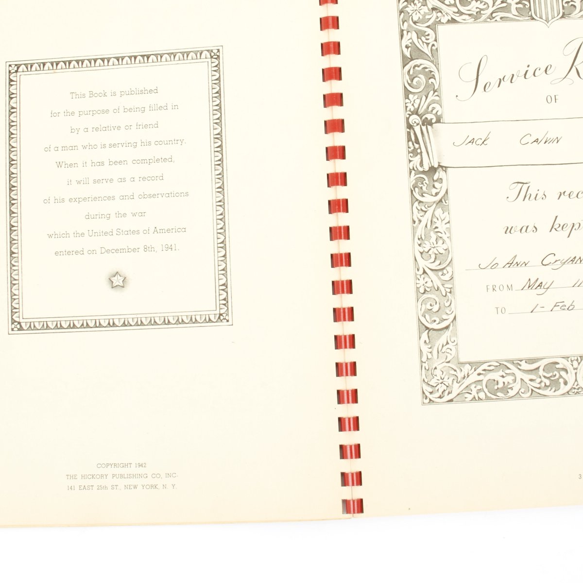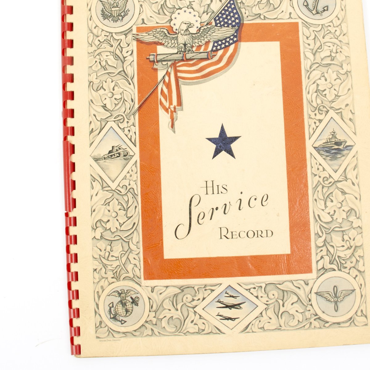 - Large “Service Record” book kept by his wife JoAnn Cryan dated Mayy 11, 1943 through February 1st, 1946. This book is also completely filled out, this acts like a diary/scrap book with dozens of photos of them both, notes, locations, battles, memories, anecdotes, new articles, etc.
