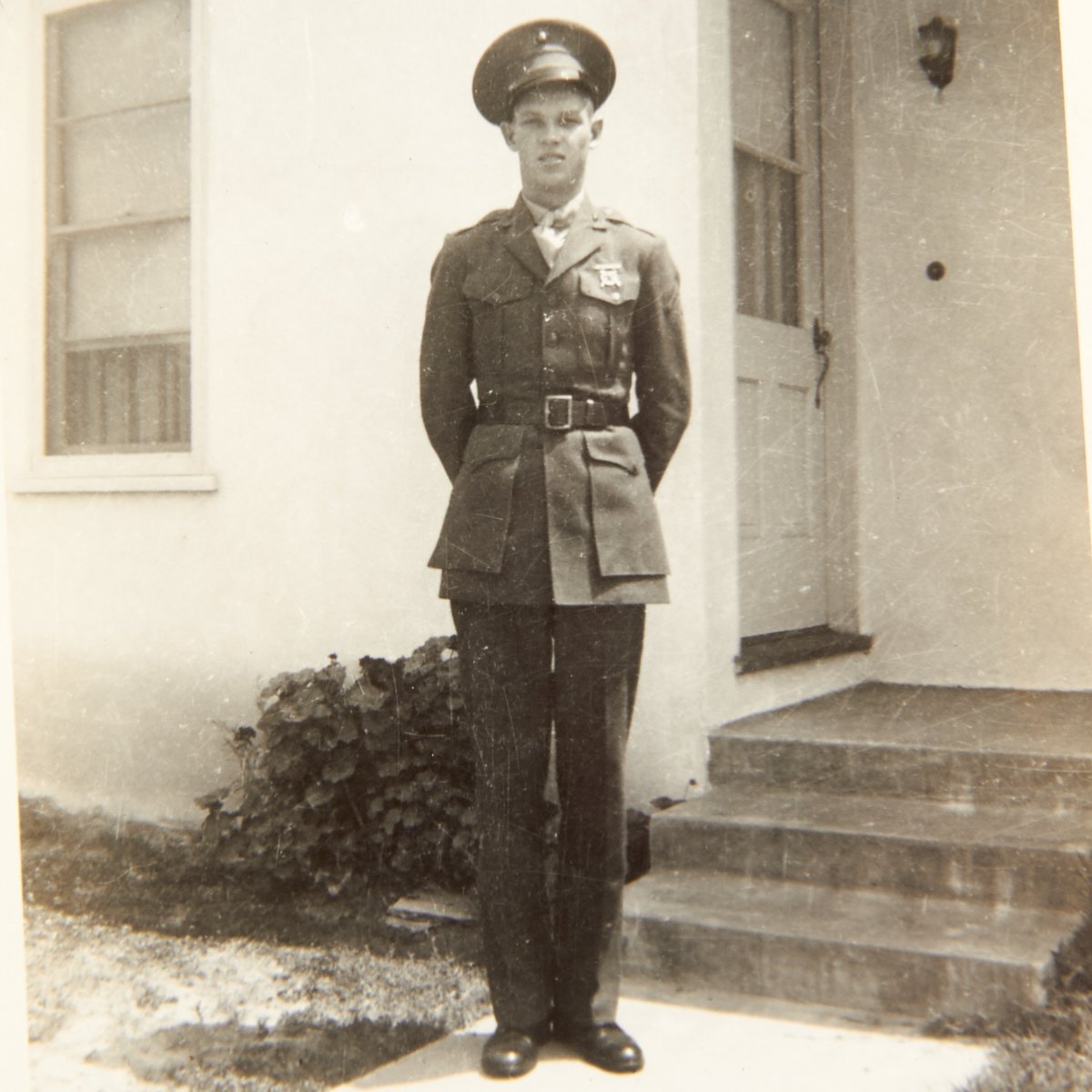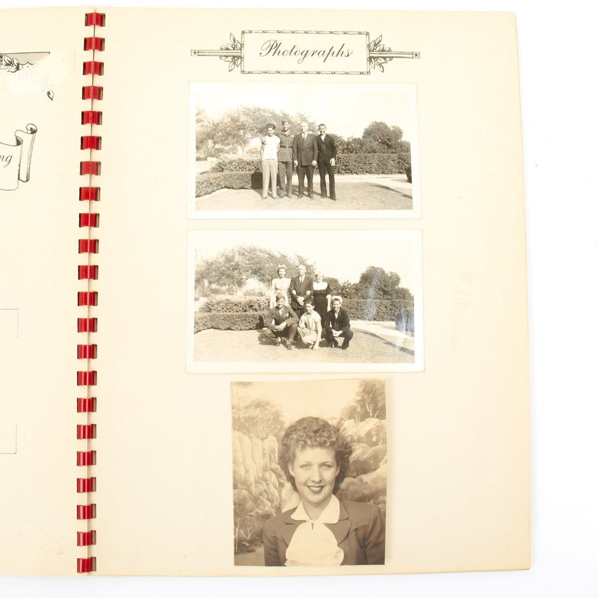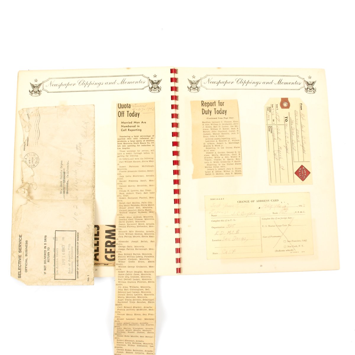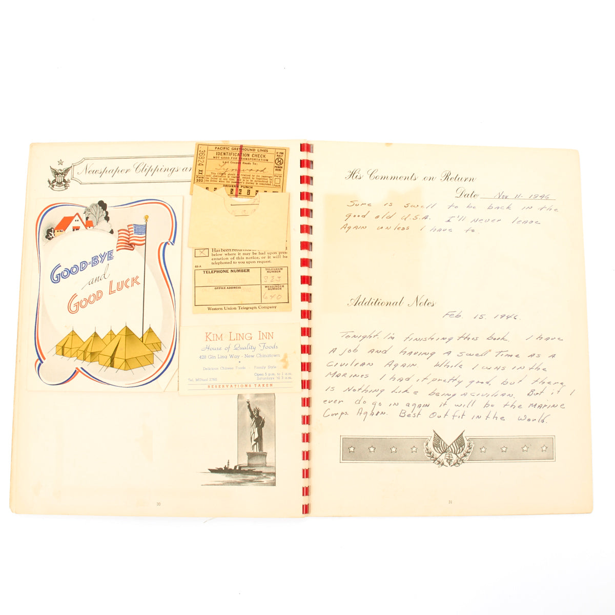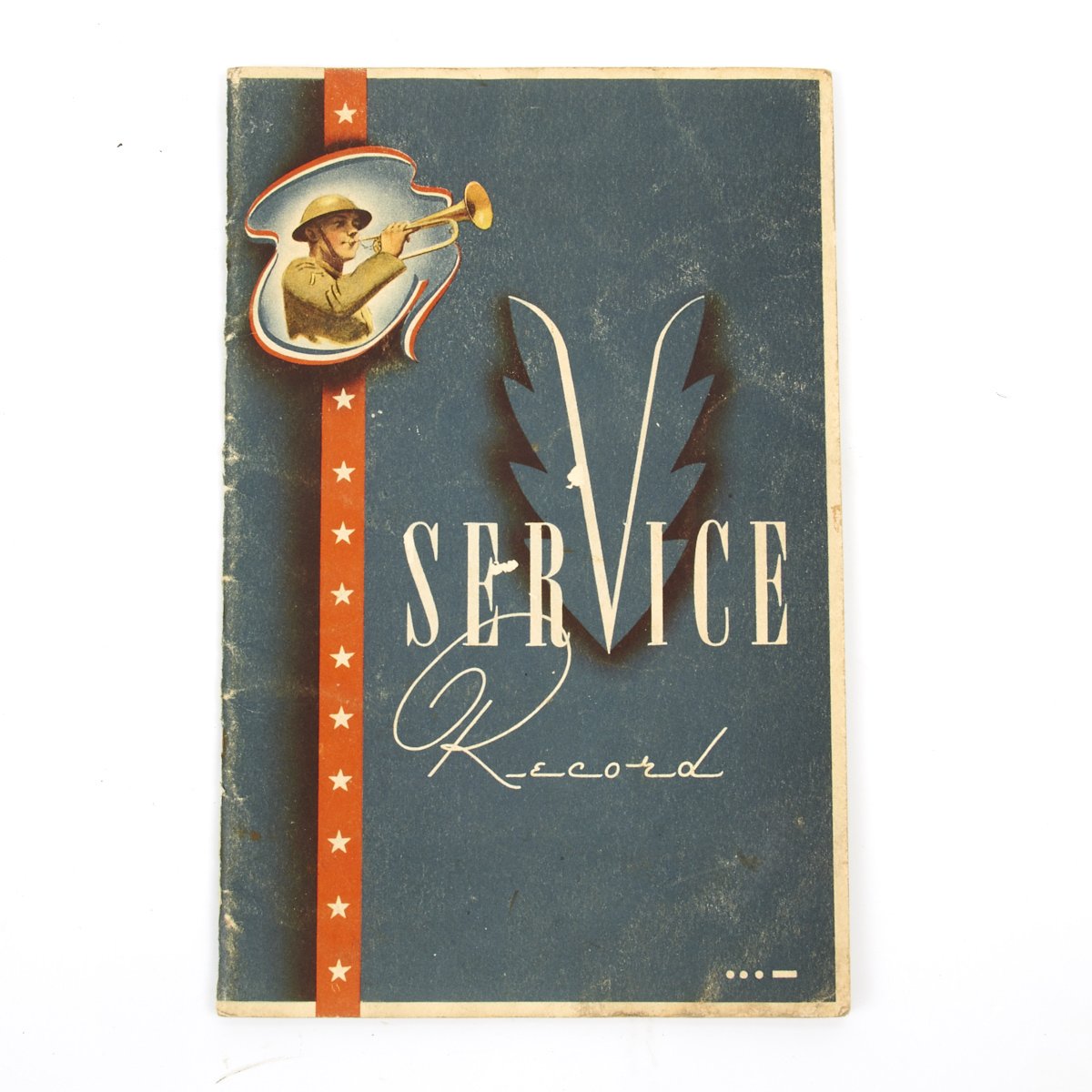 - Large “Service Record” book kept by his wife JoAnn Cryan dated Mayy 11, 1943 through February 1st, 1946. This book is also completely filled out, this acts like a diary/scrap book with dozens of photos of them both, notes, locations, battles, memories, anecdotes, new articles, etc.