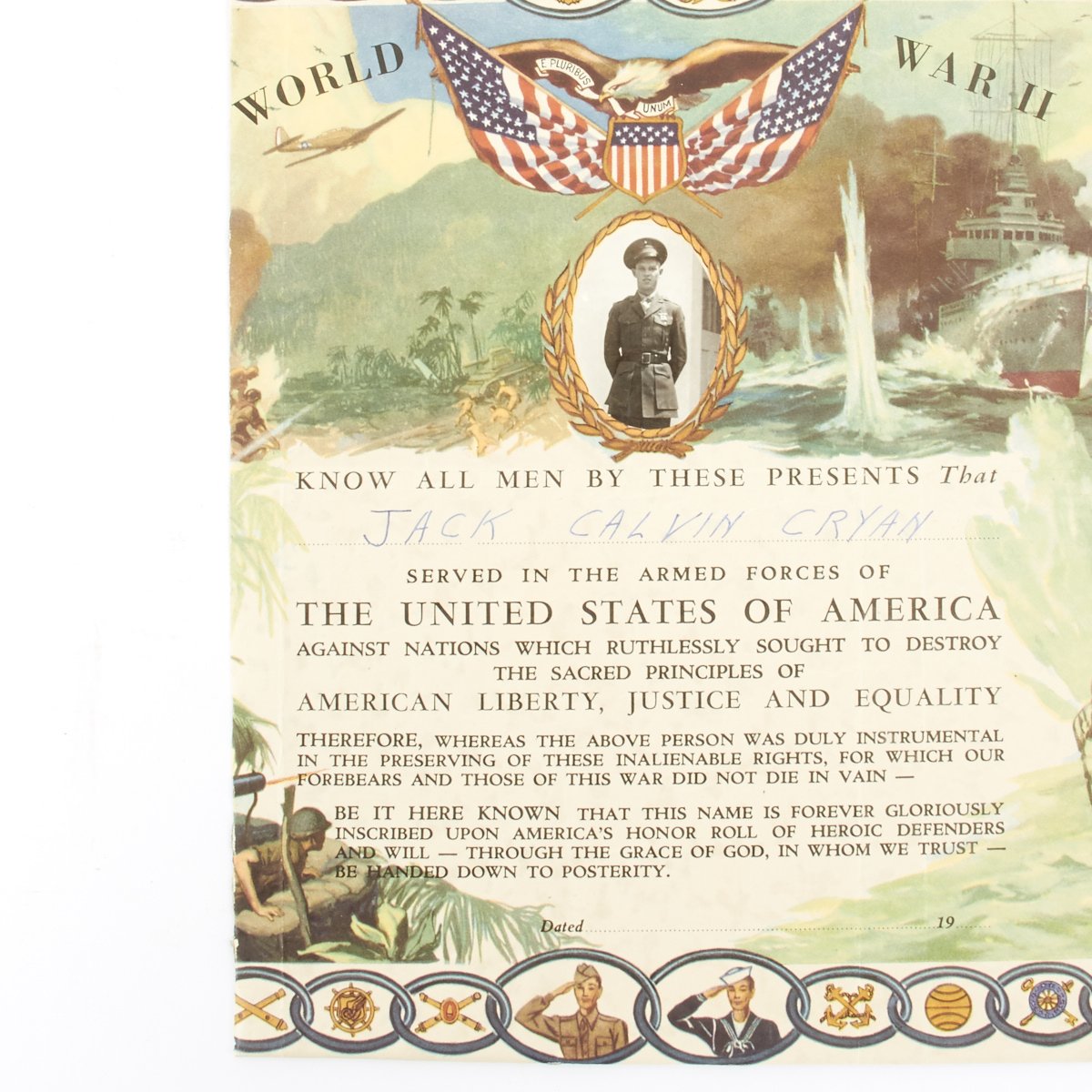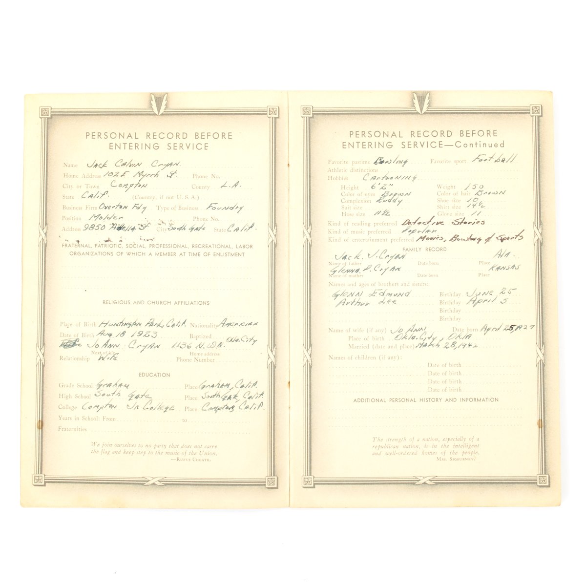 - Small “Service Record” book kept by Jack himself, that is completely filled out by CRYAN and documents the day of his indictment April 24, 1943, places visited, battles, memories, friends and so much more. One passage reads; “4-7-45 Still in 252. Am now on a Flight Crew. We fly all over the Pacific. Like my job swell. Best of anything I have done so far. But really looking forward to putting on civilian clothes once again for good.”